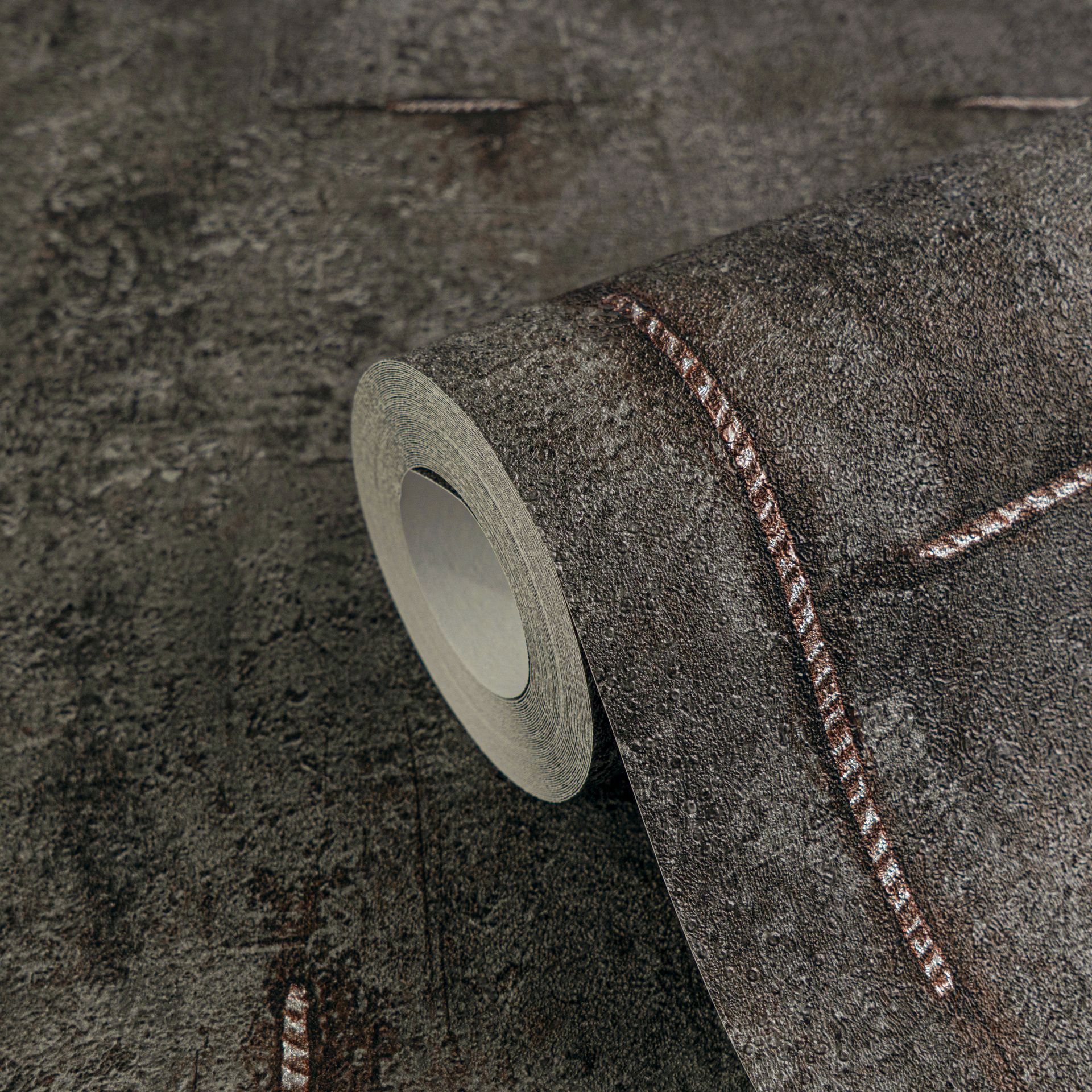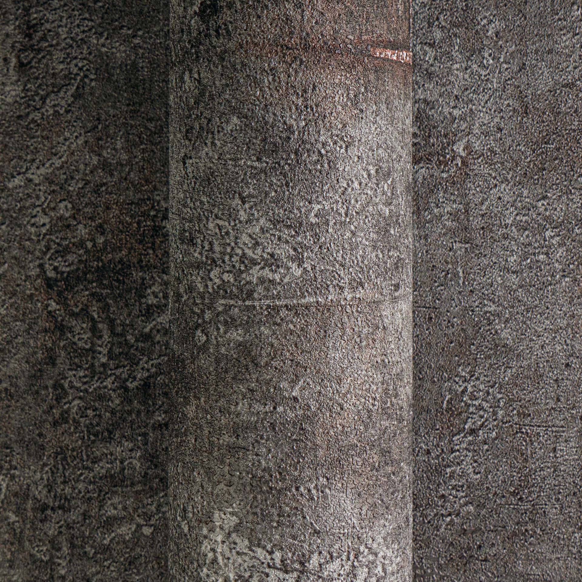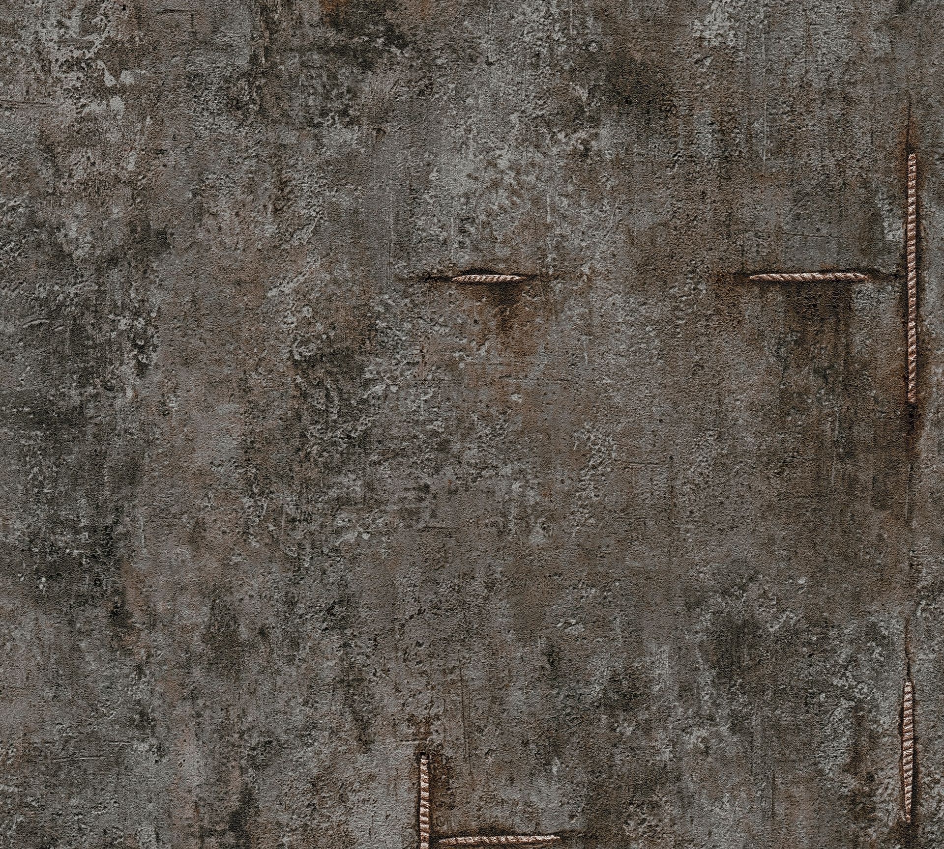 Diese Tapete überzeugt mit einer authentischen Betonoptik in dunklen Grautönen und markanten metallischen Nieten-Details. Die realistische Oberflächenstruktur verleiht Räumen einen robusten Industrial-Charakter mit urbanem Flair.
