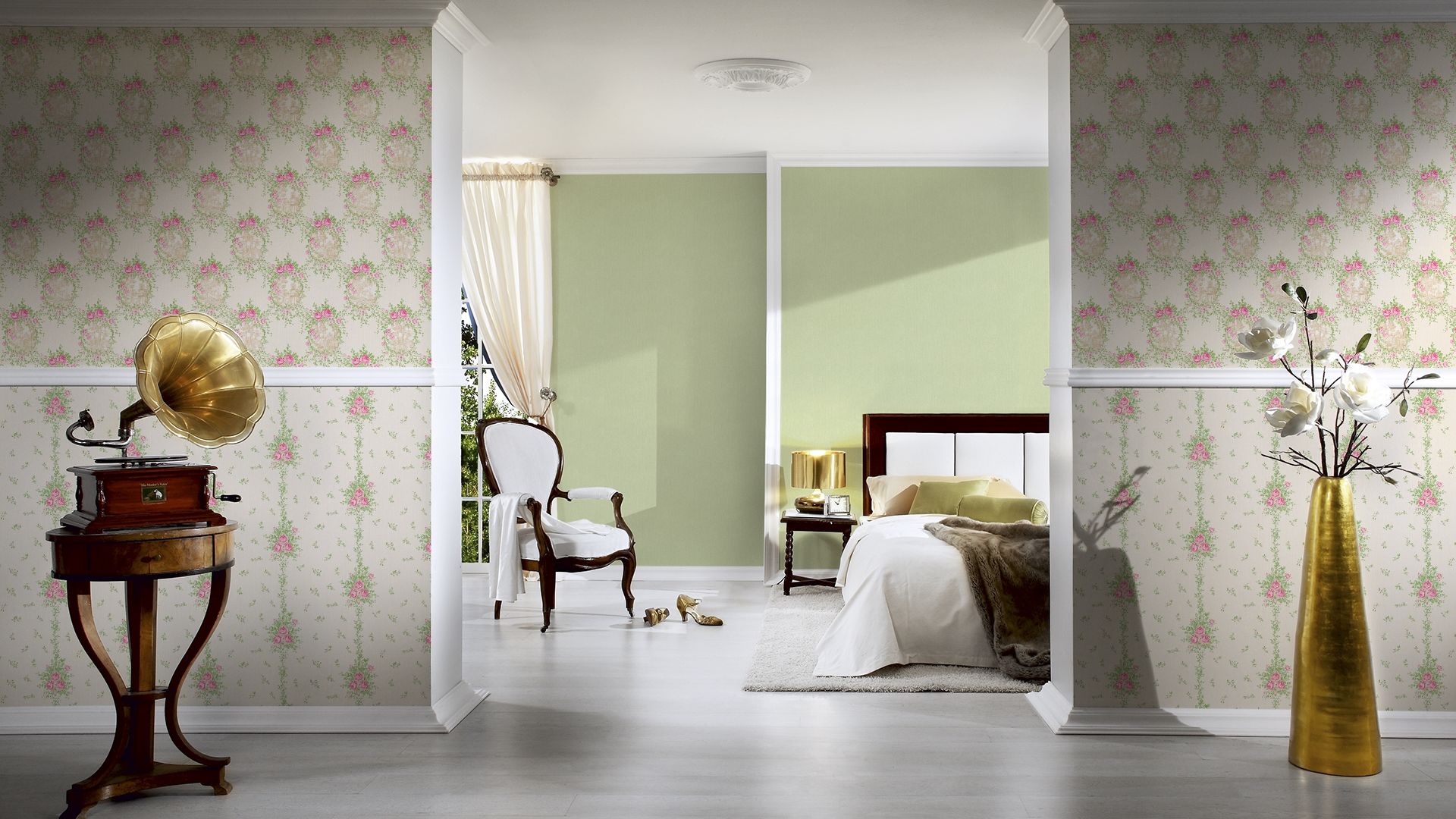 Großflächige Hintergründe, hochwertig auf Vlies/ Kompaktvinyl geprägt und in feiner Stoffstruktur gehalten, werden von den klassischen barocken Motiven geziert: detailreiche Blumen-Bouquets, fein ziselierte Kaskaden, Rosenranken, aber auch motivliche Darstellungen.