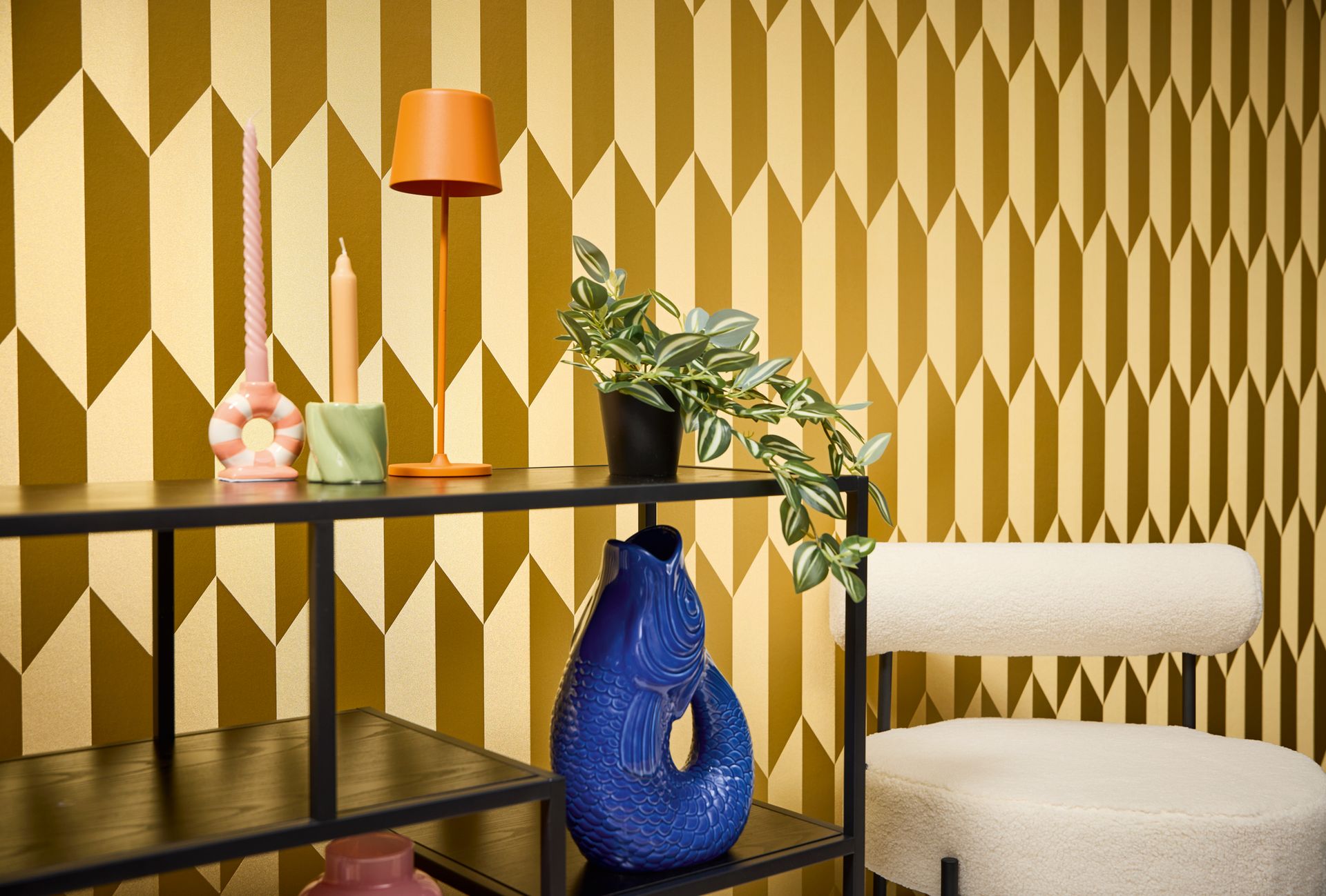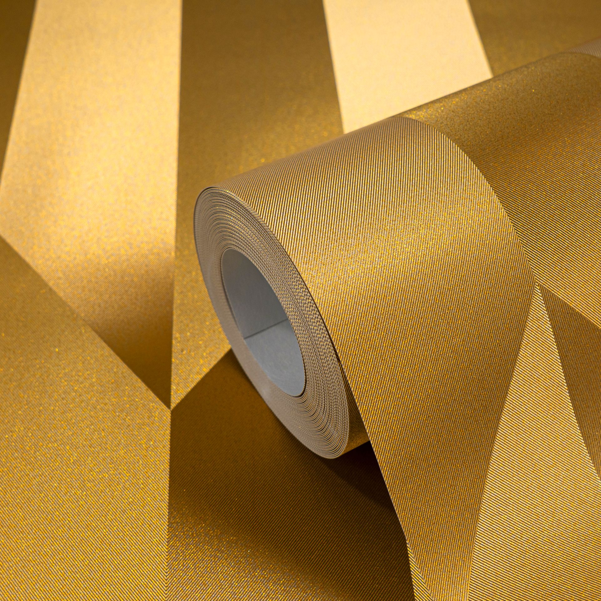 Diese elegante Tapete besticht durch ihr raffiniertes geometrisches Muster in warmen Goldtönen. Die dreidimensional wirkende Struktur aus Chevron-Elementen verleiht jedem Raum eine luxuriöse und moderne Ausstrahlung. Die verschiedenen Goldschattierungen erzeugen einen subtilen Metallic-Effekt, der das Licht spielerisch reflektiert.
