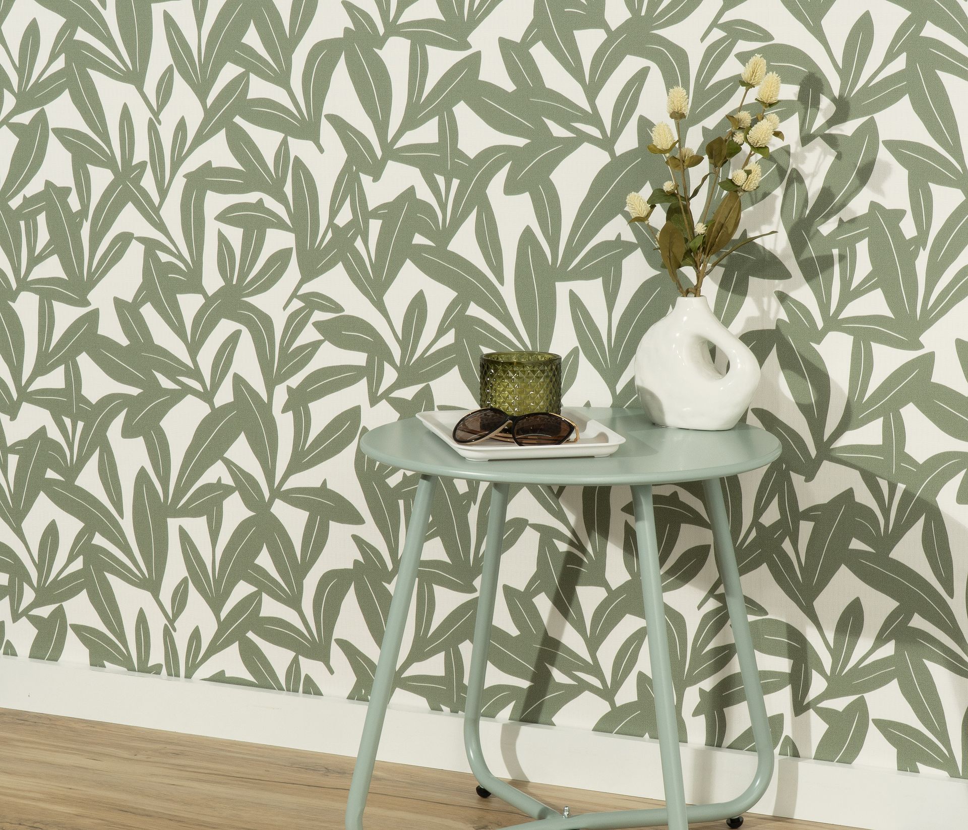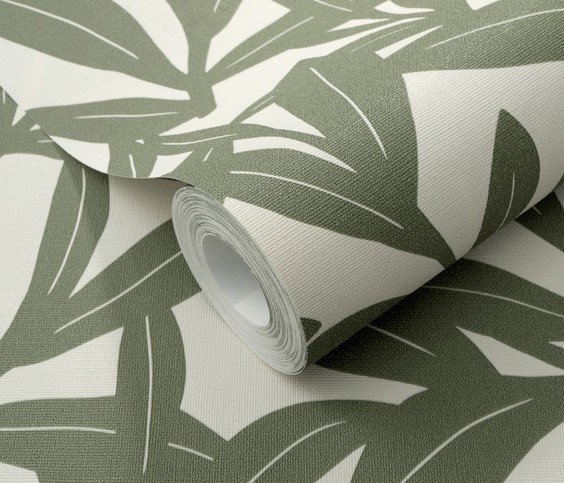 Die harmonische Farbkombination aus Olivgrün und Beige wirkt beruhigend und zeitlos zugleich. Das großflächige Blattmuster empfiehlt sich besonders als Akzentwand, um Räumen eine charakteristische Note zu verleihen, ohne zu dominieren. Die Leinenoptik unterstreicht den natürlichen Charakter des Designs und fügt eine haptische Dimension hinzu.