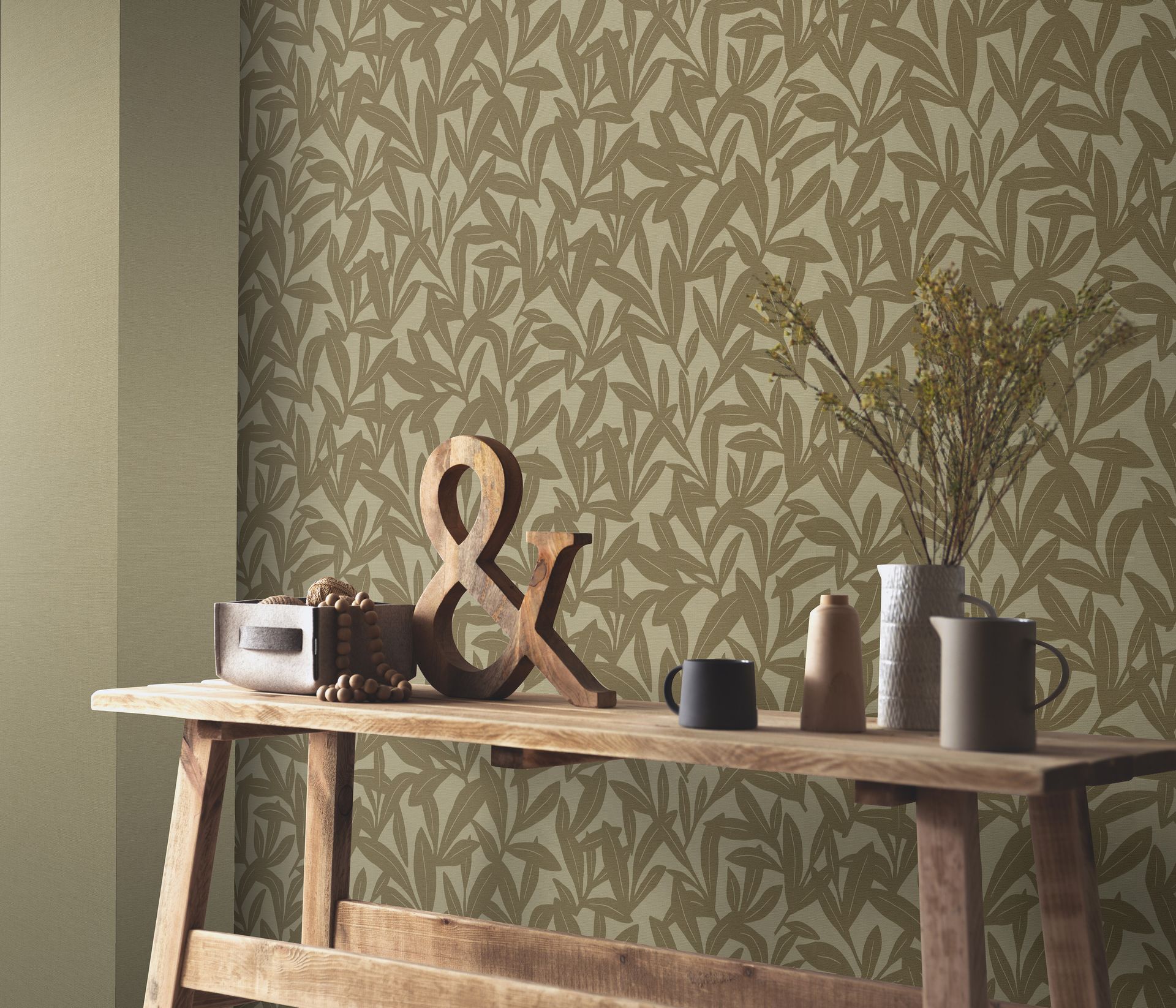 Diese botanische Tapete entführt mit ihren großflächigen Palmenblättern in eine entspannte Dschungelatmosphäre. Die Blätter überlagern sich in natürlicher Weise und schaffen durch ihre organischen Formen ein lebhaftes, dennoch beruhigendes Wandbild. Das Zusammenspiel von warmem Beige und gedämpftem Olivgrün verleiht jedem Raum eine naturverbundene, exotische Note.