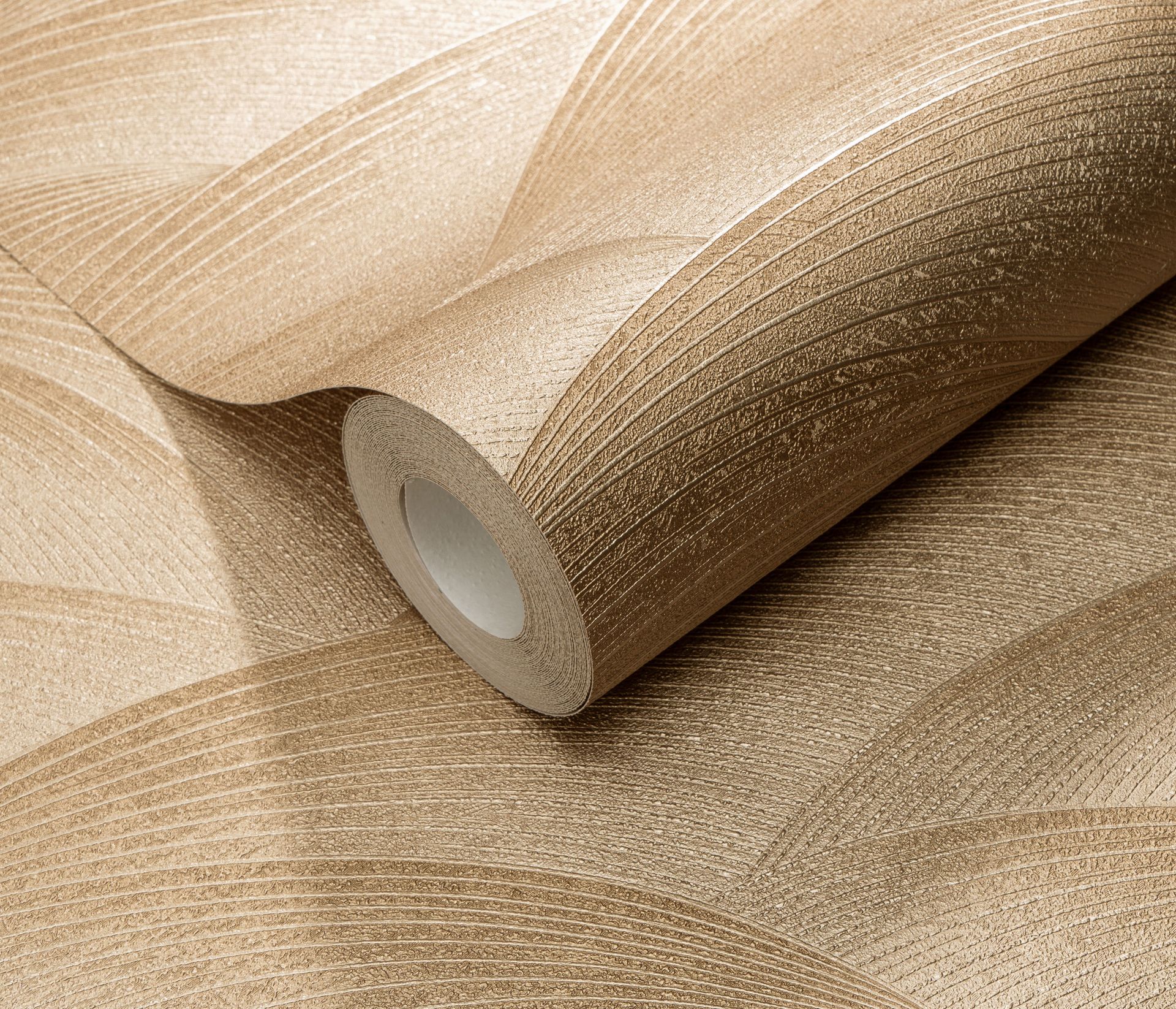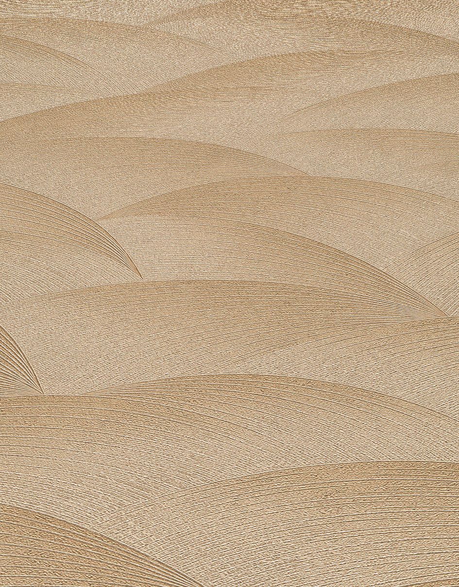 Diese elegante Tapete besticht durch ihr fließendes Wellenmuster, das an stilisierte japanische Wellen oder Sanddünen erinnert. Die überlagerten Bögen mit feinen Linienstrukturen erzeugen eine harmonische Tiefenwirkung und verleihen Räumen eine beruhigende, natürliche Atmosphäre. Der warme Beige-Goldton mit leichtem Metallic-Schimmer unterstreicht die hochwertige Anmutung und lässt die Wand elegant wirken.