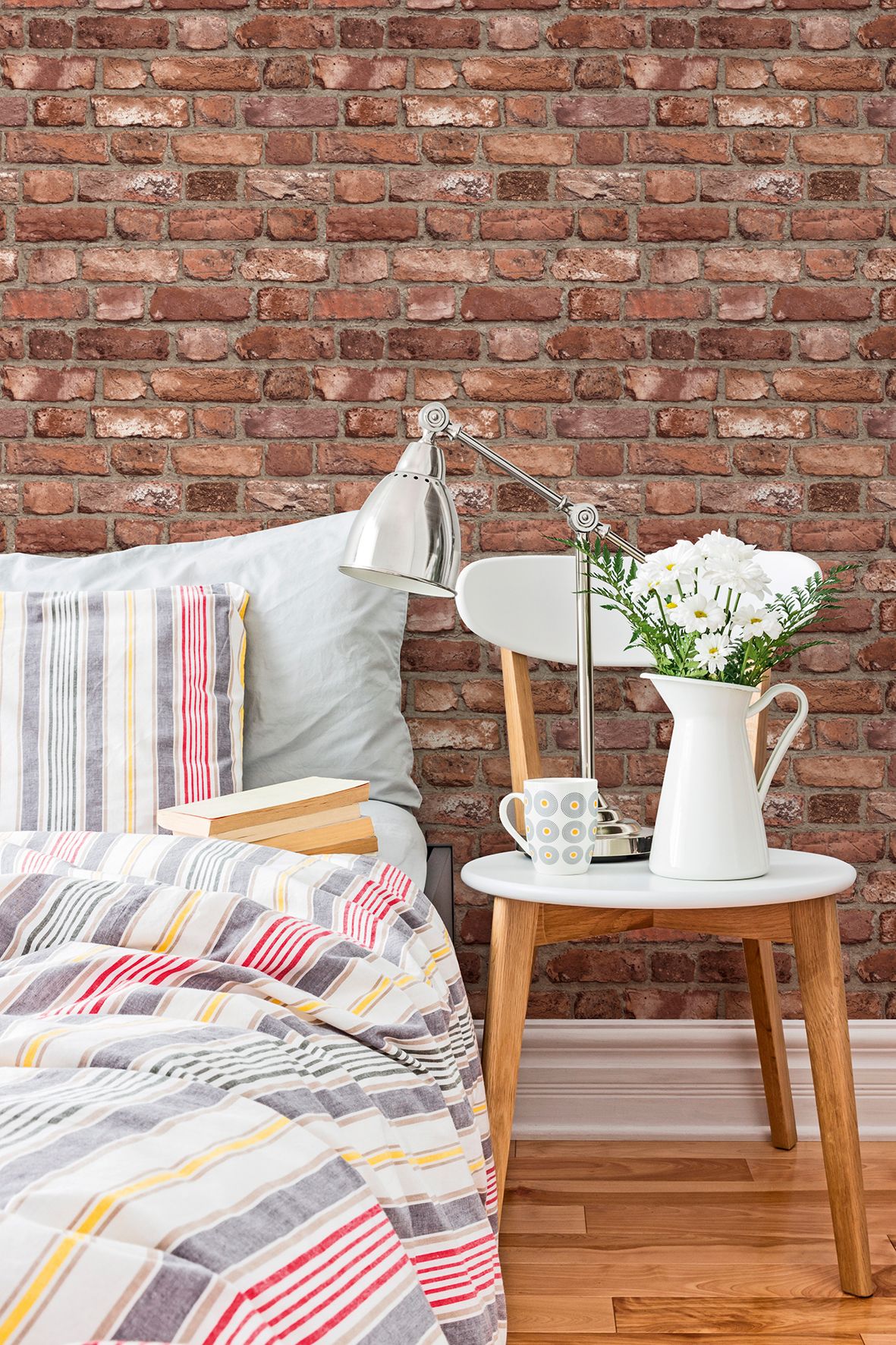 Diese realistische Backsteinmauer-Tapete bringt authentischen Industrial-Charme in moderne Wohnräume. Das detailgetreue Ziegelmuster in roter Farbgebung verleiht Räumen eine markante Loft-Atmosphäre mit urbanem Flair.