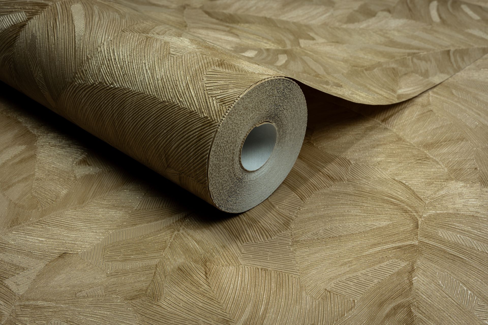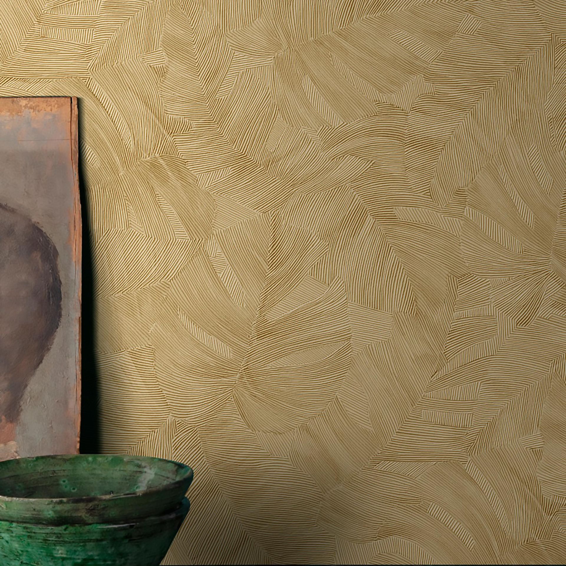 Die warme Farbpalette in Beige und Gold-Tönen wirkt zeitgemäß und hochwertig. Das mittelteilige Strukturmuster erzeugt eine beruhigende Raumatmosphäre mit diskretem visuellen Interesse – weder aufdringlich noch zu minimalistisch. Die Kombination aus klaren Linien und subtil fließenden Flächen vermittelt einen modernen, eleganten Look.