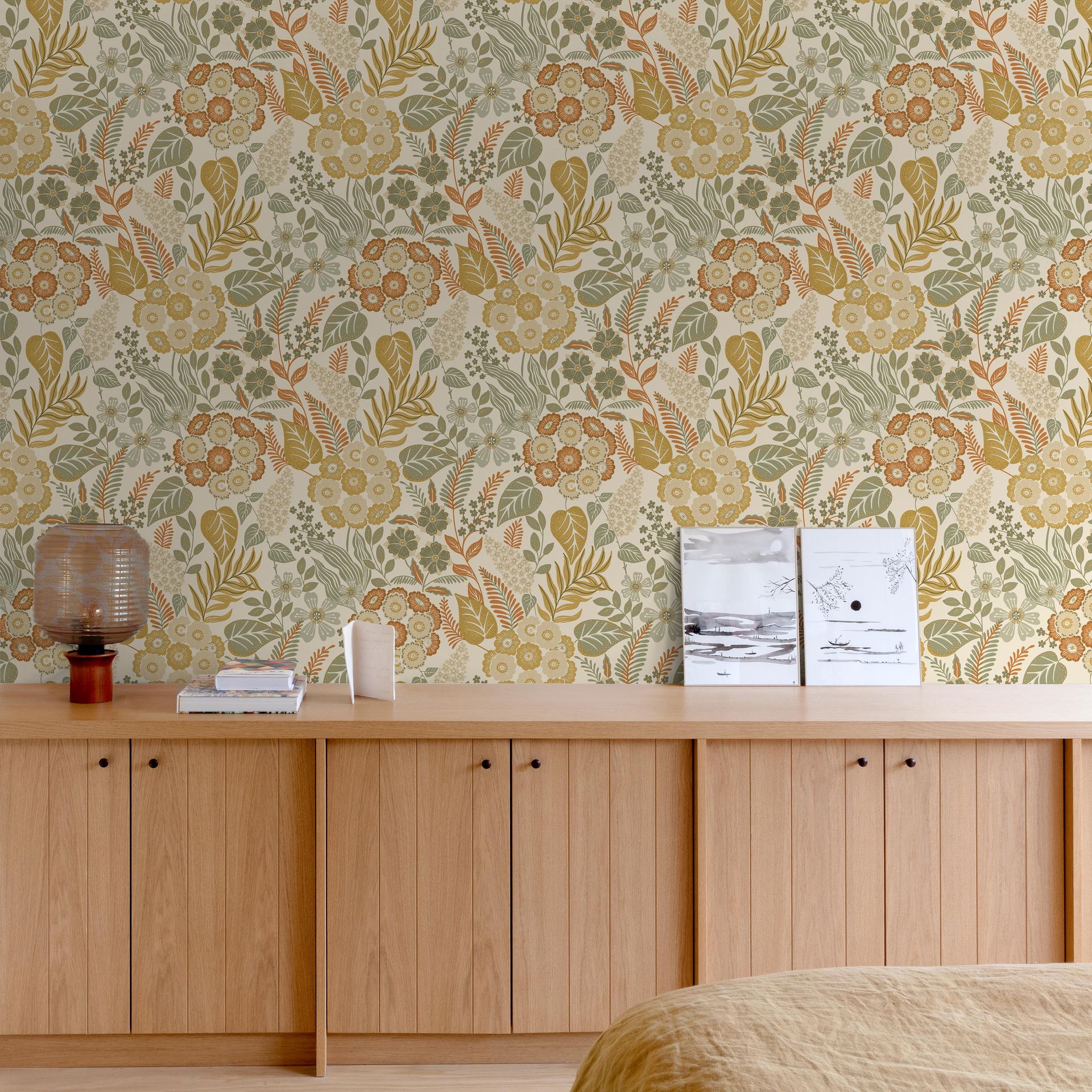 Die Farbgebung in Beige, Grün und Terrakotta erzeugt eine warme, erdige Atmosphäre, die sich harmonisch in verschiedene Wohnräume integriert. Das ungerichtete MusterLayout und die gemäßigte Musterdichte machen diese Tapete vielseitig einsetzbar – sowohl als geschlossene Wandgestaltung als auch als ruhige Akzentwand. Die botanische Formensprache verleiht jedem Raum eine natürliche Eleganz.