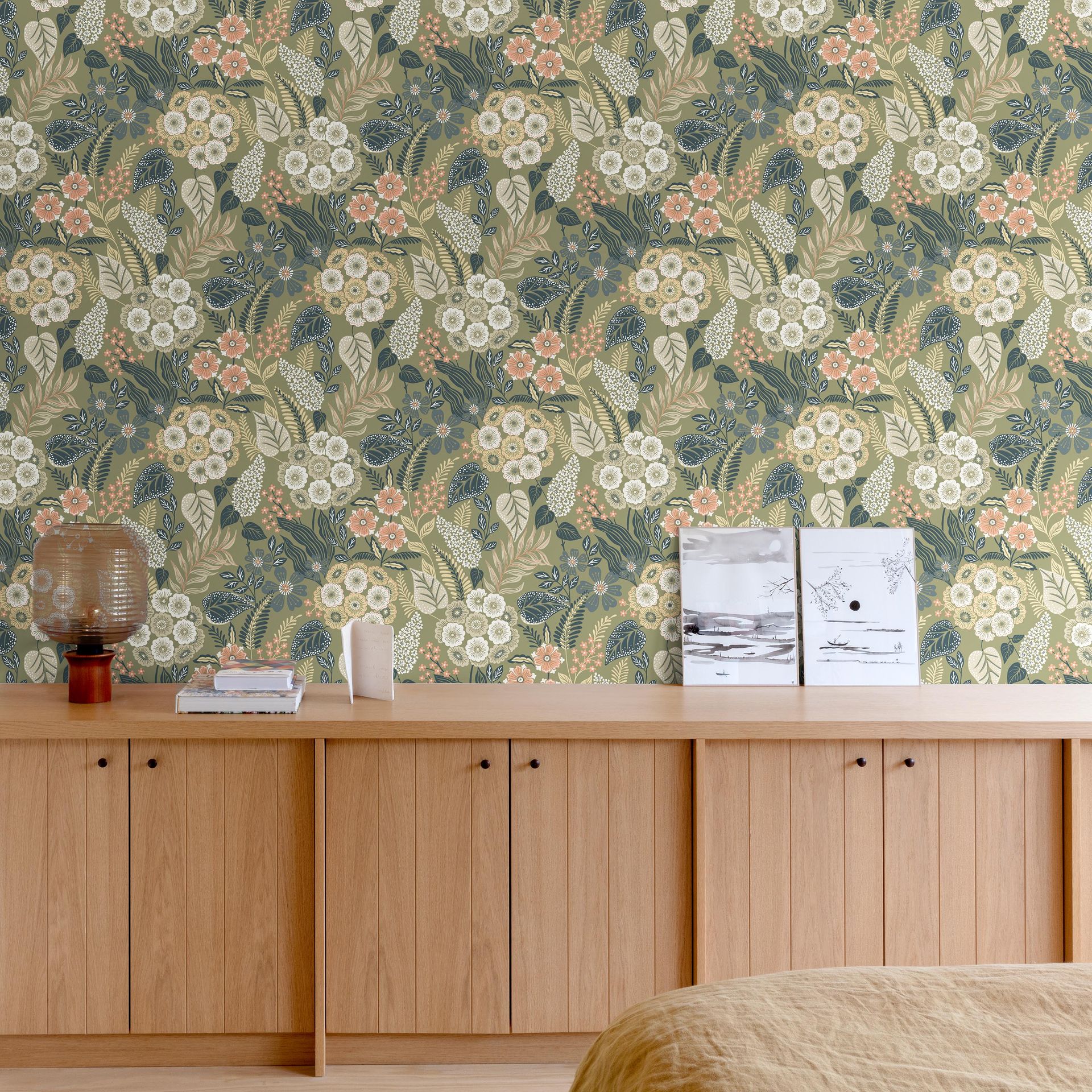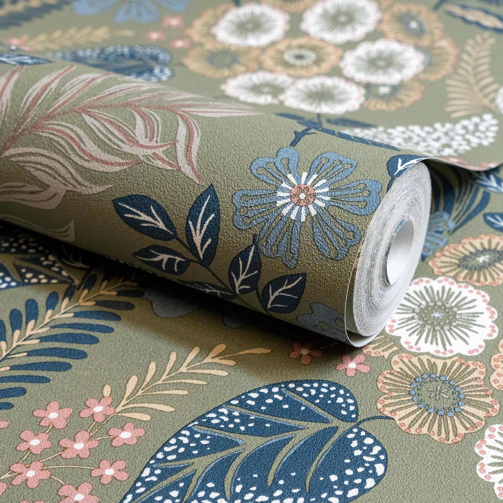 Die Farbpalette wirkt gedämmt und elegant: Das Graugrün der Grundfläche bildet einen ruhigen Hintergrund, während die kühle Dunkelblau-Familie und warme Rosa-Pastelltöne subtile Tiefe erzeugen. Das großflächige Blumenmuster und die vielfältige botanische Motivik schaffen eine beruhigende, naturnahe Raumatmosphäre. Die Tapete eignet sich ideal für die Gestaltung ganzer Räume mit naturfreundlicher Einrichtung oder als stimmungsvolle Akzentwand in Wohnzimmer, Schlafzimmer, Flur oder Esszimmer.