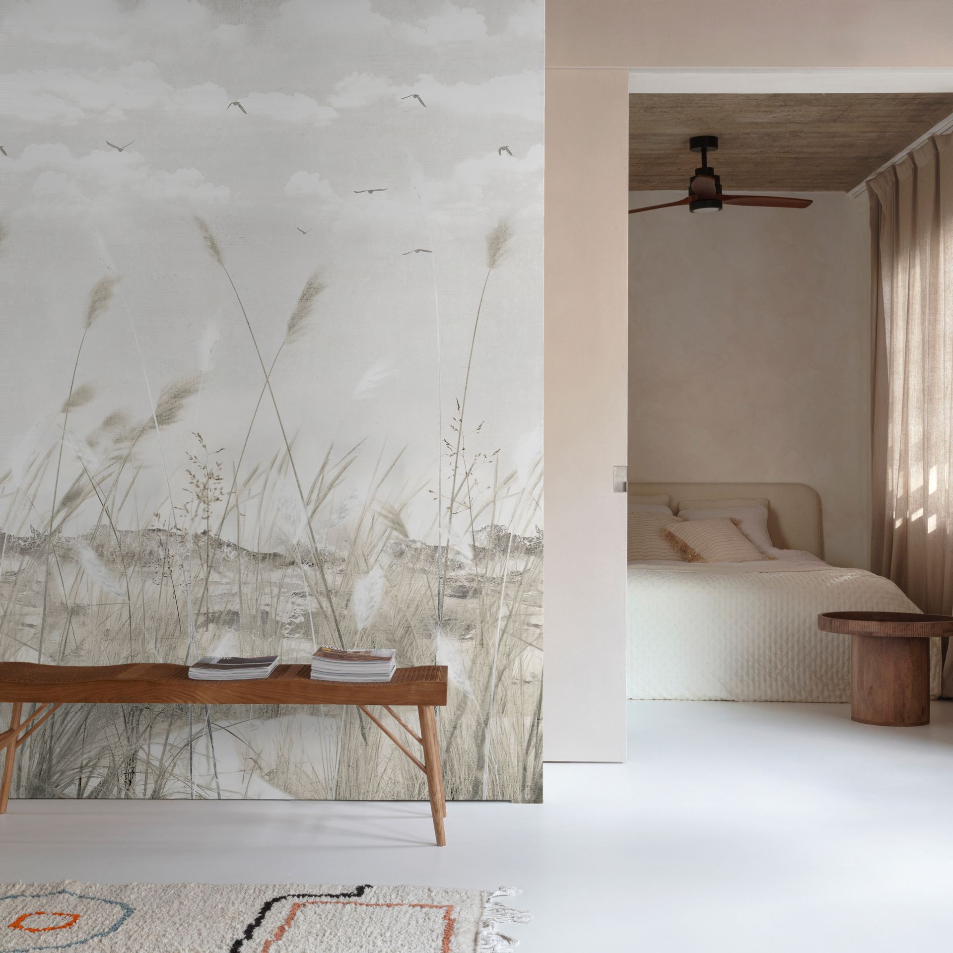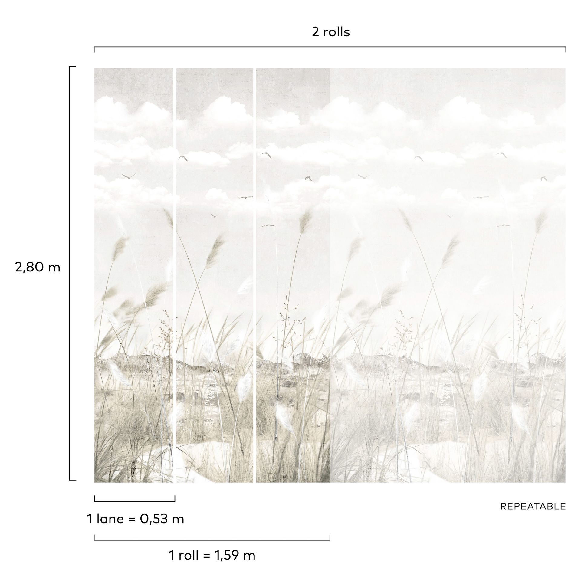 Diese Landschaftstapete präsentiert eine durchdachte Komposition aus drei visuellen Ebenen: Ein nuancierter grauer Himmel im Oberbereich, eine mittlere Zone mit weißen Wolken und fliegenden Vögeln, sowie eine detailreiche Strandgras-Vegetation im unteren Bereich in Grautönen und Beige. Die botanischen Formen wirken organisch und natürlich, ohne dabei ornamental überladen zu erscheinen.