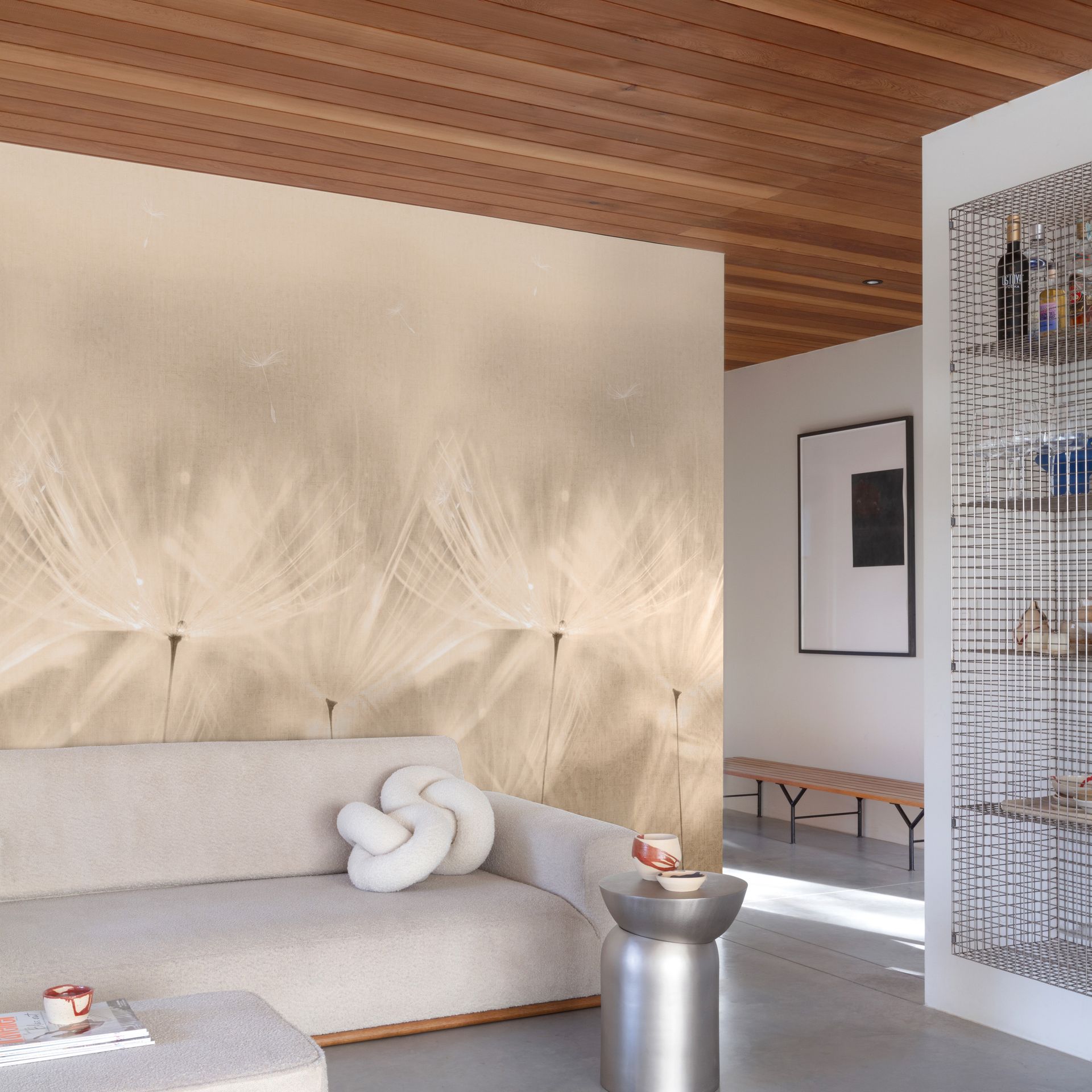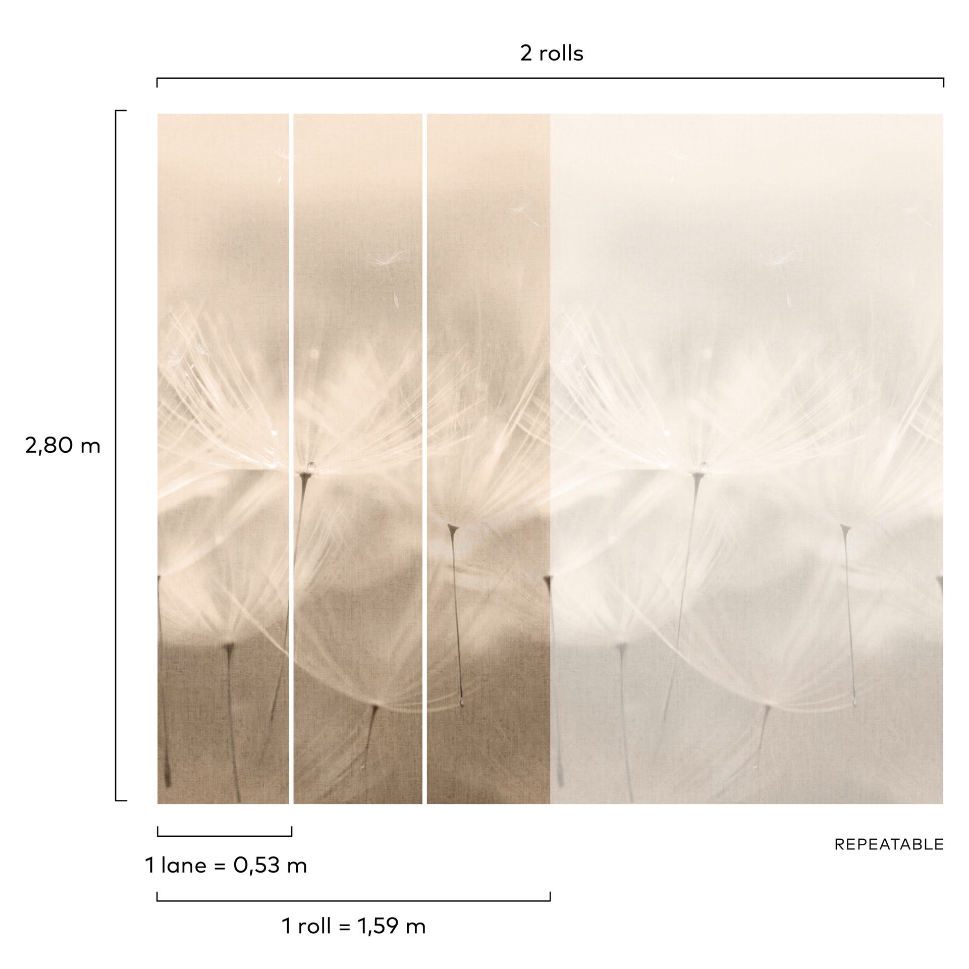 Das großflächig komponierte Motiv wirkt ruhig und harmonisch, während die feinen Linienzeichnungen der Pusteblumen dezent Struktur in den Raum bringen. Die Farbpalette aus warmem Beige, zartem Grau und Taupetönen schafft eine beruhigende Raumatmosphäre, die sich flexibel in verschiedene Einrichtungsstile integriert. Besonders als Akzentwand in Schlaf- oder Wohnzimmern entfaltet sie ihre volle Wirkung.