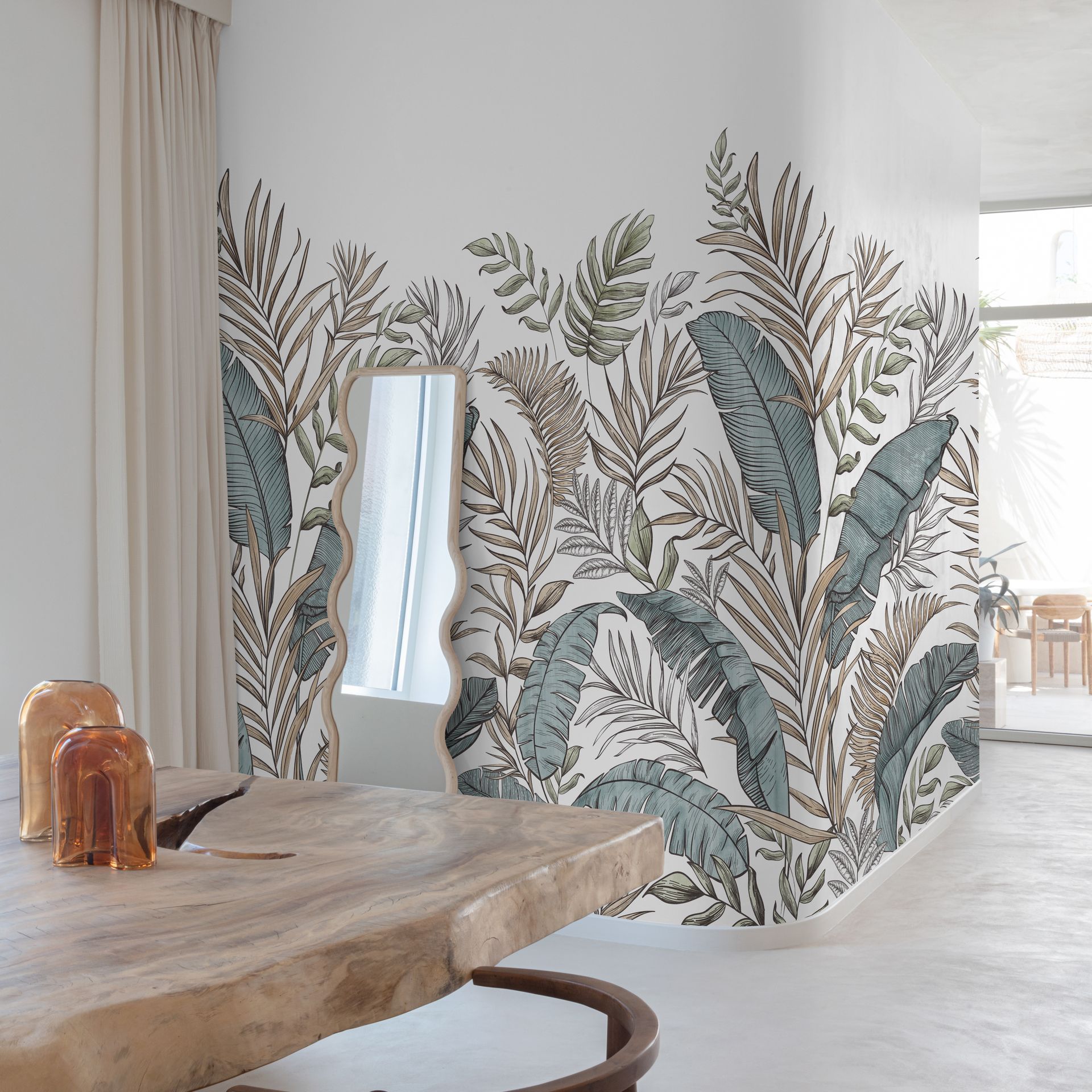 Die ruhige Farbpalette in Grau, Blaugrün und Beige auf hellem Grund erzeugt eine beruhigende Naturatmosphäre, die Räume optisch vergrößert. Die feinen Linienzeichnungen verleihen dem Design Eleganz und Raffinesse. Diese Tapete eignet sich besonders als Akzentwand oder vollflächige Wandgestaltung in Wohnzimmern, Schlafzimmern und Flurräumen.