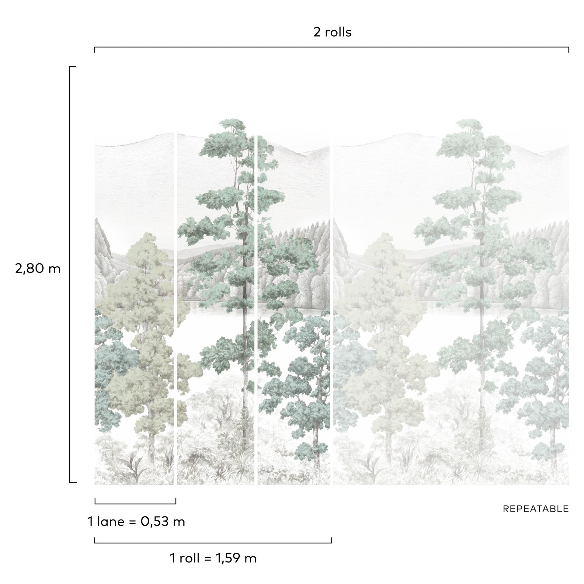 Diese elegante Tapete präsentiert eine malerische Waldlandschaft mit detaillierten Baumdarstellungen in feinen Grün- und Grautönen. Die Komposition zeigt eine mehrdimensionale Perspektive mit Bäumen verschiedener Größen, die eine ruhige, naturnahe Szenerie schaffen. Ein dominanter Baum in der Bildmitte zieht den Blick an, während weitere Bäume, Hügel und ein sanfter Wasserlauf die Tiefenwirkung verstärken.
