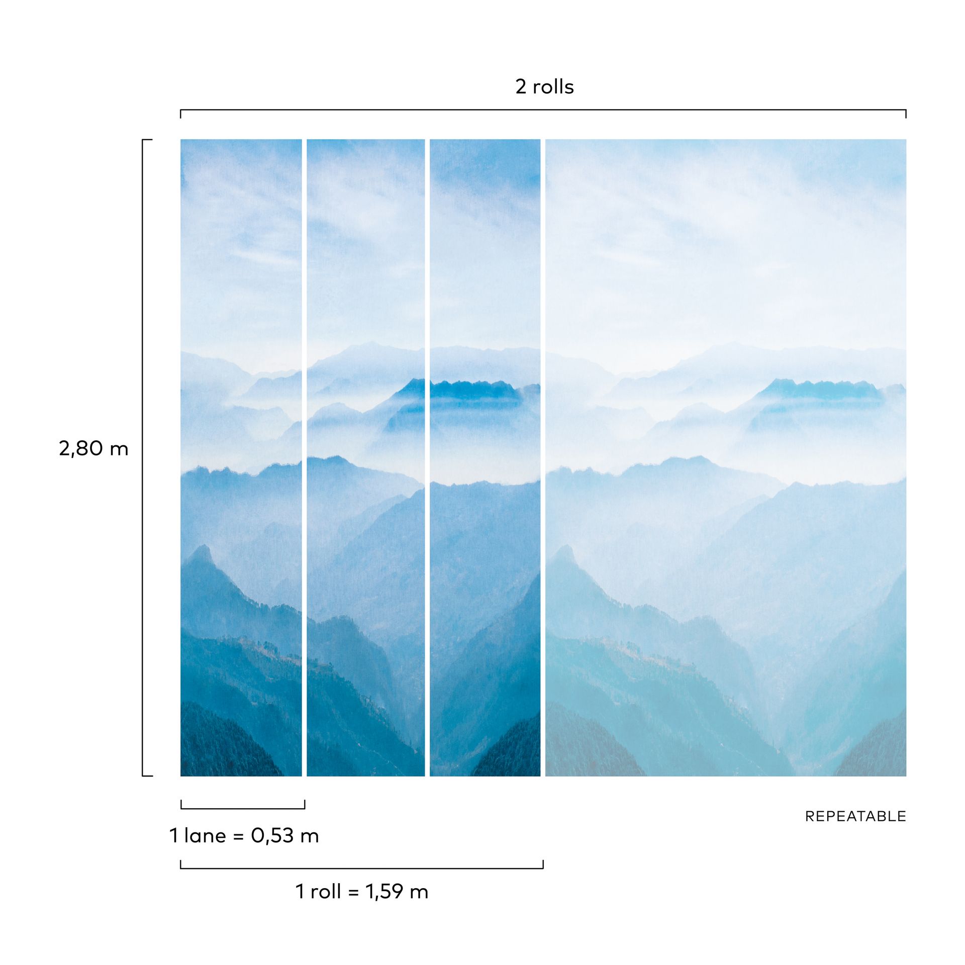 Diese moderne Landschaftstapete zeigt eine eindrucksvolle Szenerie neblig überlagernder Bergketten. Die Komposition arbeitet mit feinen Blau- und Weißtönen, die von einem klaren Himmel oben zu tieferen Blaunuancen unten übergehen. Der atmosphärische Charakter entsteht durch sanfte Farbverlauf und die Luftperspektive, die Tiefe und Ferne suggeriert.