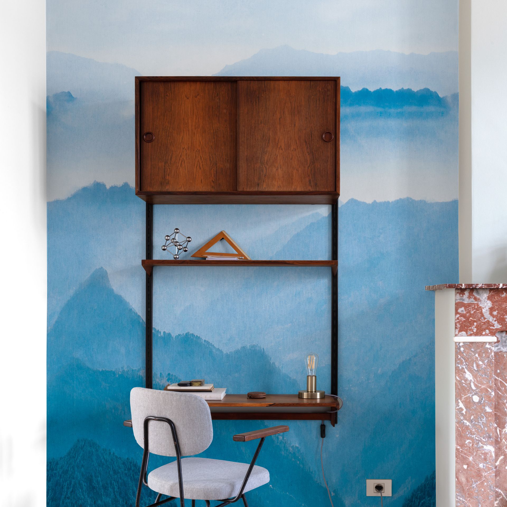 Die Gestaltung wirkt beruhigend und kontemplativ, ohne dabei kitschig zu wirken. Die dezente Darstellung der Bergsilhouetten schafft ein modernes, zeitloses Ambiente. Besonders geeignet für Schlafzimmer, Wohnzimmer oder Flur – hier entfaltet sie ihre entspannende Wirkung optimal. Als Akzentwand oder für den kompletten Raum einsetzbar, je nach gewünschter Intensität.