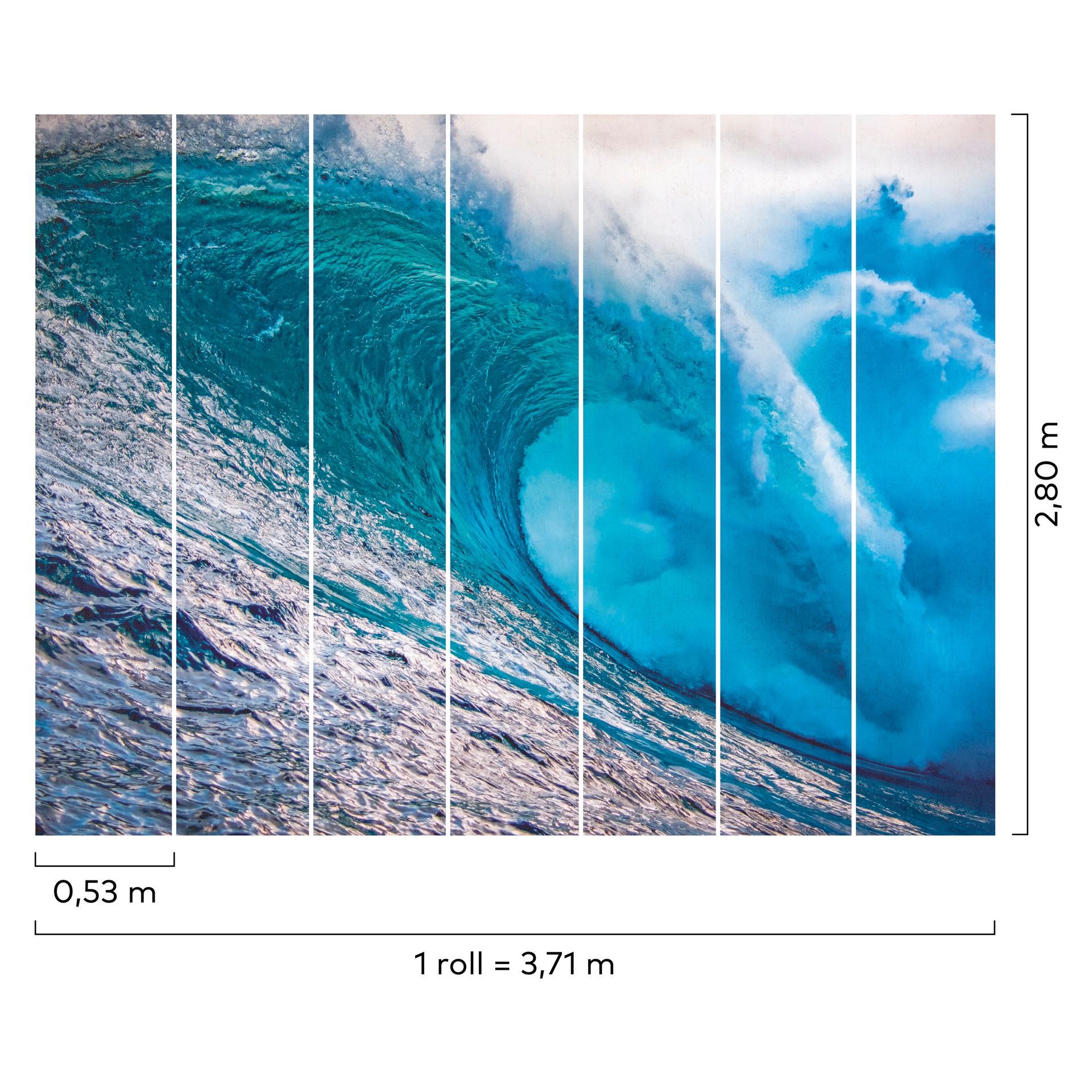Diese beeindruckende Wellen-Tapete zeigt ein fotorealistisches Ozean-Motiv mit einer großflächigen, dynamisch gekrümmten Welle als Hauptelement. Die Komposition kombiniert intensive Türkis- und Blautöne mit Weiß und schafft dadurch eine kraftvolle, energetische Raumwirkung mit hohem visuellen Eindruck.