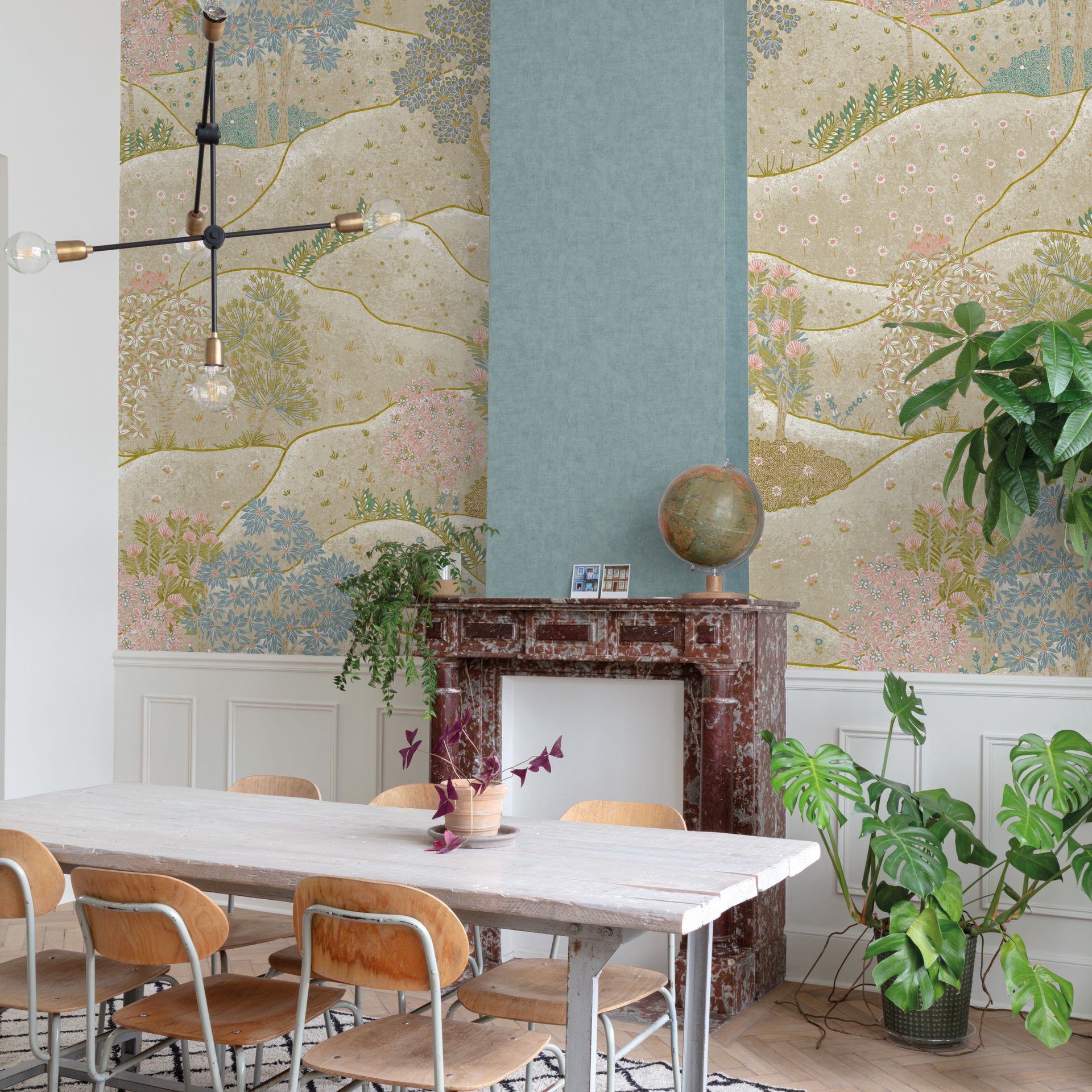 Diese botanische Tapete beeindruckt durch ihre harmonische Komposition gestaffelter Wellenbänder, die mit feinen Blütenmotiven gefüllt sind. Das Design kombiniert naturnahe Blumenmuster in zartem Blau, Rosé und Grün auf einem cremefarbenen Untergrund und schafft eine ruhige, organische Raumwirkung.