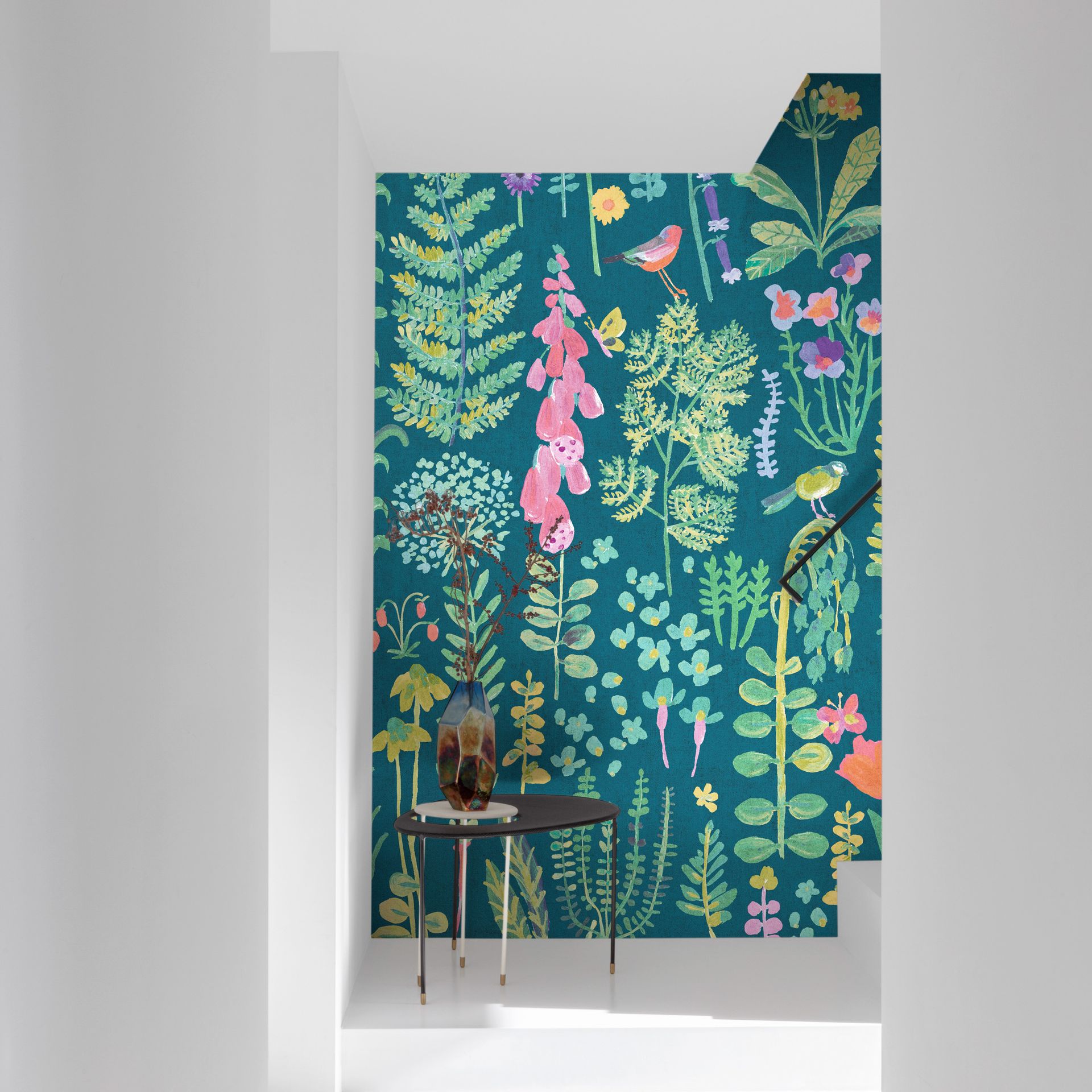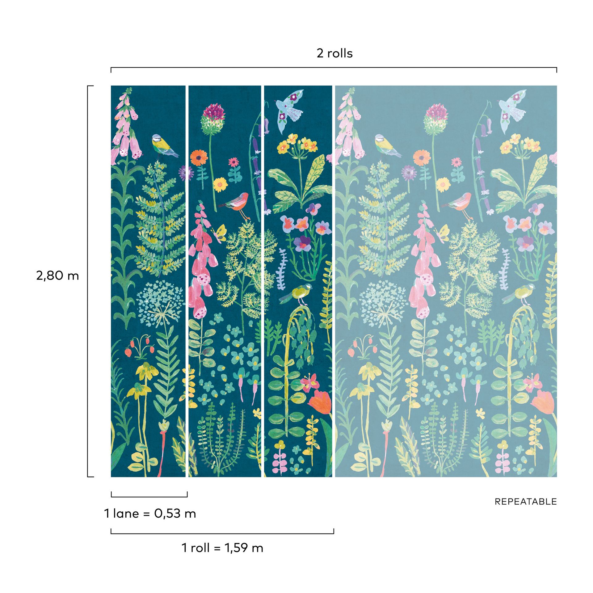 Diese ausdrucksstarke botanische Tapete präsentiert eine vielfältige Gartenszenerie mit detailreich gestalteten Wildblumen, Gräsern und ornamentalen Pflanzen vor einem charakteristischen Dunkelgrün. Zahlreiche Blüten in Rosa, Orange, Gelb, Pink und Rot sowie zwei liebevoll illustrierte Vögel schaffen eine lebendige, naturnahe Komposition mit großflächigen Motivelementen.