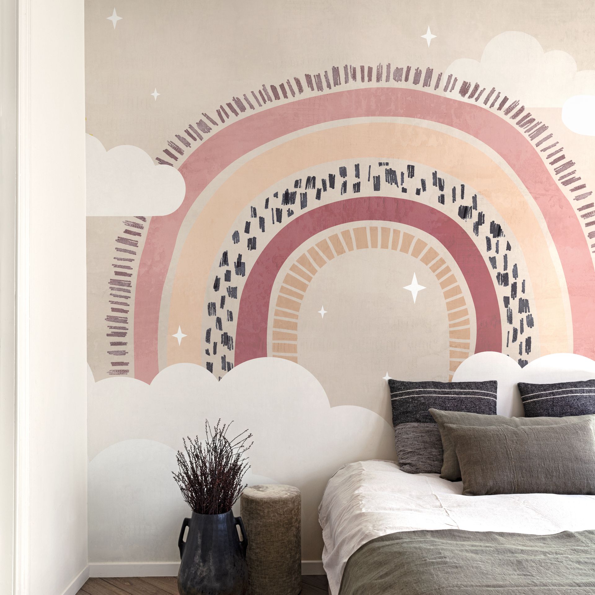 Diese Tapete präsentiert ein verspieltes Regenbogen-Motiv, das von weichen Wolkenformen umgeben ist. Der Regenbogen wird aus mehreren konzentrischen Bögen in zarten Pastellfarben gebildet – Zartrosa, Pfirsich und zartes Blau – mit dekorativen Linienmustern in den äußeren und inneren Bögen. Die Gesamtkomposition wirkt leicht und träumerisch.