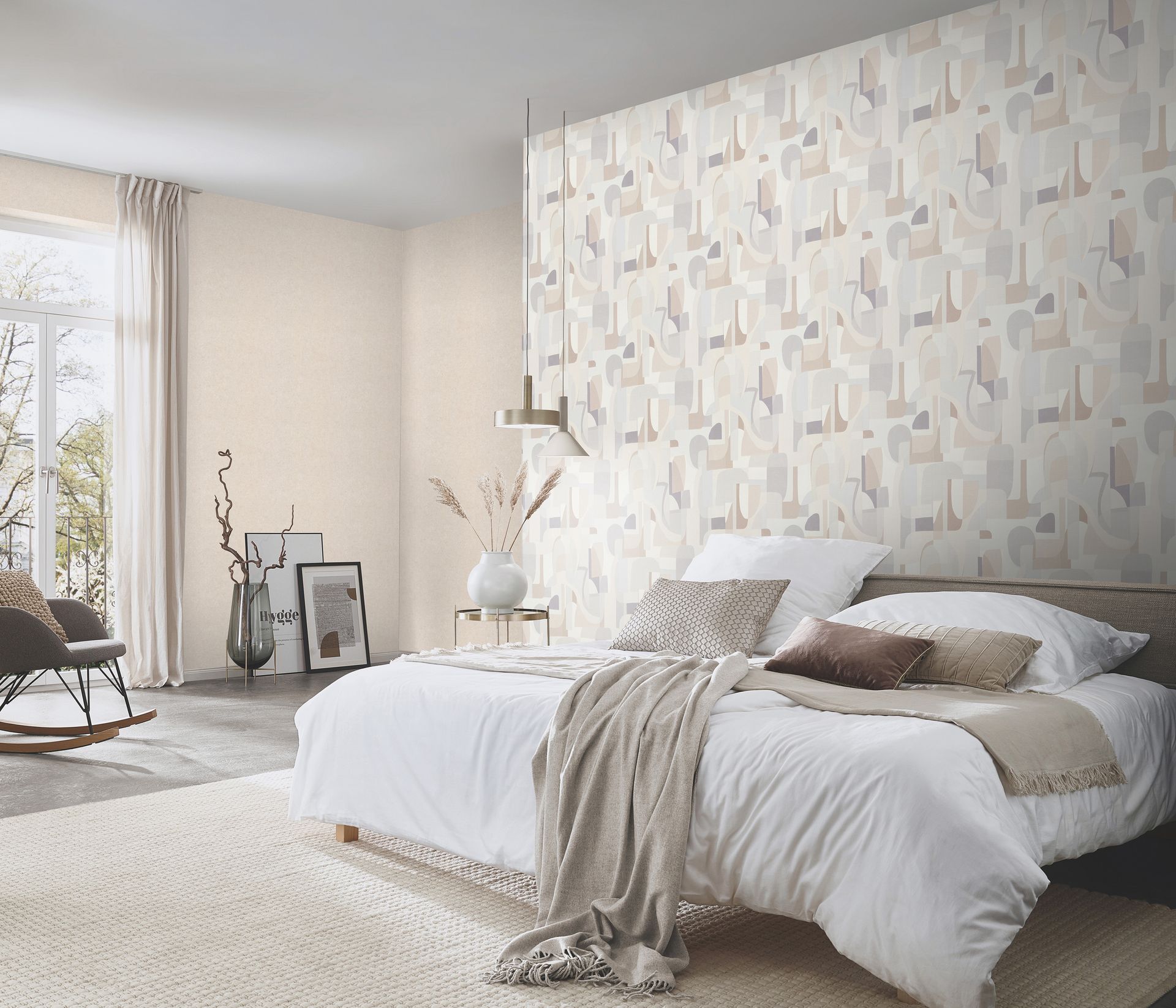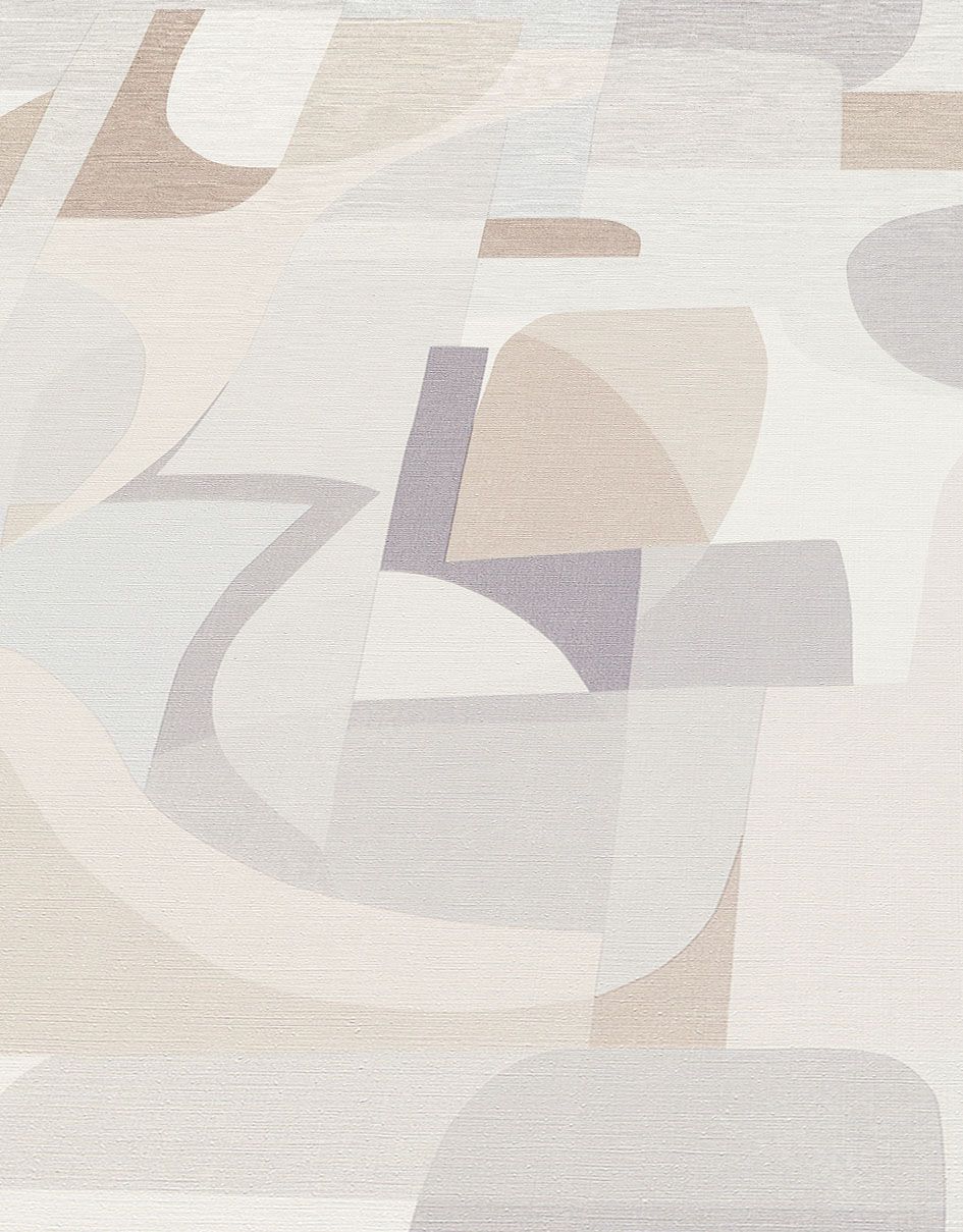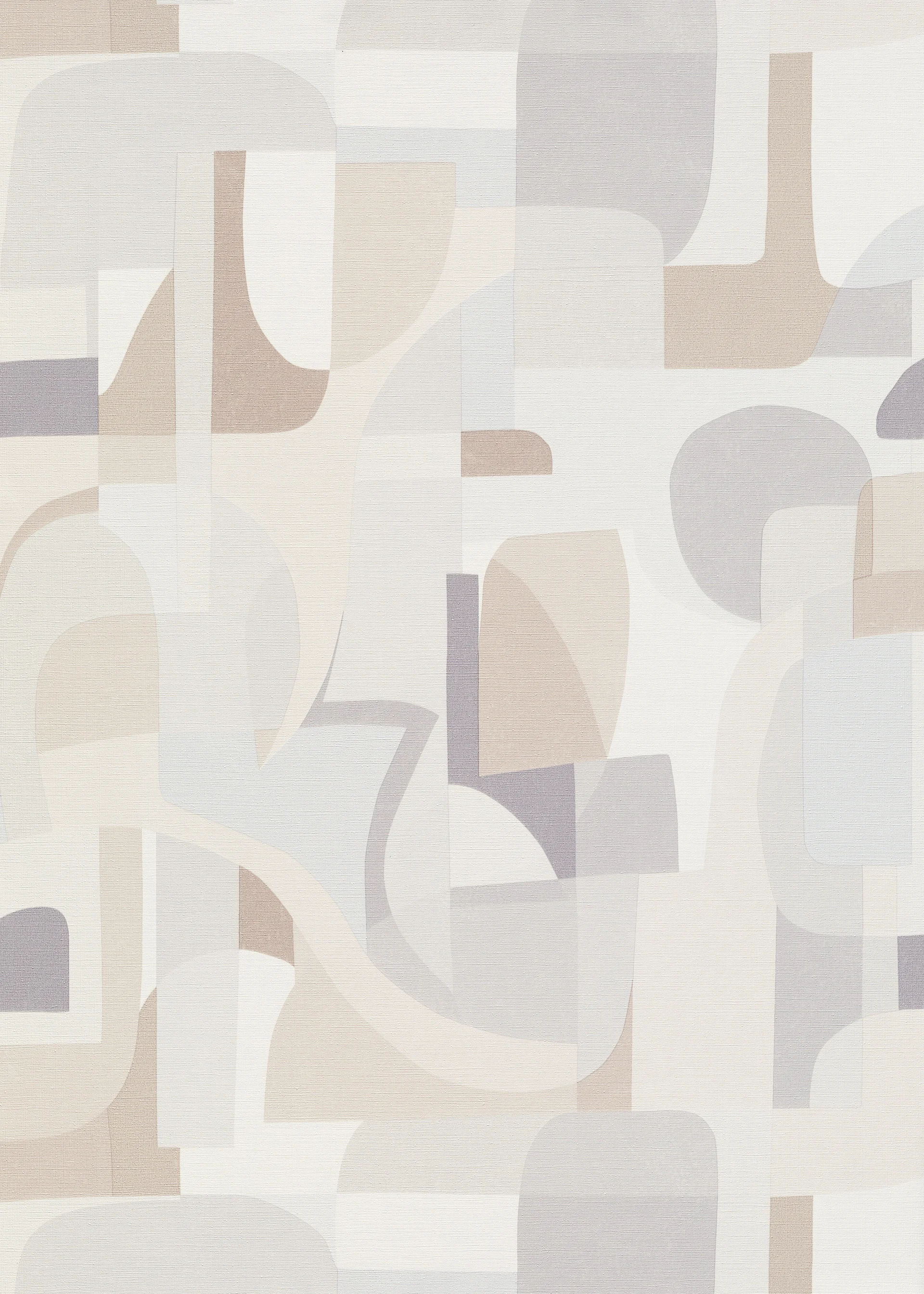 Diese moderne Tapete aus der Kollektion Gentle von Erismann besticht durch ihre sanfte, harmonische Farbgebung in Creme, Beige, Hellgrau und Taupe. Großflächige, organisch-geometrische Formen mit abgerundeten Kanten schaffen eine abstrakte Komposition, die an zeitgenössische Kunst oder stilisierte Architekturelemente erinnert. Die Formen sind subtil ineinander verschachtelt und überlagert, während die feine Textilstruktur der Oberfläche an natürliches Leinengewebe erinnert und dem Design eine dezente, haptische Tiefe verleiht.