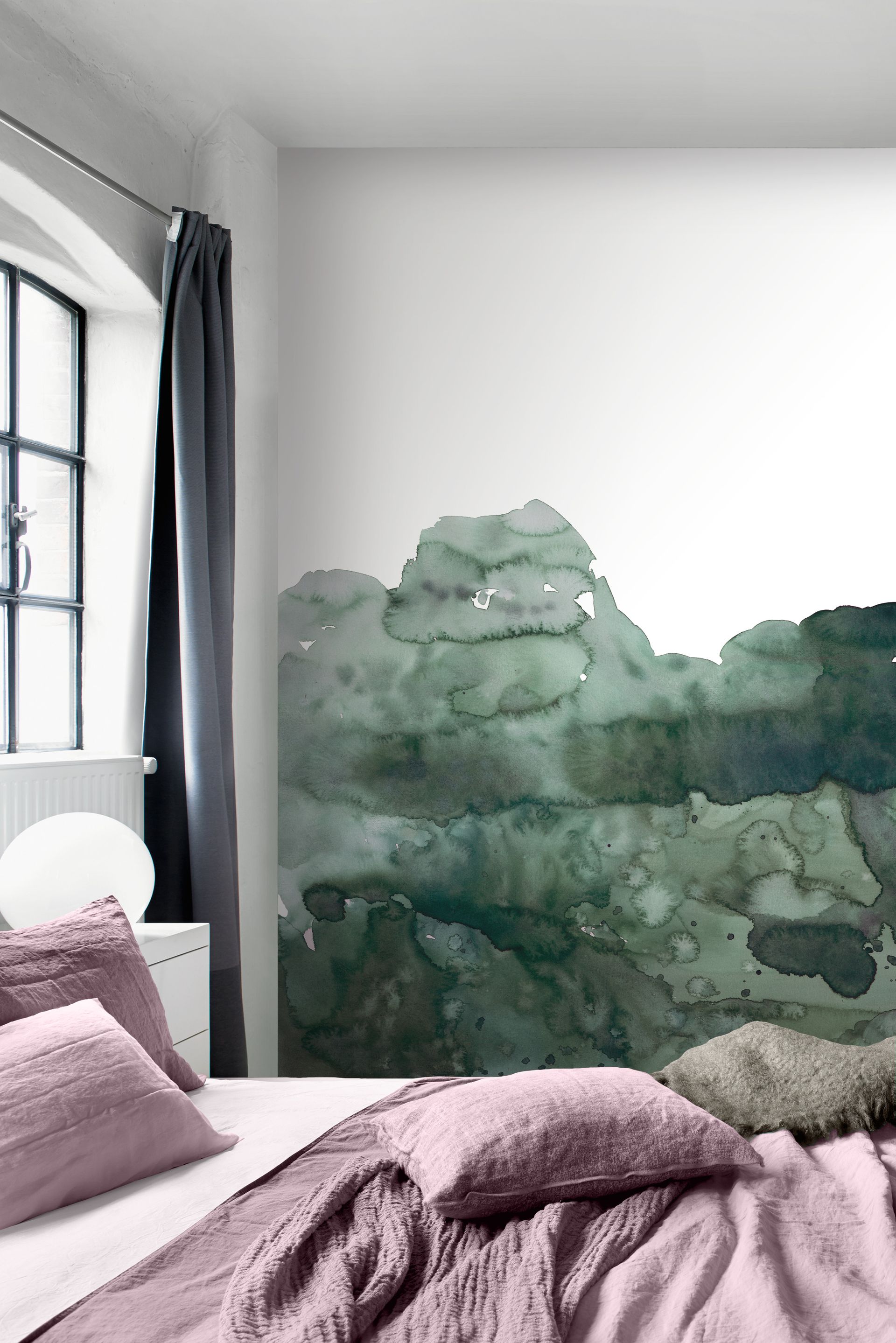 created by Leo la Douce: Schicht für Schicht ergeben Aquarellfarbkleckse in Grün- und Blaunuancen auf 372 x 280 cm ein wunderschönes Kunstwerk für die Wand, das jeden Raum in eine ganz besondere Stimmung hüllen wird.
