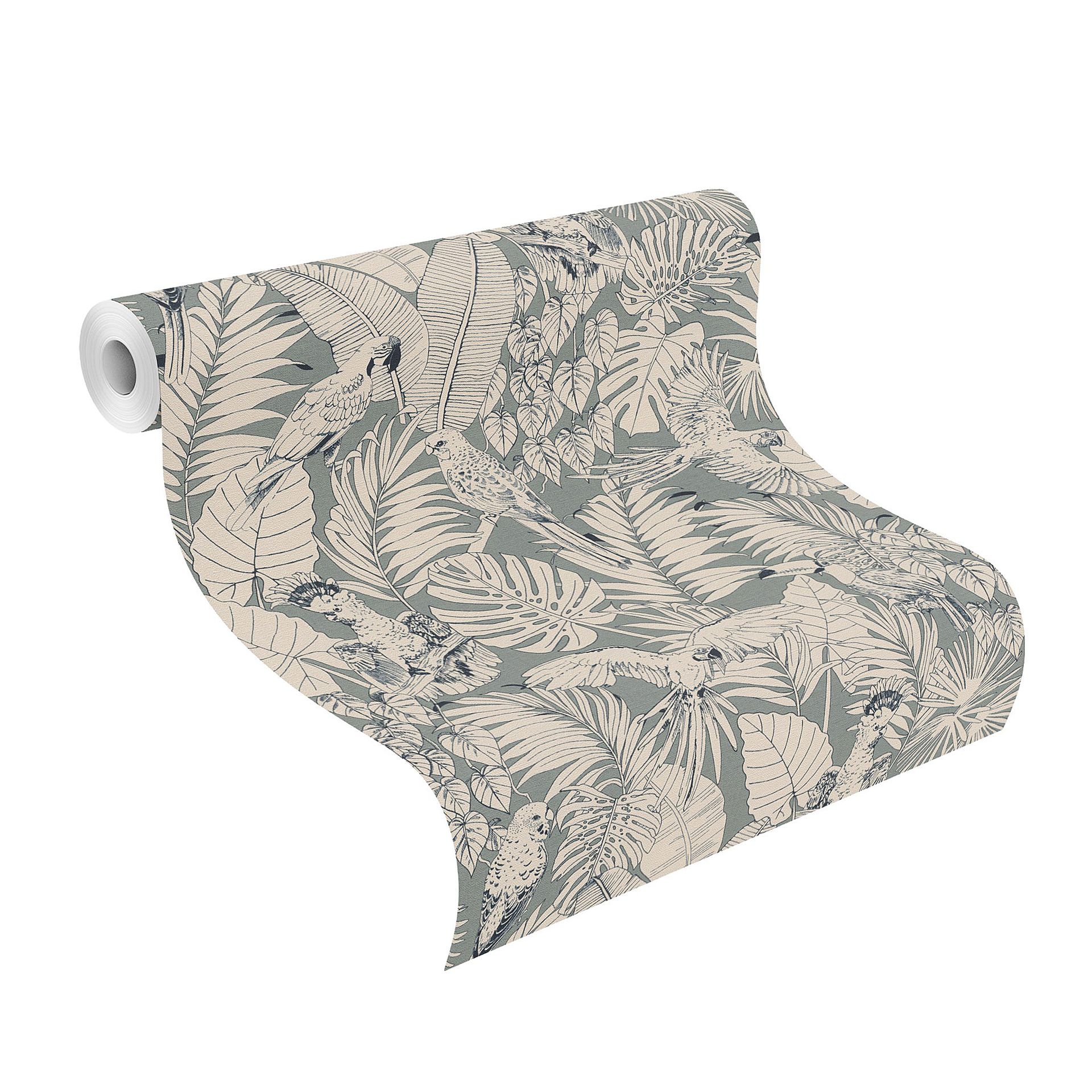 Pssst. Hast du schon den Papagei entdeckt? Auf der Olivgrünen Strukturtapete fühlen sich die schwarz-weißen Tiere sichtlich wohl. Umrahmt werden sie von unterschiedlichen Blättern und Gewächsen, die an der Wand prächtig gedeihen. Los geht s ins Dschungelabenteuer.