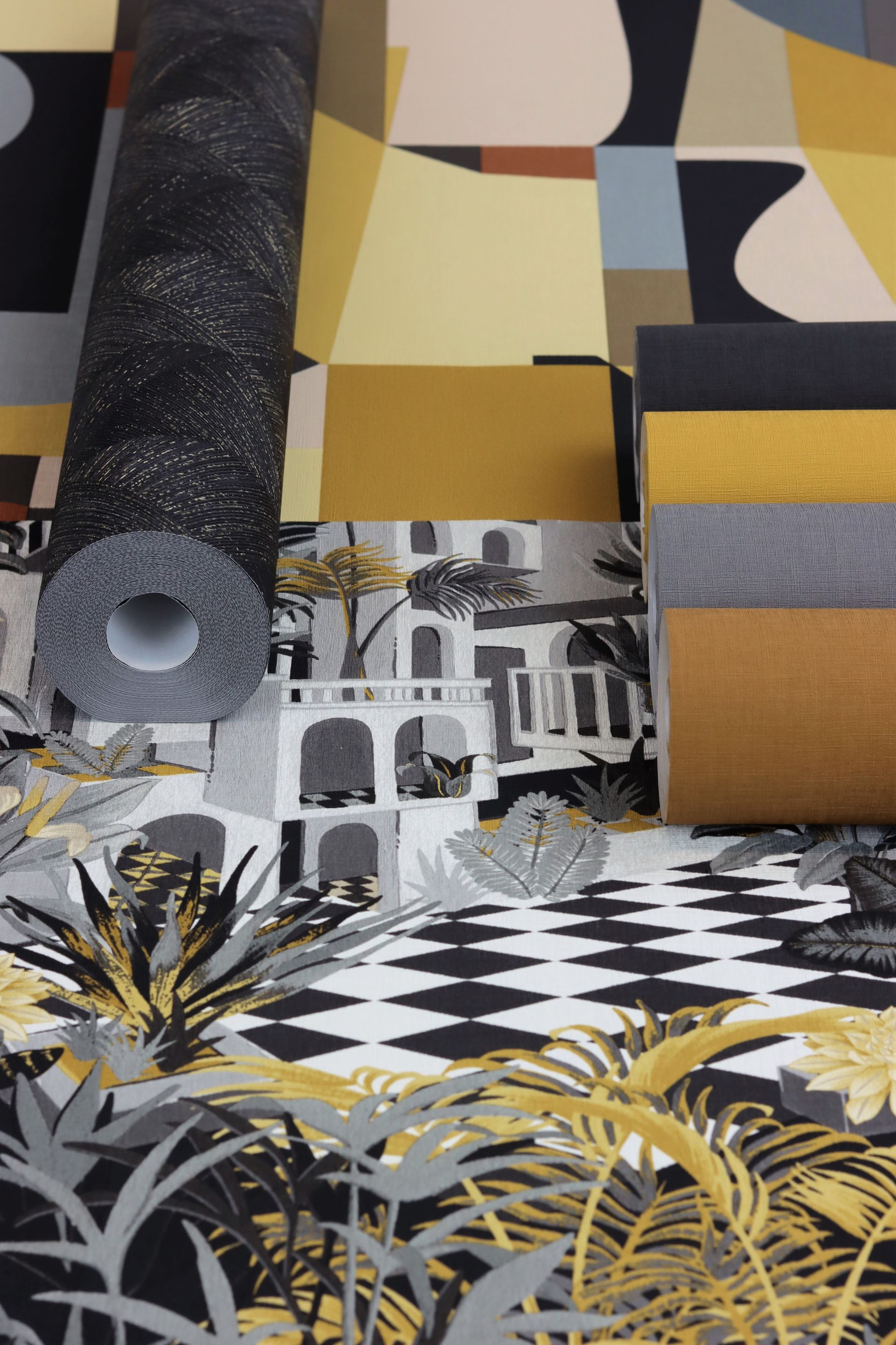 Das gehört zum guten Ton: Ein Wandlook in hellem Grau sorgt schnell für entspannte Stimmung im Raum. Wer genau hinsieht, entdeckt die zarte Struktur, die der Unitapete einen natürlichen Charakter verleiht. Dazu passen die Mustertapeten aus der Kollektion, leuchtende Accessoires und natürliche Materialien, bunte Teppiche und samtige Kissen. Einfach kombinieren und freuen.