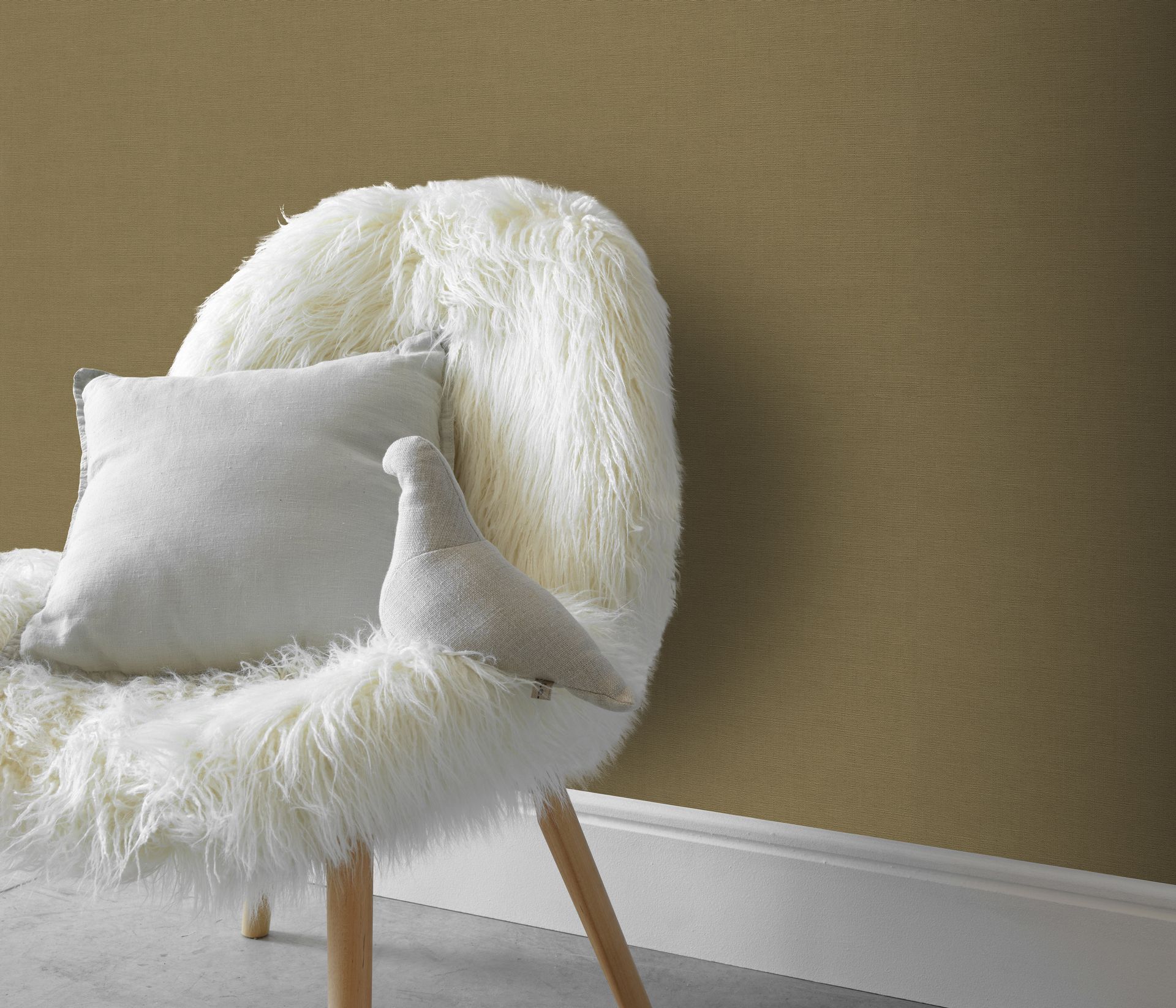 Der warme Olivton schafft eine geerdet-natürliche Atmosphäre und eignet sich hervorragend als neutrale Basis für verschiedene Einrichtungsstile. Die Tapete lässt sich vielseitig einsetzen – sowohl für ganze Räume als auch als dezente Akzentwand. Besonders gut harmoniert sie mit natürlichen Materialien wie Holz, Leinen und Rattan sowie mit erdigen und gedeckten Farbtönen.