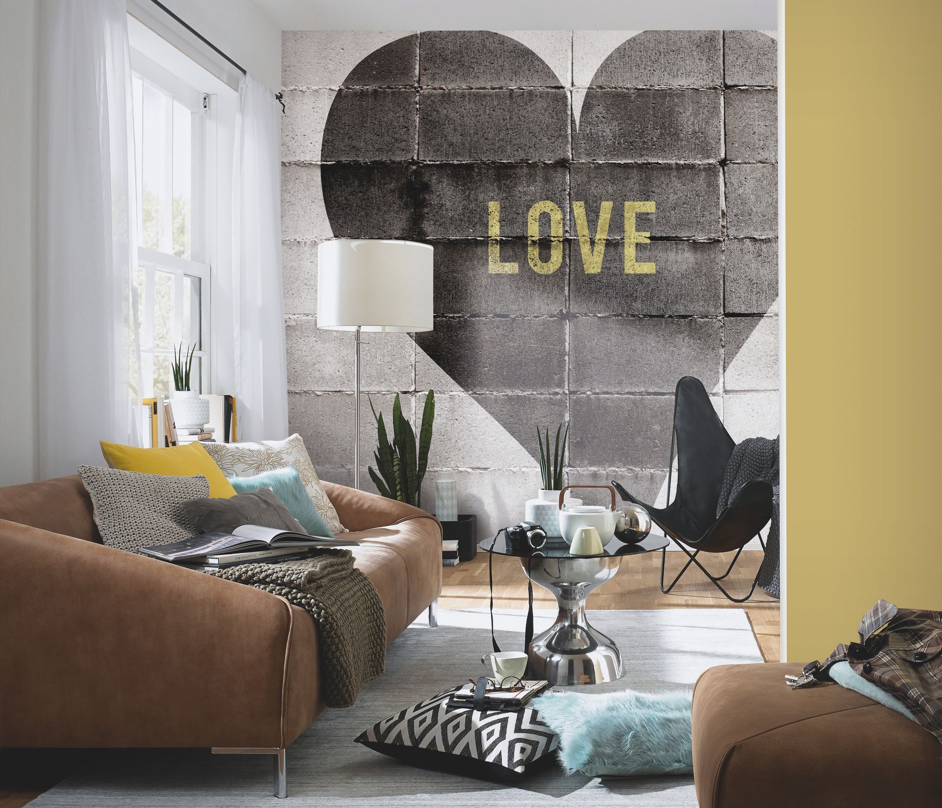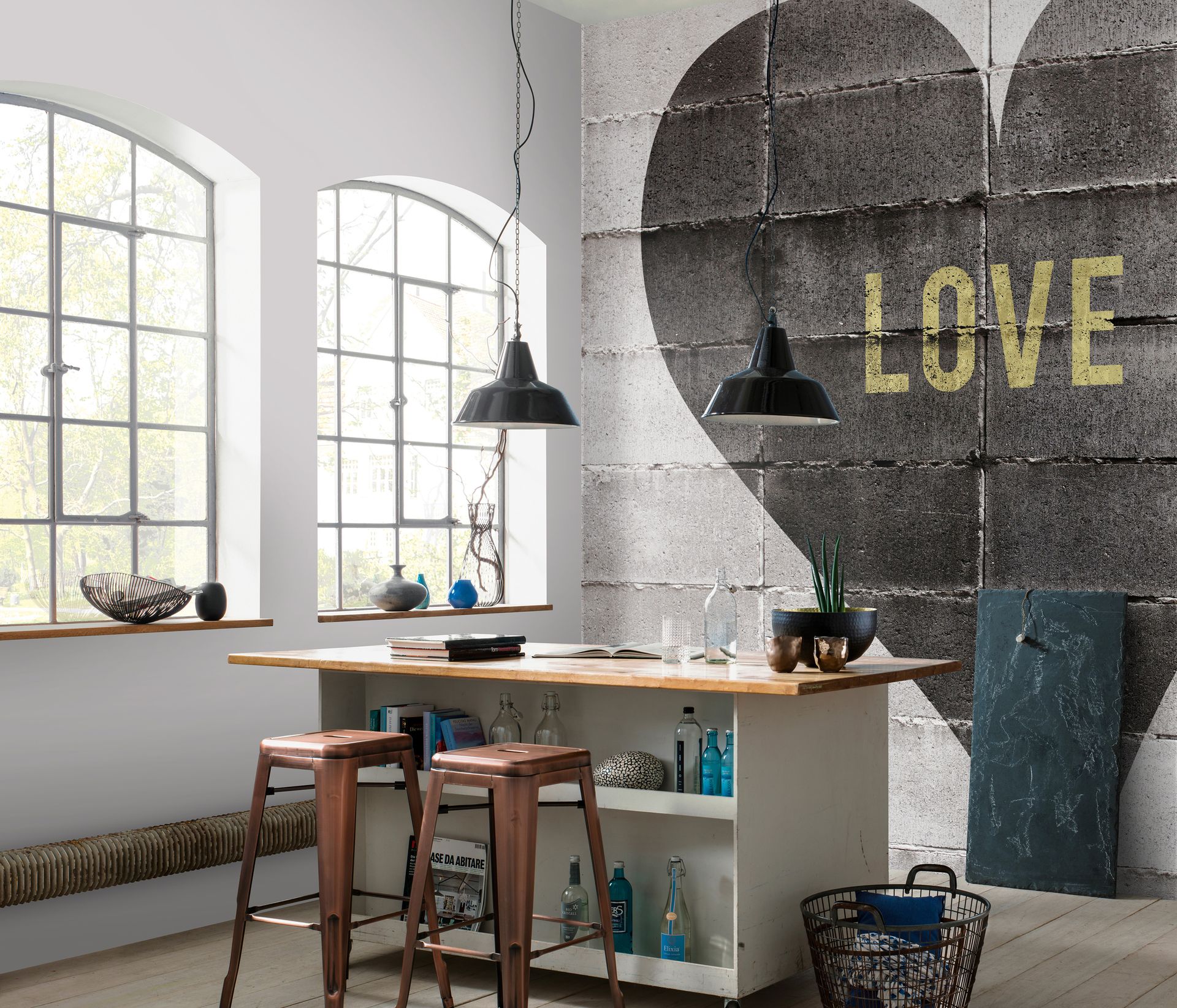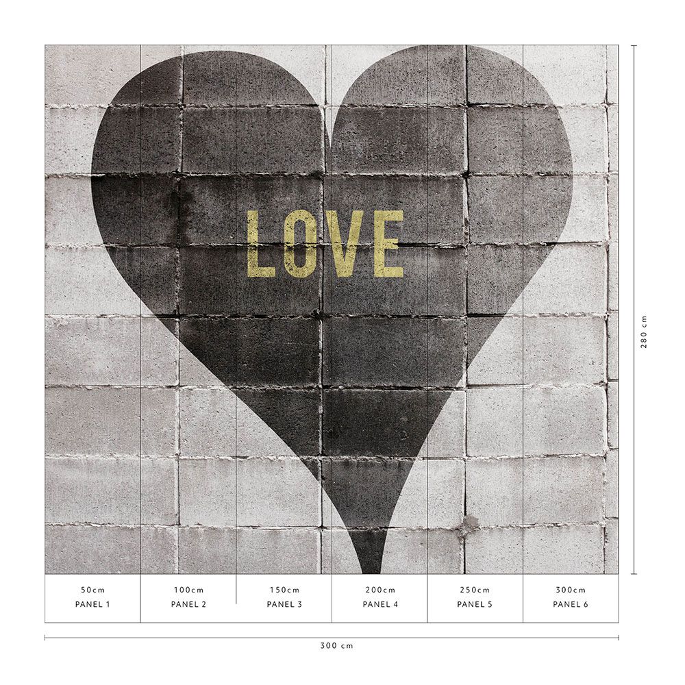 Diese Urban-Style-Tapete bringt den Charme von Street-Art in den Wohnraum. Auf einer fotorealistischen grauen Backsteinwand ist ein großflächiges schwarzes Herz mit dem goldenen Schriftzug „LOVE" zu sehen – eine gelungene Verbindung von urbaner Ästhetik und romantischer Symbolik. Die authentische Backsteinstruktur verleiht der Wandgestaltung Tiefe und industriellen Charakter.
