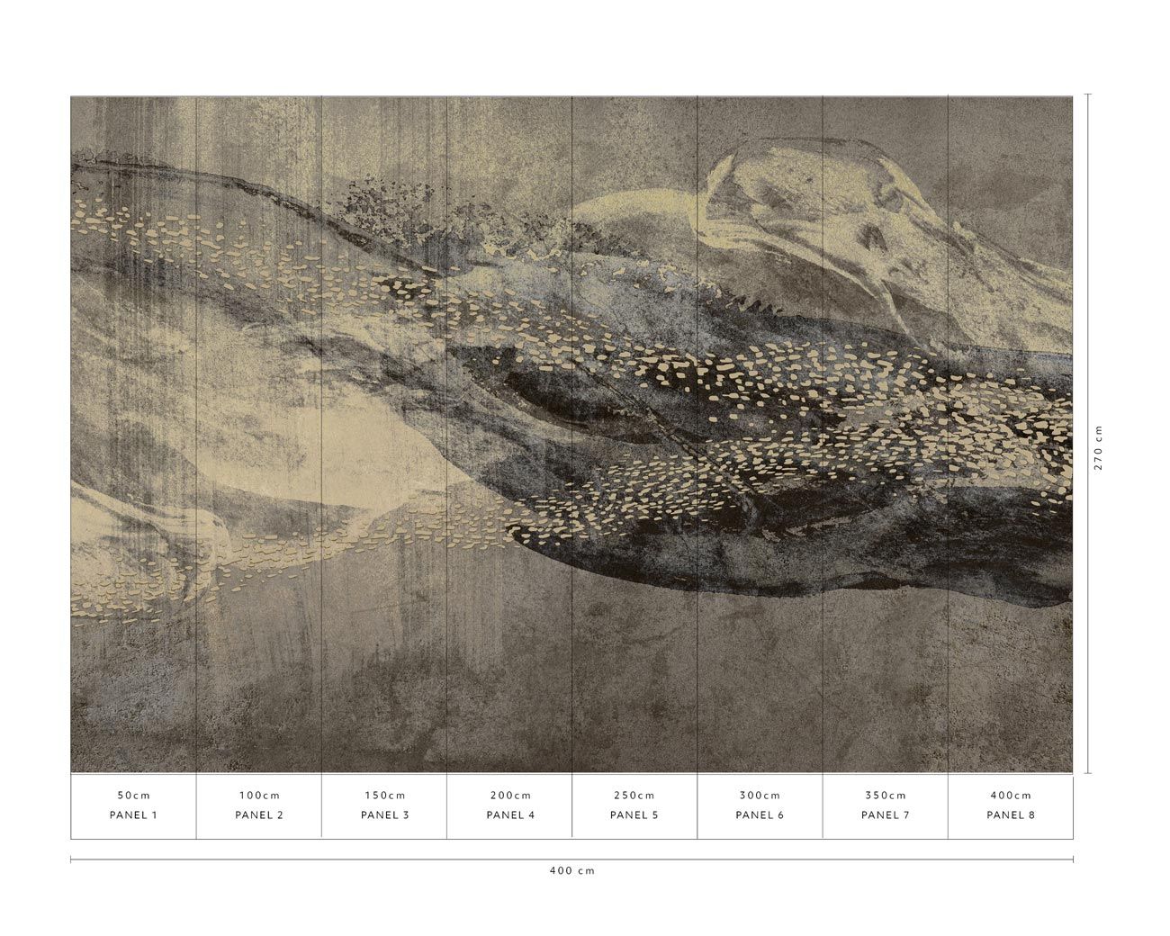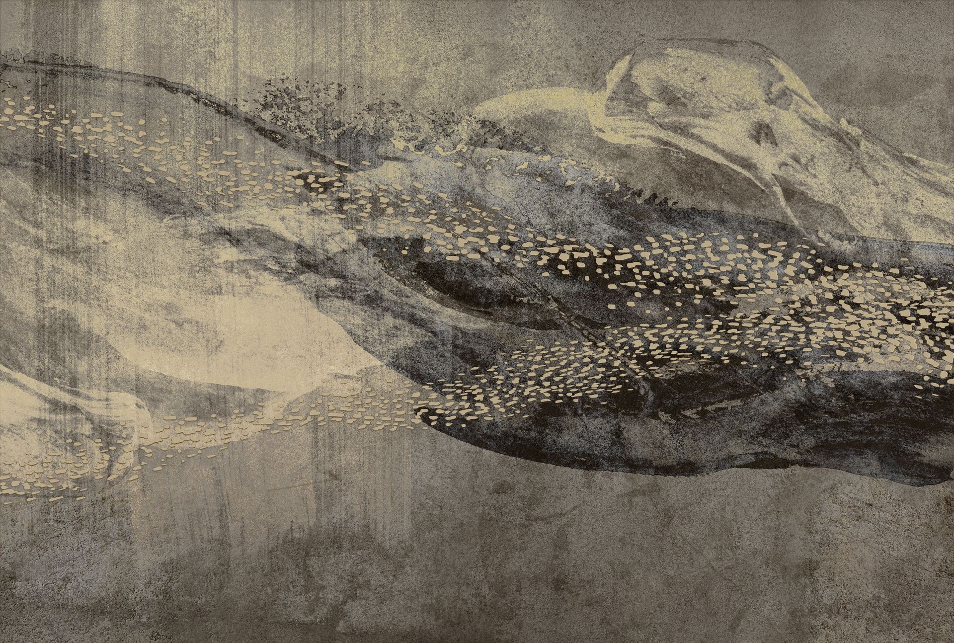 Die warme Farbpalette aus gedämpften Grautönen, Creme und gold-beigen Akzenten erzeugt eine beruhigende, zugleich mystisch-faszinierende Atmosphäre. Besonders als Akzentwand in Wohnzimmer, Schlafzimmer oder Esszimmer entfaltet das großflächige Motiv seine volle Wirkung und wird zum künstlerischen Blickfang. Die schimmernden Gold-Nuancen reagieren subtil auf wechselnde Lichtverhältnisse und verleihen dem Raum lebendige Tiefe.