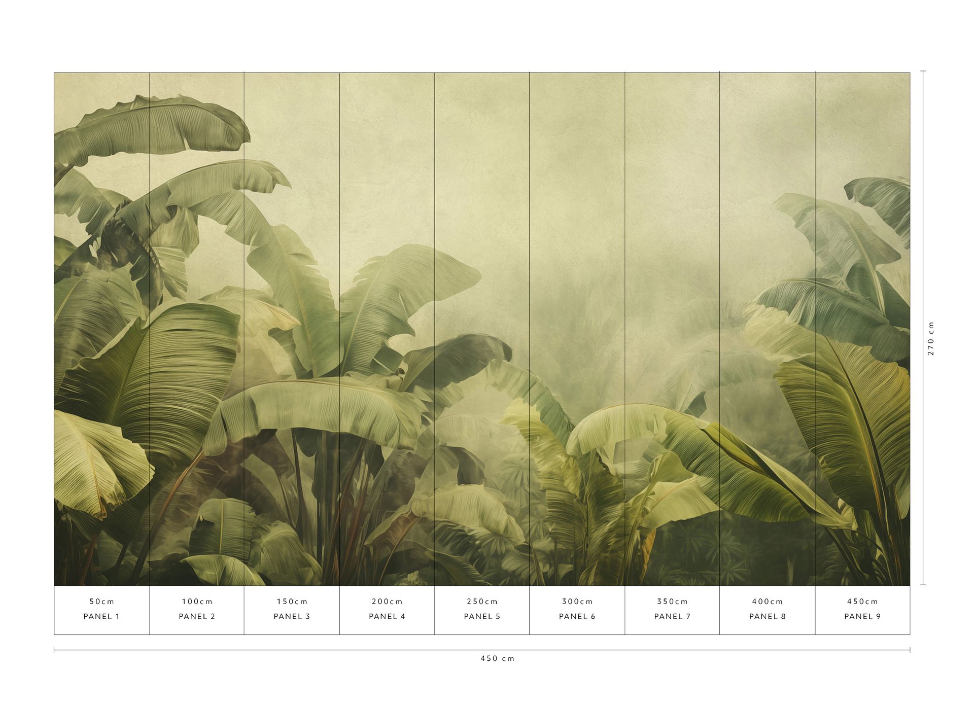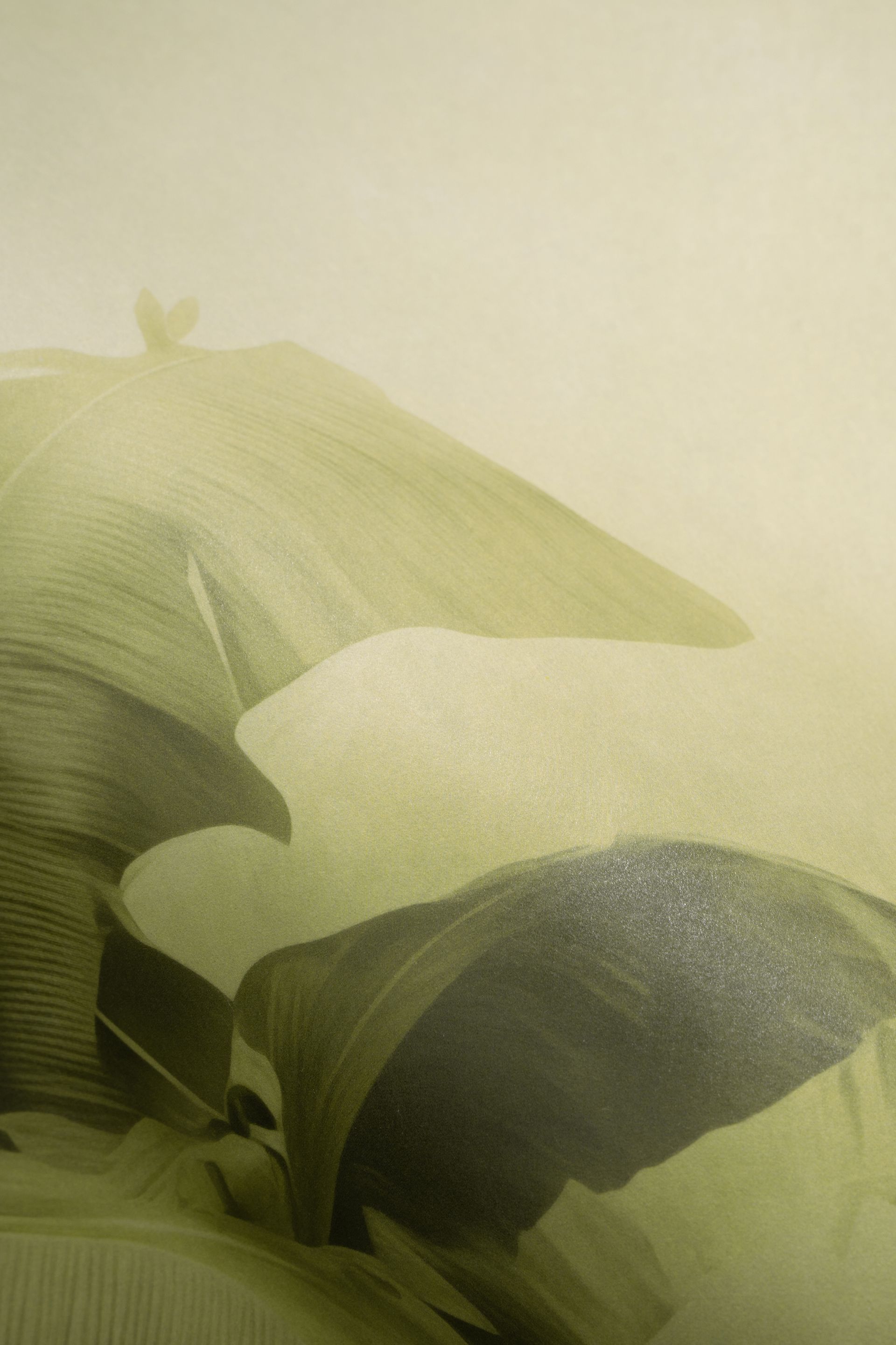 Diese botanische Tapete aus der Kollektion Big Pictures zeigt großformatige Bananenpalmen in einer malerischen, atmosphärischen Darstellung. Die breiten Blätter in Olivgrün- und Gelbgrün-Tönen sind detailliert gezeichnet und zeigen feine Linienstrukturen, während der Hintergrund in sanften Beige- und Cremetönen neblig verschwimmt. Die aquarellartige Anmutung verleiht der Tapete einen künstlerischen, eleganten Charakter.