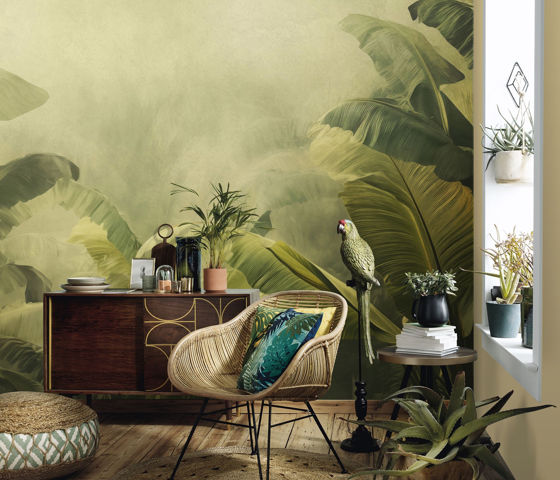 Diese botanische Tapete aus der Kollektion Big Pictures zeigt großformatige Bananenblätter in sanften Olivgrün-, Beige- und Cremetönen. Die naturalistische Darstellung mit deutlich sichtbaren Blattadern und organischen Formen vermittelt eine tropische, dschungelartige Atmosphäre. Der malerische, fast aquarellartige Stil verleiht dem Design eine ruhige, zeitgenössische Note.