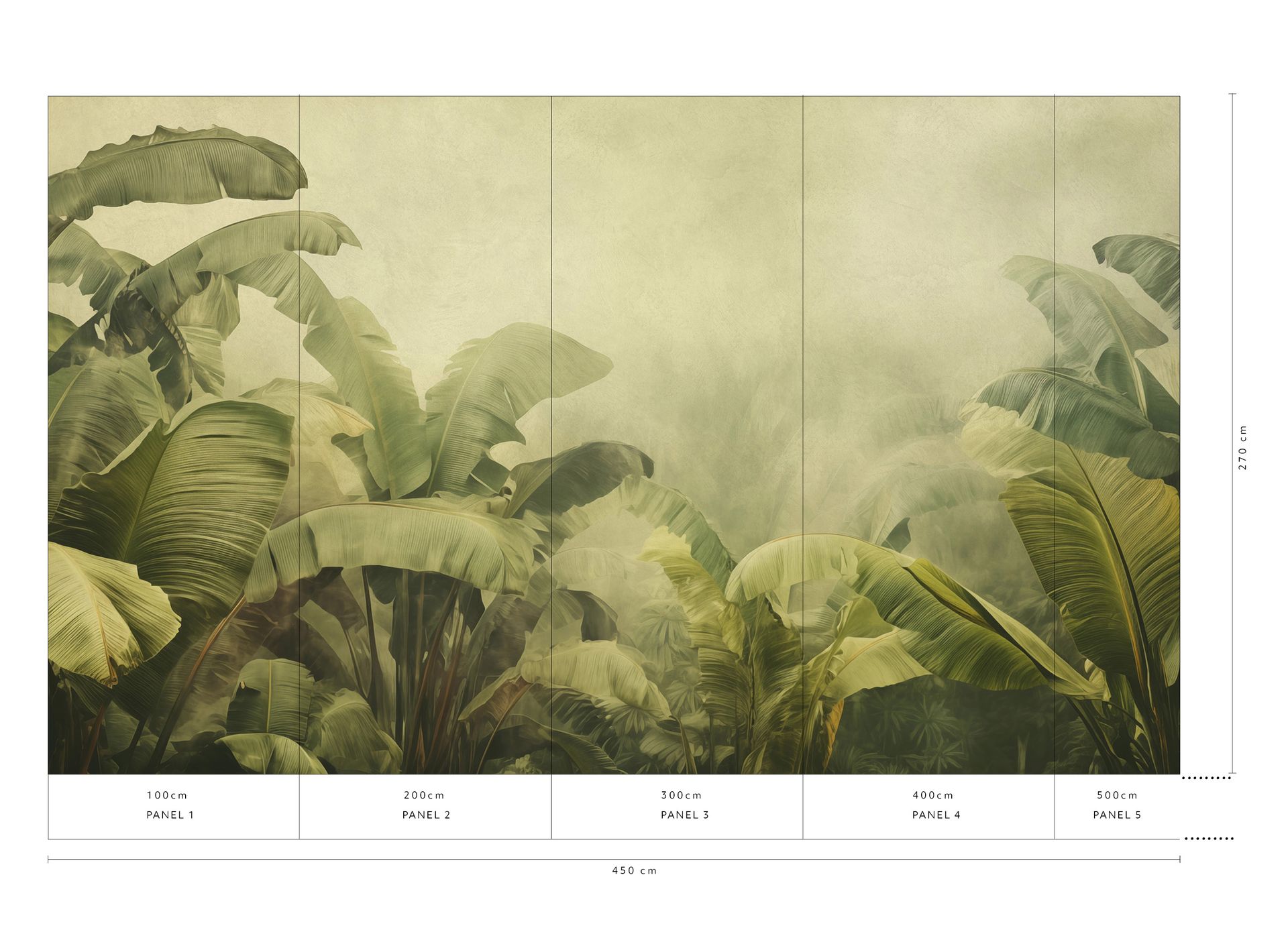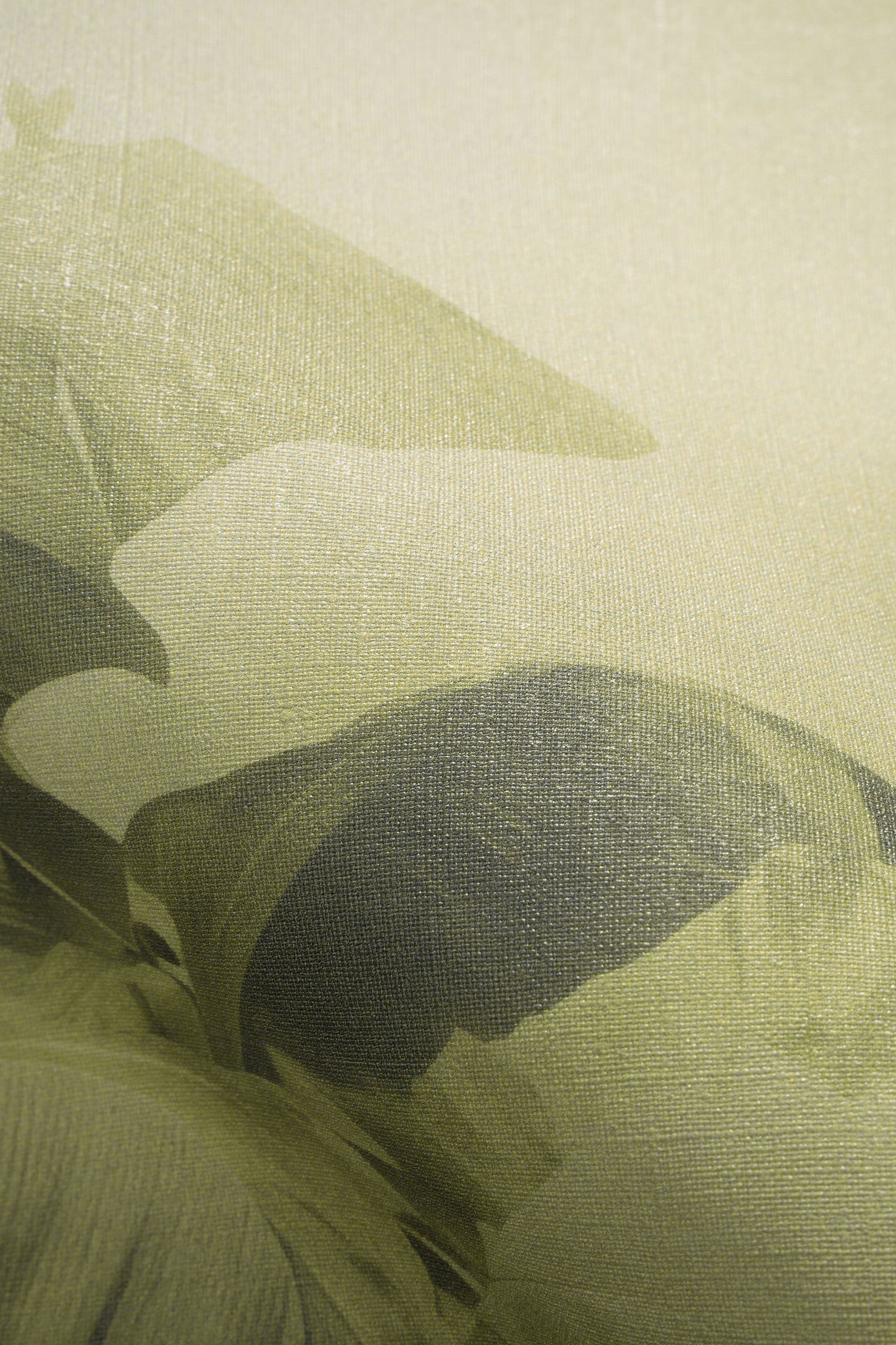 Diese Tapete aus der Big Pictures-Kollektion beeindruckt mit großformatigen Bananenblättern in naturalistischer Darstellung. Die Blätter sind in verschiedenen Grüntönen gehalten – von zartem Hellgrün bis zu sattem Olivgrün – und zeigen fein gezeichnete Blattadern. Der aquarellartige Hintergrund in Beige- und Cremetönen mit nebligen Farbverläufen verleiht dem Design eine malerische, verträumte Anmutung.