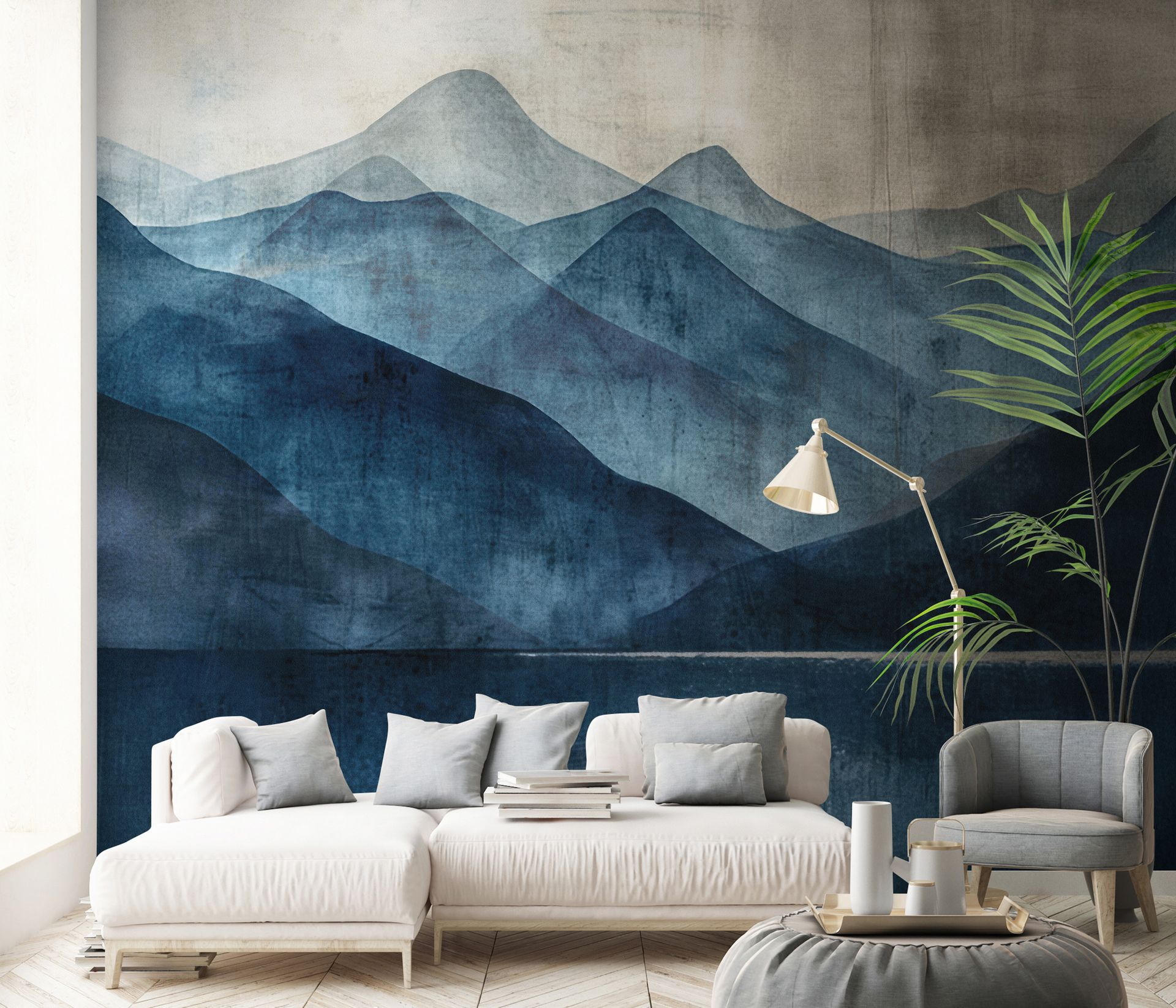 Diese künstlerische Wandgestaltung zeigt ein mehrschichtiges Bergpanorama in verschiedenen Blaunuancen mit Aquarell-Verlaufseffekt. Die Berge staffeln sich von dunklen Blautönen im Vordergrund bis zu zarten hellblauen Silhouetten im Hintergrund, ergänzt durch eine beige-cremefarbene Himmelspartie. Im Vordergrund spiegelt sich die Landschaft in einem ruhigen Gewässer.