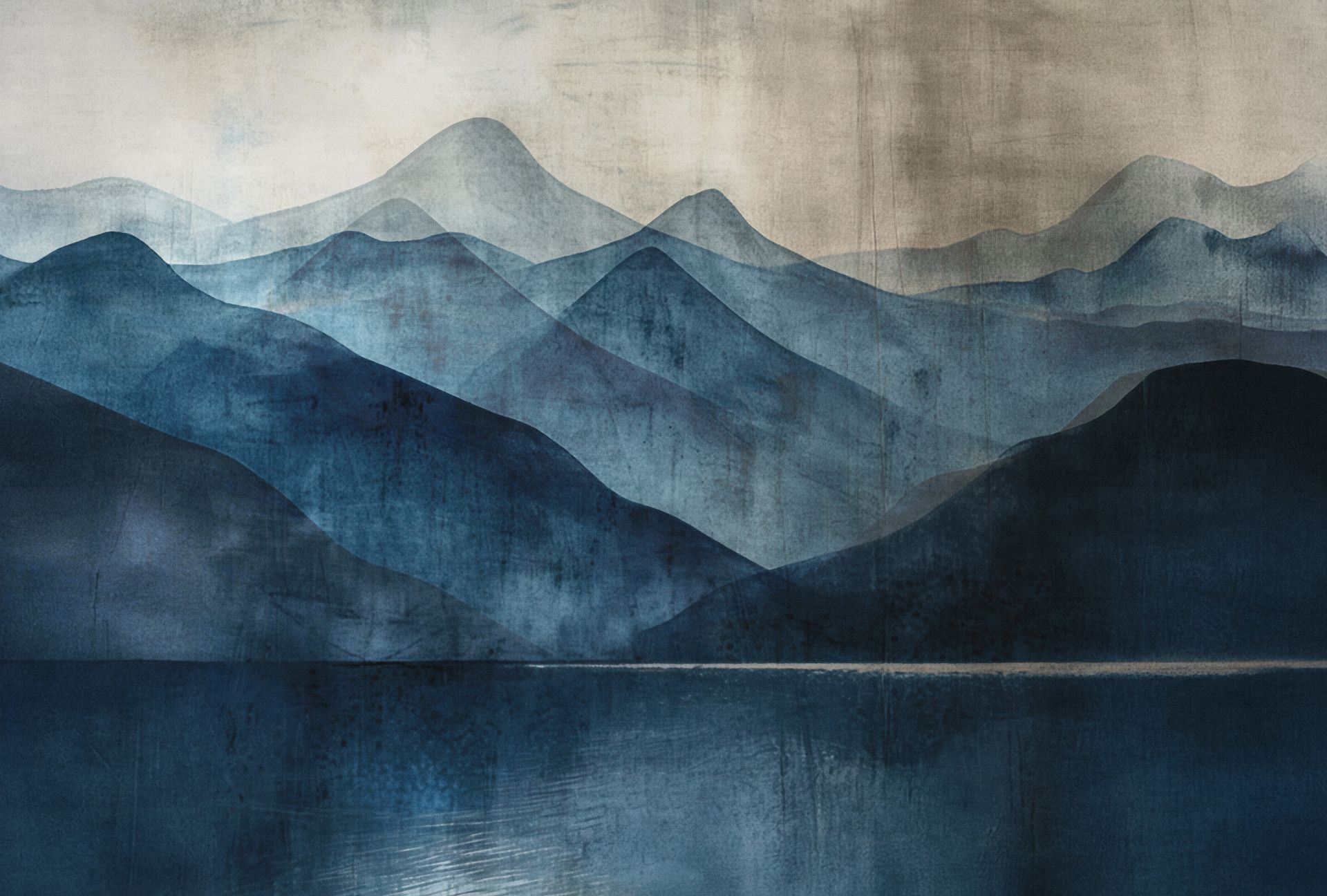 Tapete mit Berglandschaft in Blautönen und Aquarell-Optik
