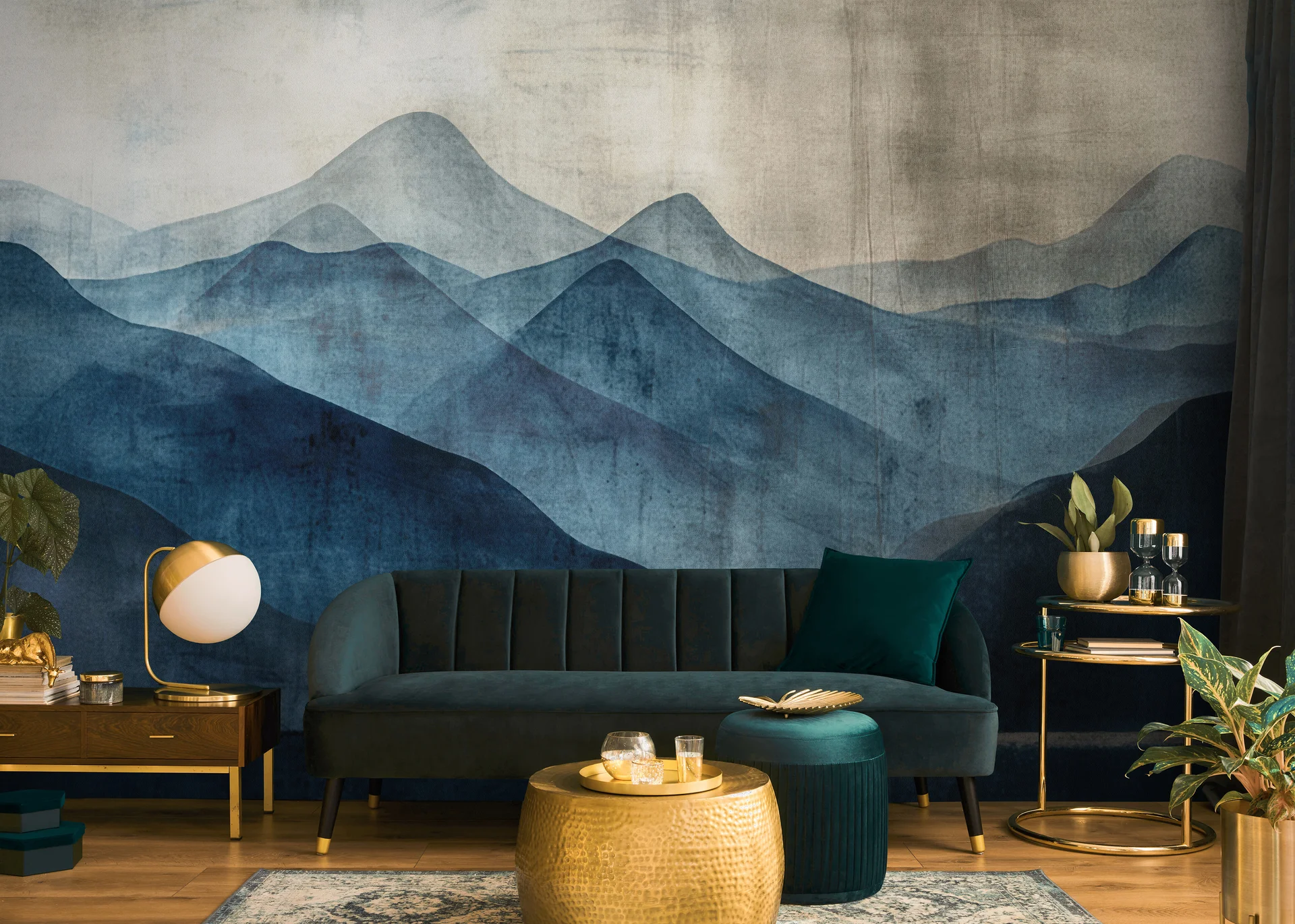 Die kühle Farbgebung und die sanften Verläufe schaffen eine meditative, beruhigende Raumatmosphäre. Der großflächige Bildcharakter macht diese Tapete zur idealen Akzentwand in Räumen, die Ruhe und Naturverbundenheit ausstrahlen sollen. Die horizontale Ausrichtung und die Tiefenwirkung der gestaffelten Berge wirken raumvergrößernd.