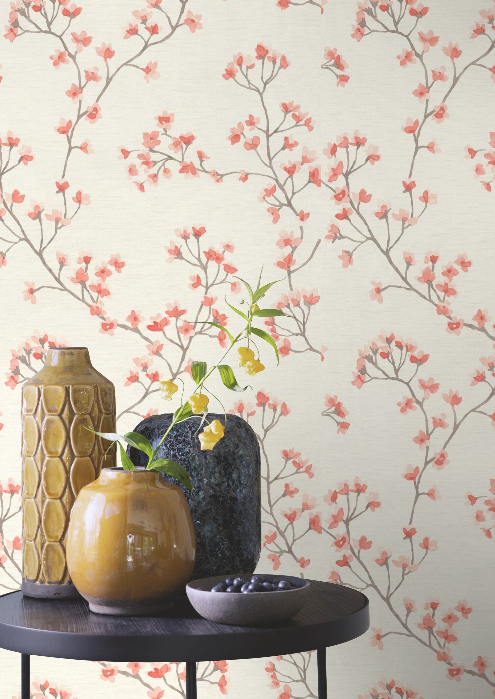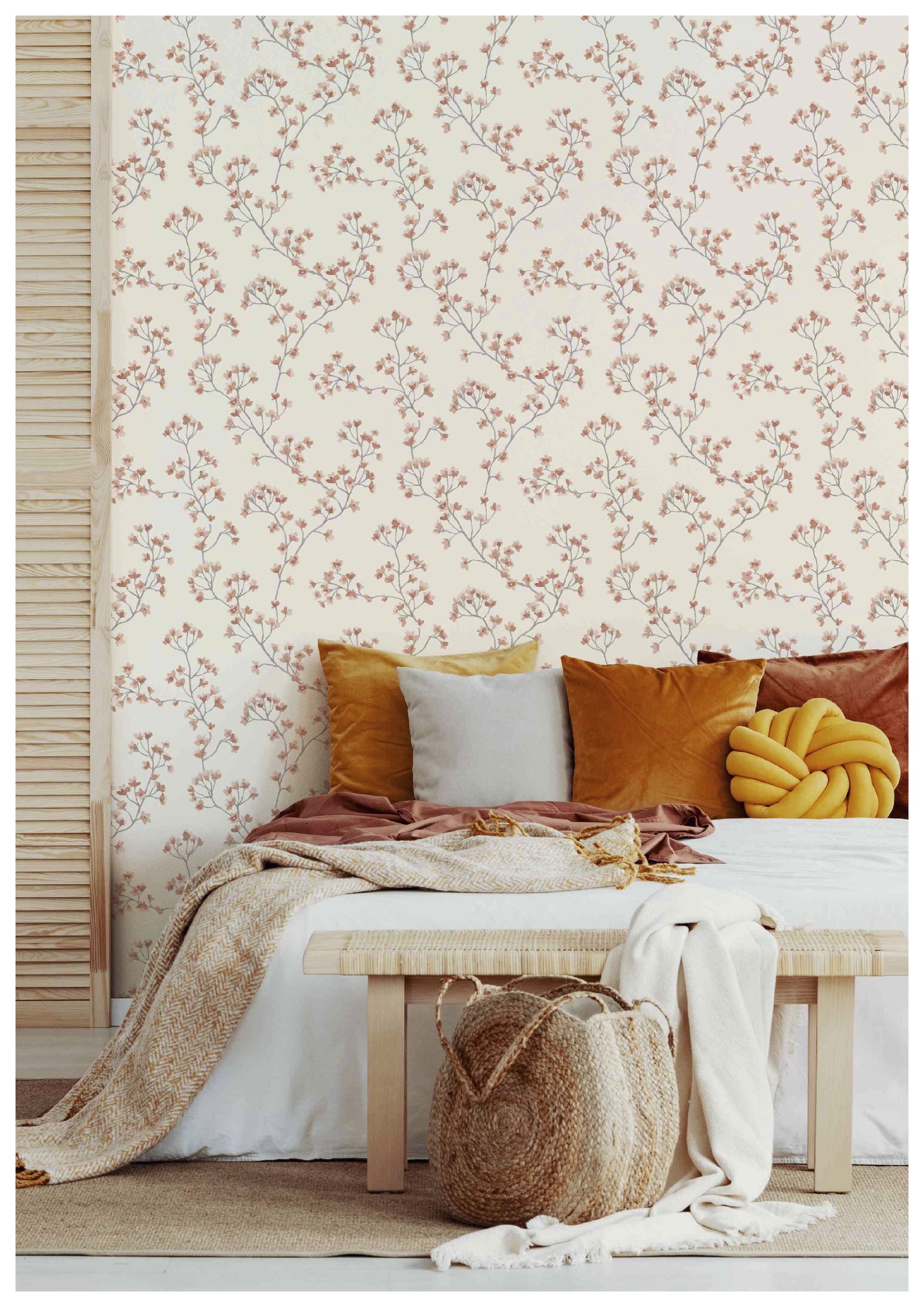 Diese romantische Tapete besticht durch ihre zarten Blütenzweige in sanften Rosatönen auf cremefarbenem Untergrund. Die naturalistisch gezeichneten Blüten schaffen eine warme und einladende Atmosphäre mit femininer Eleganz.