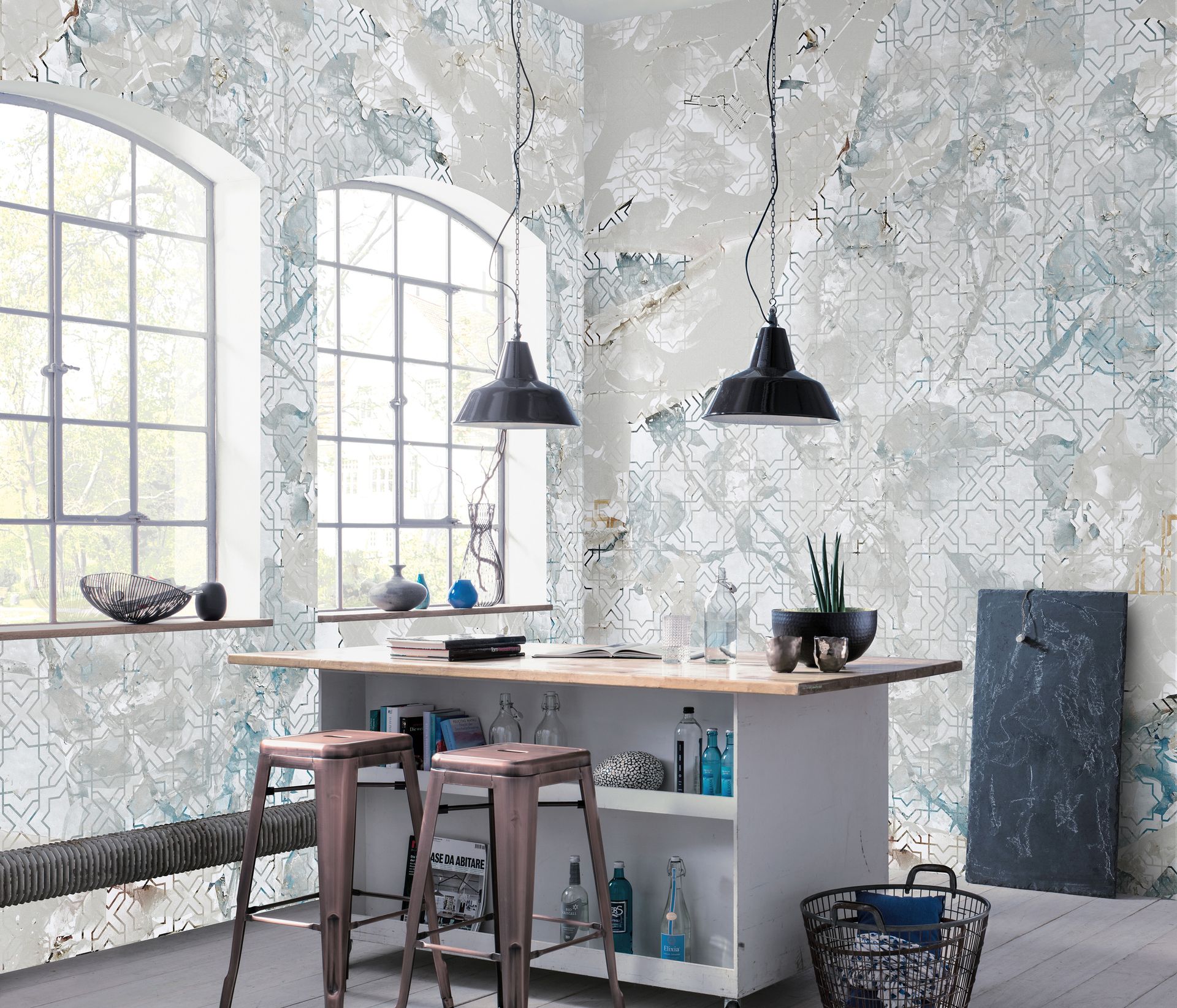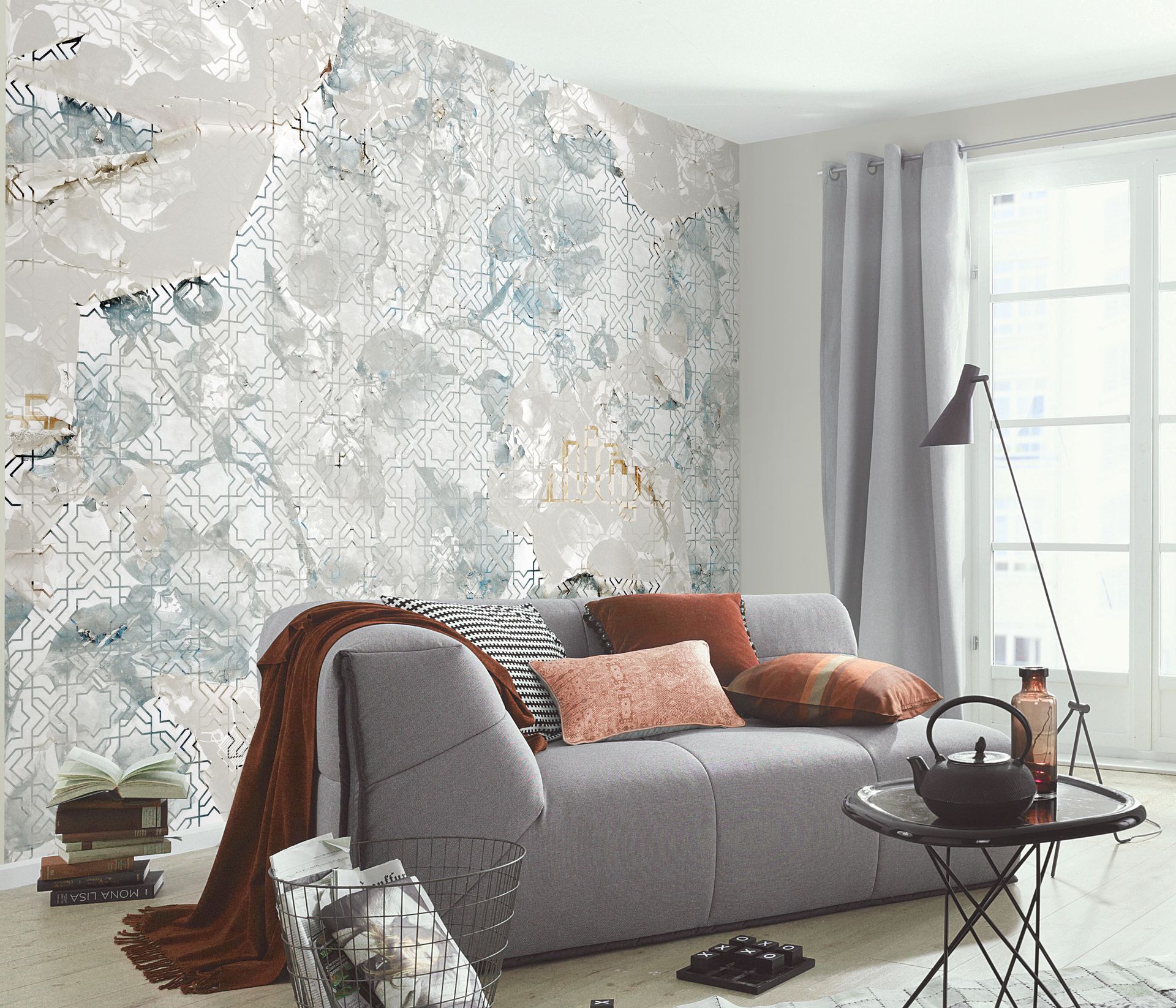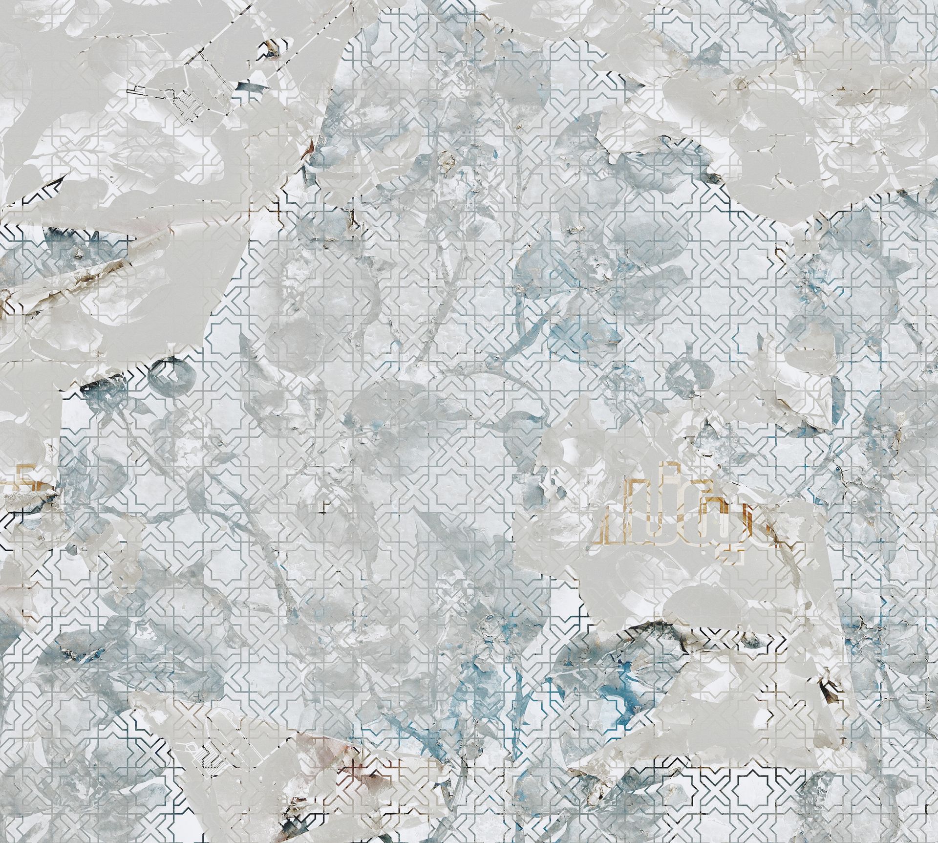 Diese zeitgenössische Tapete verbindet kunstvolle Aquarell-Optik mit filigraner Geometrie: Über einem weichen Hintergrund in Hellgrau-, Taubenblau- und Beigetönen legt sich ein dezentes, orientalisch anmutendes Gittermuster. Die malerische Gestaltung mit ihren sanften Farbverläufen und goldbraunen Akzenten erinnert an moderne Kunstwerke und verleiht Räumen eine künstlerisch-sophistizierte Atmosphäre.