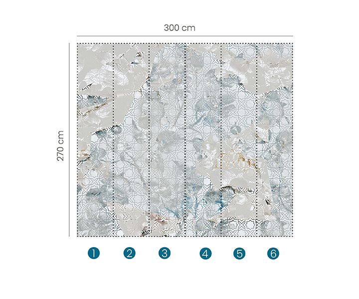 Die zurückhaltende Farbgebung in kühlen Grau- und Blaunuancen wirkt beruhigend und luftig, während die geometrische Struktur für dezente Raffinesse sorgt. Ideal für Wohnzimmer, Schlafzimmer oder Home-Office – das Design entfaltet seine Wirkung am besten im gesamten Raum, wo es eine harmonische, entspannte Raumatmosphäre schafft.