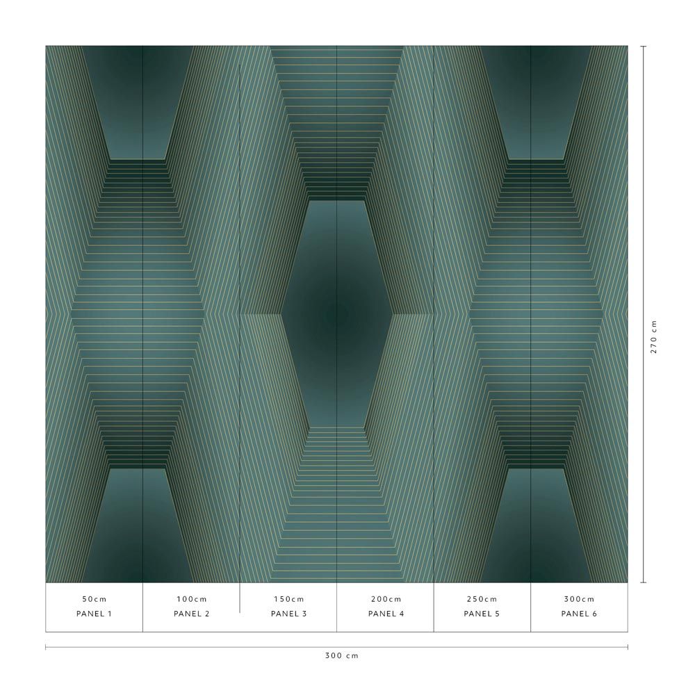 Art-Déco Tapete in Petrol-Gold mit geometrischem 3D-Muster