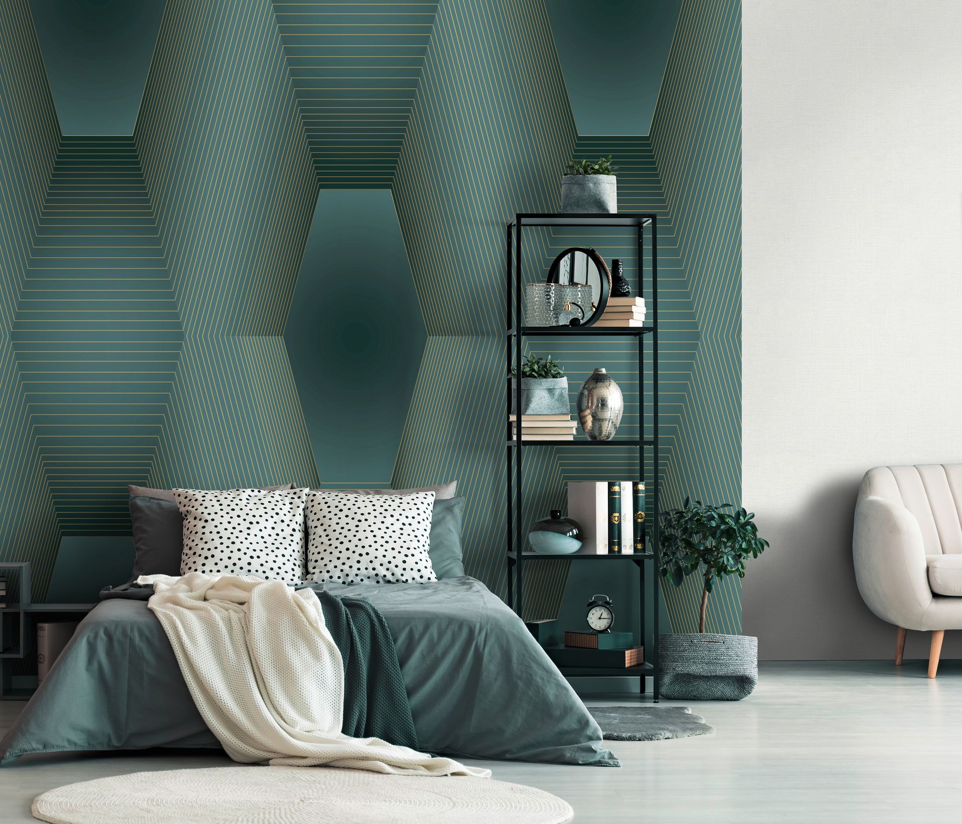 Die kühle Petrol-Farbgebung in Kombination mit eleganten Goldakzenten schafft eine luxuriöse, zugleich beruhigende Atmosphäre. Besonders wirkungsvoll kommt das großflächige Muster an einer Akzentwand zur Geltung – im Wohnzimmer hinter dem Sofa, im Esszimmer oder als glamouröser Blickfang in Flur und Bar. Das Spiel aus Licht und Schatten auf den Metallic-Linien verstärkt die räumliche Wirkung zusätzlich.