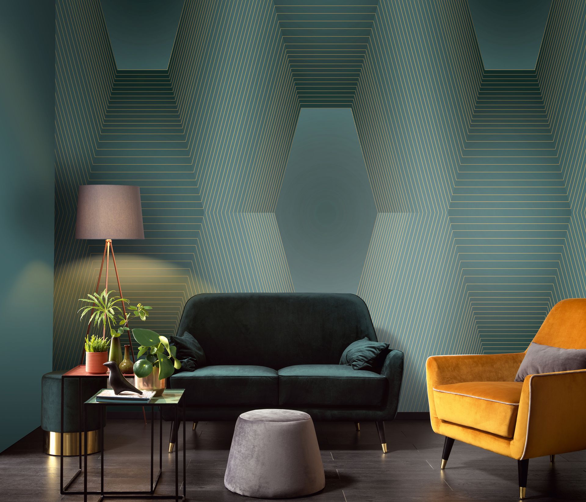 Diese geometrische Tapete aus der Art Edition von Erismann inszeniert eine faszinierende Symbiose aus klassischem Art-Déco-Stil und moderner Wandgestaltung. Gestufte, ineinander verschachtelte Sechsecke und Wellenformen erzeugen durch feine goldene Linien auf petrolblauem Grund eine beeindruckende dreidimensionale Tiefenwirkung. Die optische Täuschung verleiht Räumen Dynamik und Exklusivität.