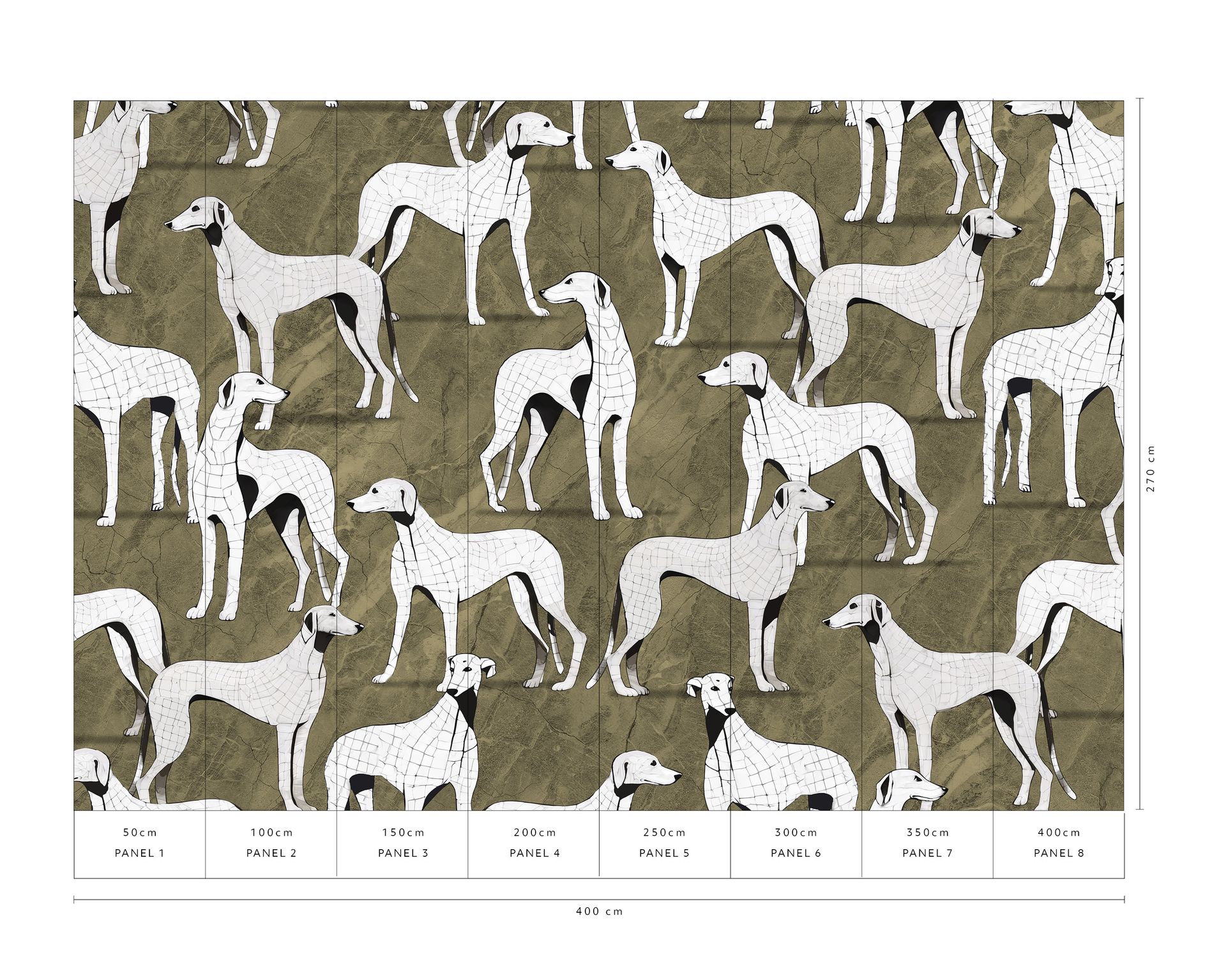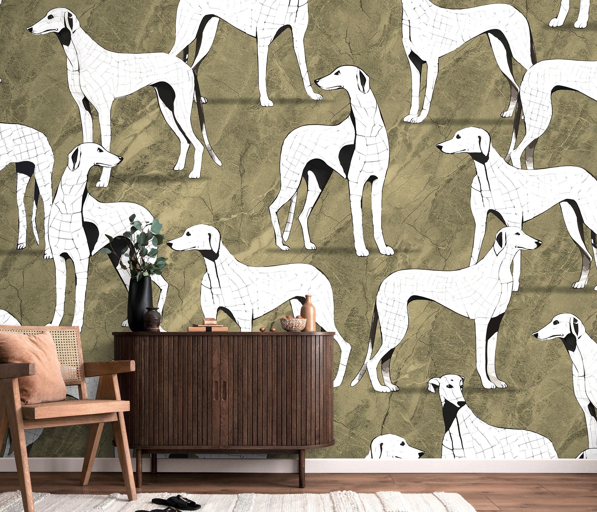 Künstlerische Windhund-Tapete in Olivgrün mit grafischen Hundemotiven