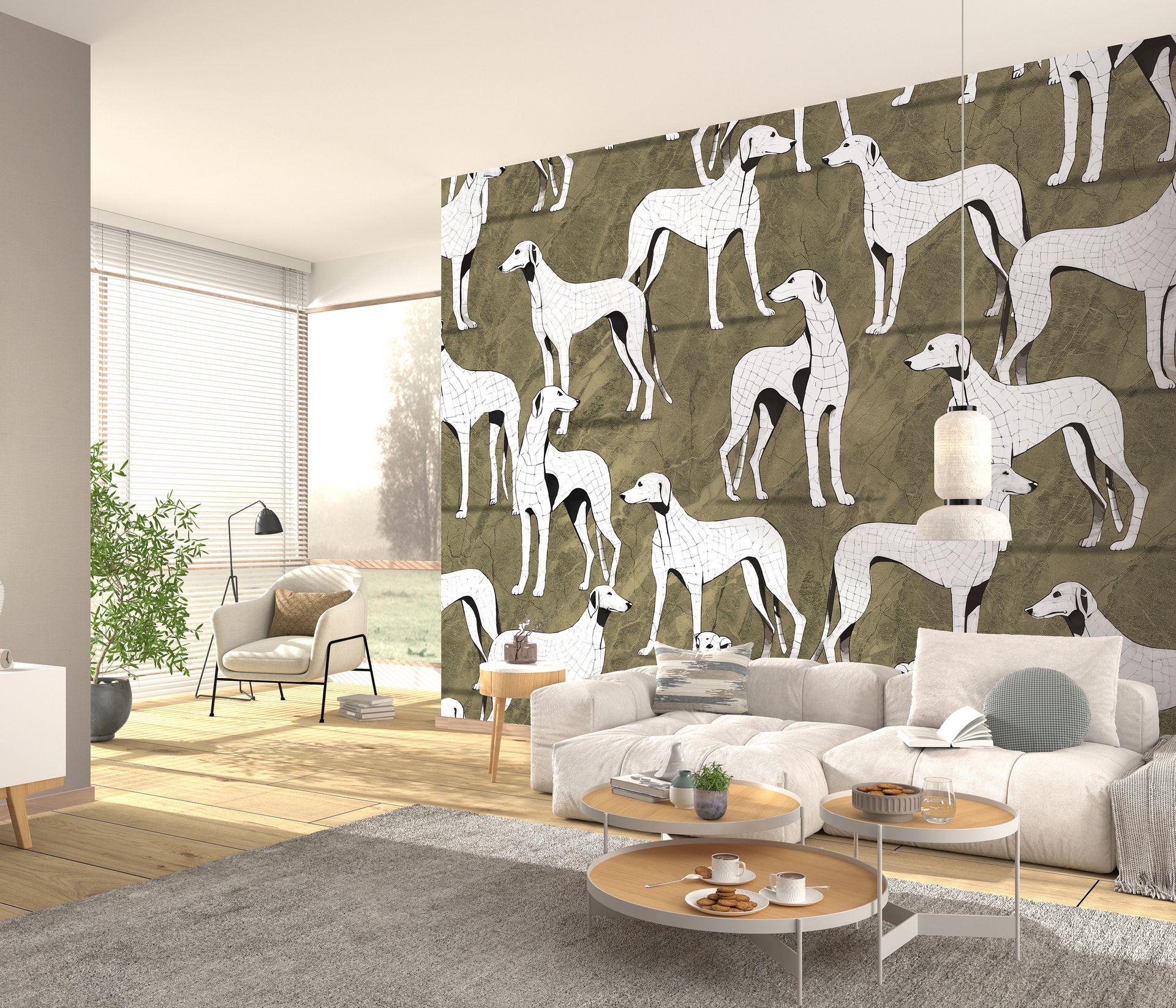 Diese außergewöhnliche Tapete präsentiert stilisierte Windhunde in künstlerischer Darstellung auf einem olivgrünen Hintergrund. Die weißen Hundefiguren mit schwarzen Akzenten zeigen ein feines Craquelé-Netzwerk und sind in verschiedenen Posen arrangiert, wodurch ein lebendiges Allover-Muster entsteht. Der strukturierte Hintergrund verleiht dem Design zusätzliche Tiefe.