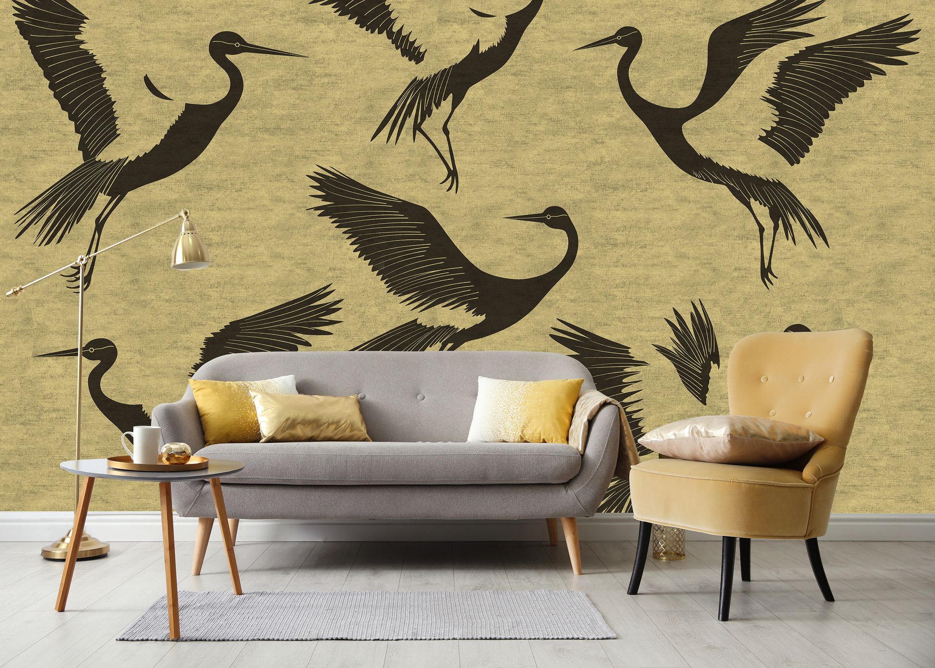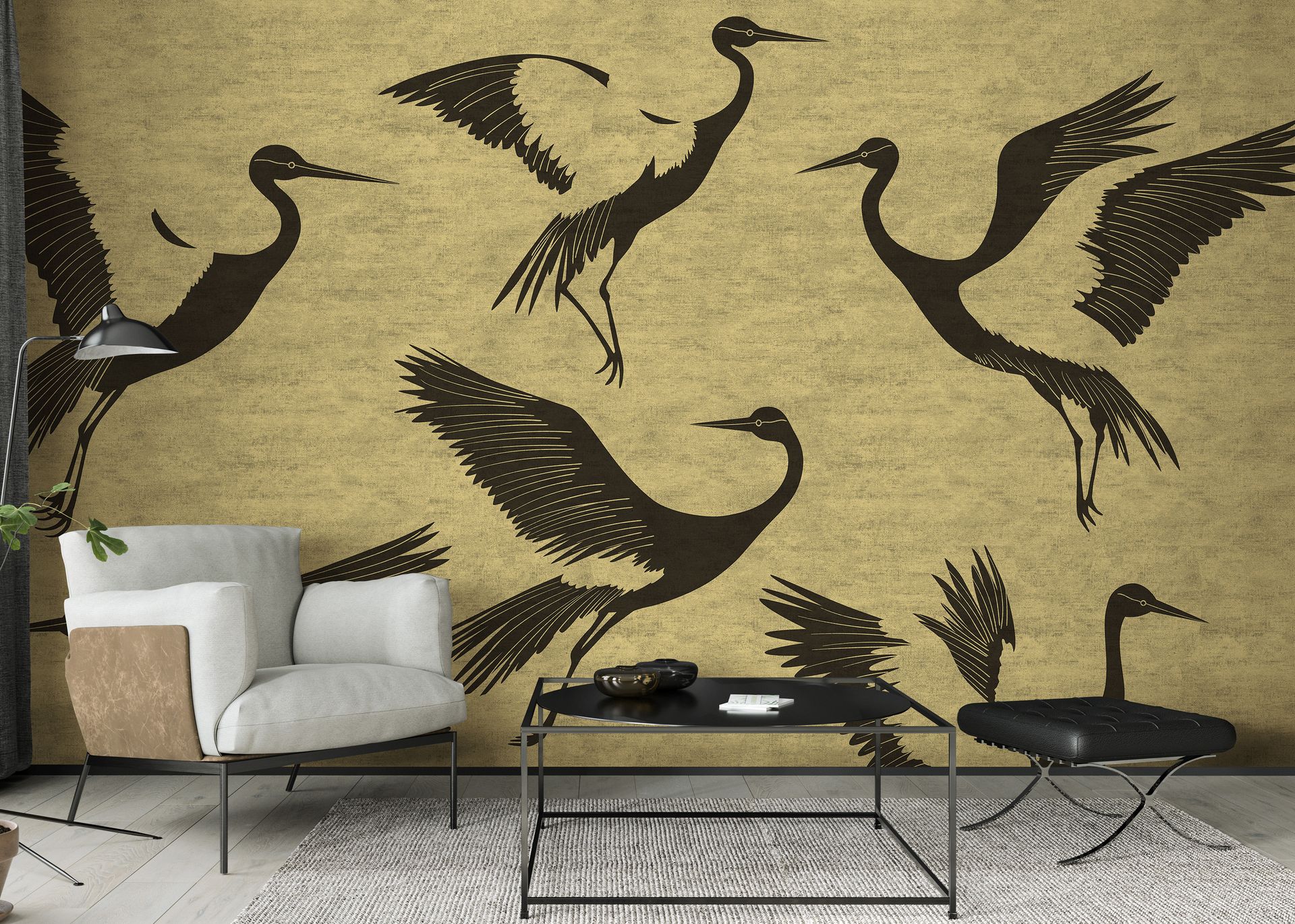Diese Tapete vereint zeitgenössische Eleganz mit asiatischer Ästhetik. Schwarze Kraniche in verschiedenen Flugpositionen mit ausgebreiteten Flügeln zieren einen warmtonigen olivgrünen Grund mit dezenter Leinenstruktur. Die detailliert gezeichneten Federn und die geschwungenen Linien der Vogelmotive verleihen dem Design eine natürliche Dynamik bei gleichzeitig ruhiger Gesamtwirkung.