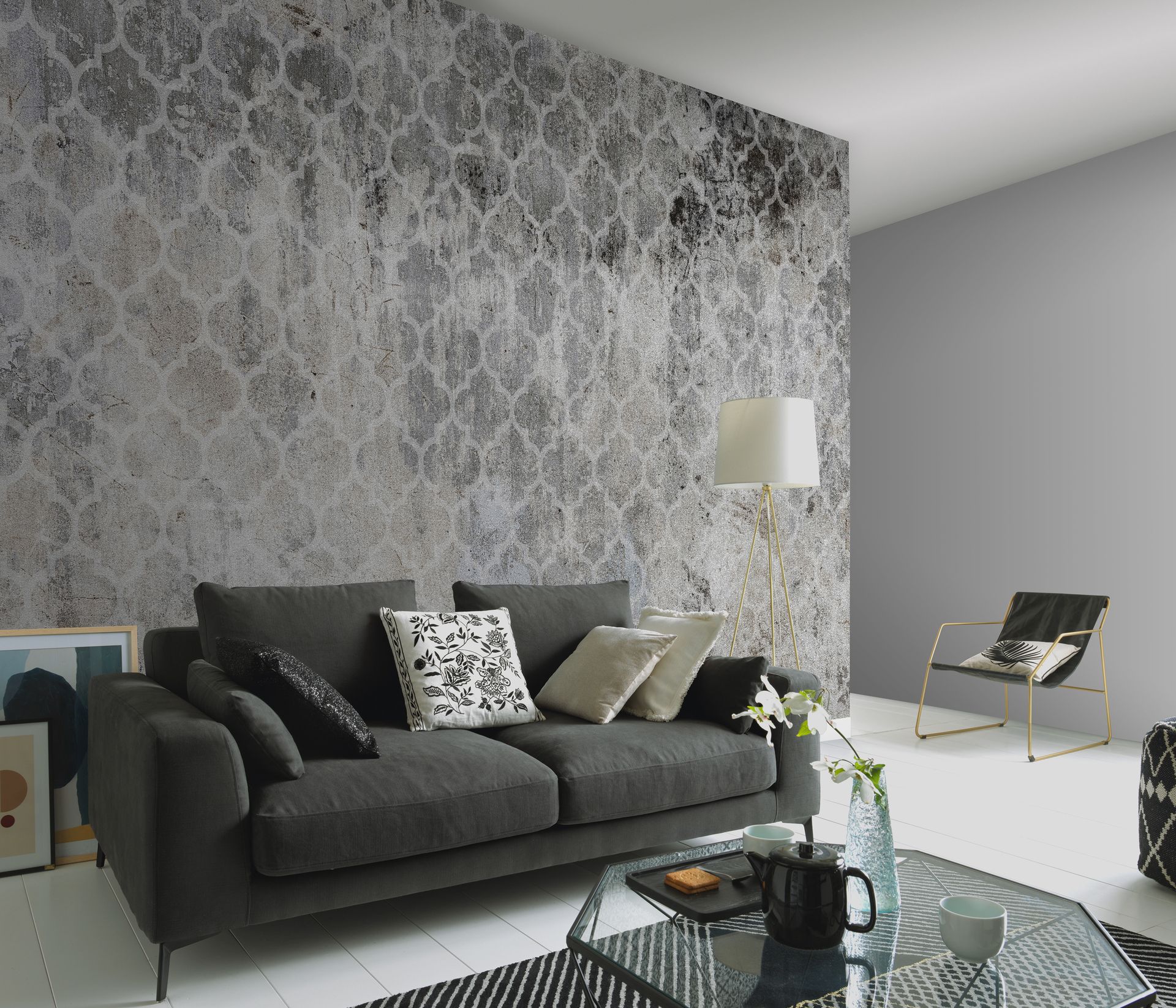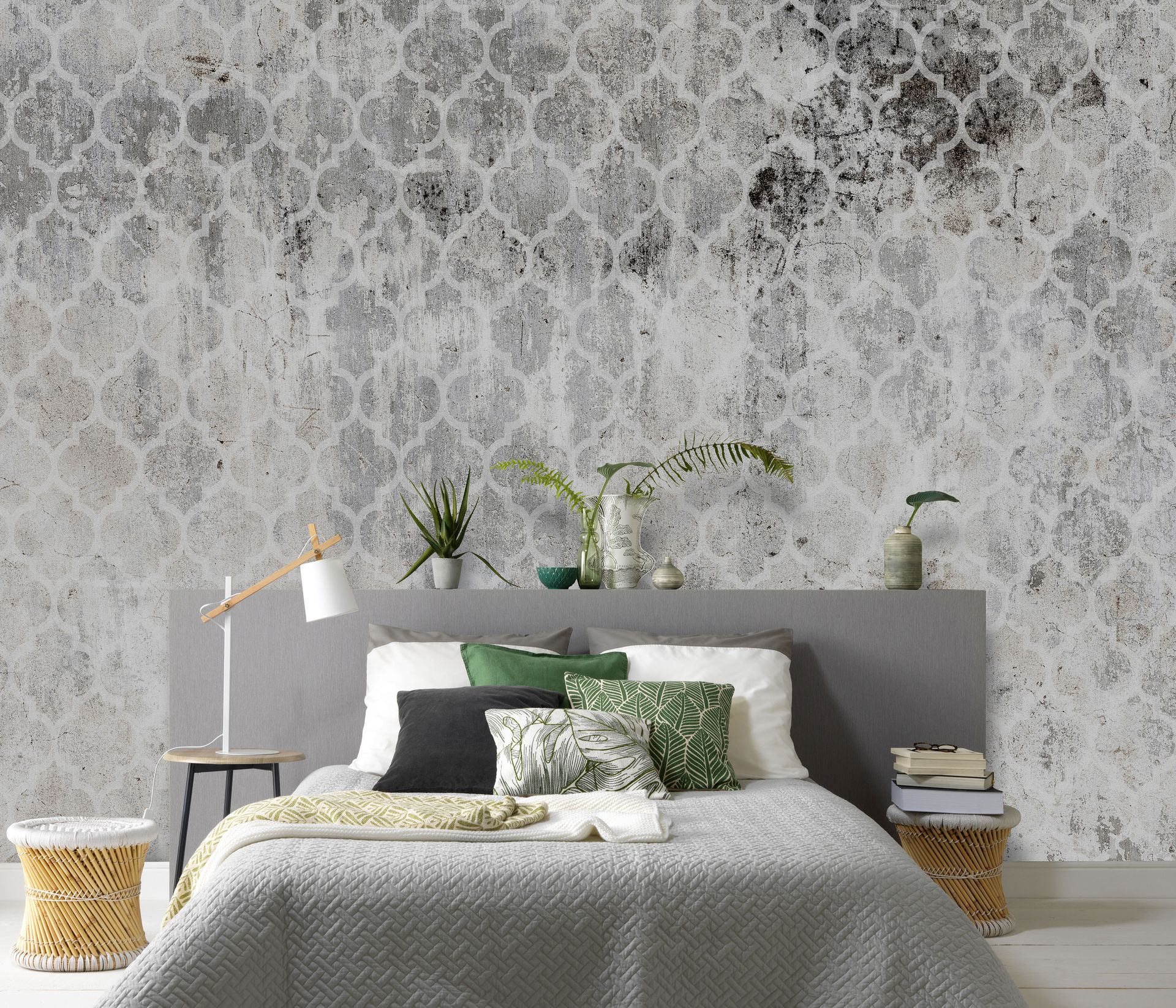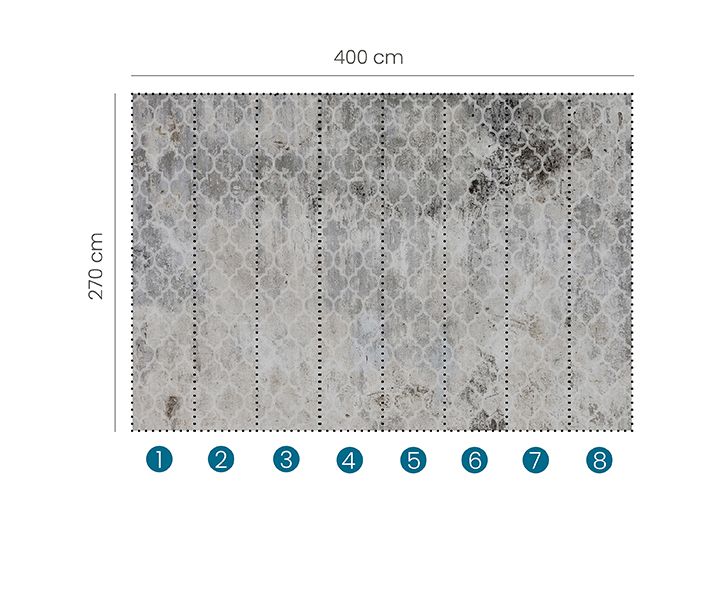 Diese Tapete vereint orientalische Ornamentik mit urbanem Industrial-Charakter. Das klassische marokkanische Gittermuster mit seinen charakteristischen Kleeblattformen erscheint auf einem Untergrund in Betonoptik mit authentischer Vintage-Patina und bewussten Gebrauchsspuren. Die gedämpfte Farbpalette aus Grau, Weiß und Beige-Nuancen verleiht dem Design eine beruhigende, zeitlose Ausstrahlung.
