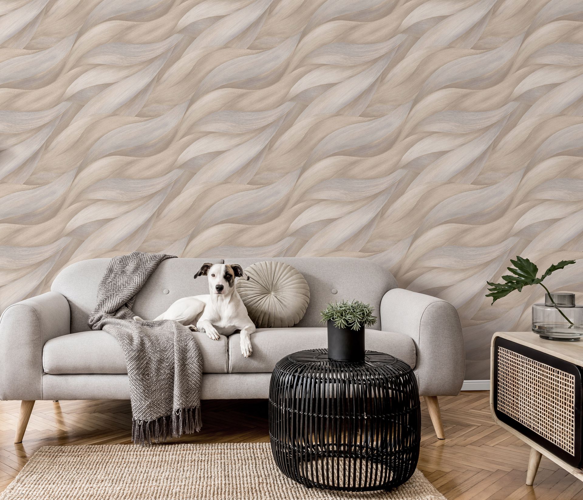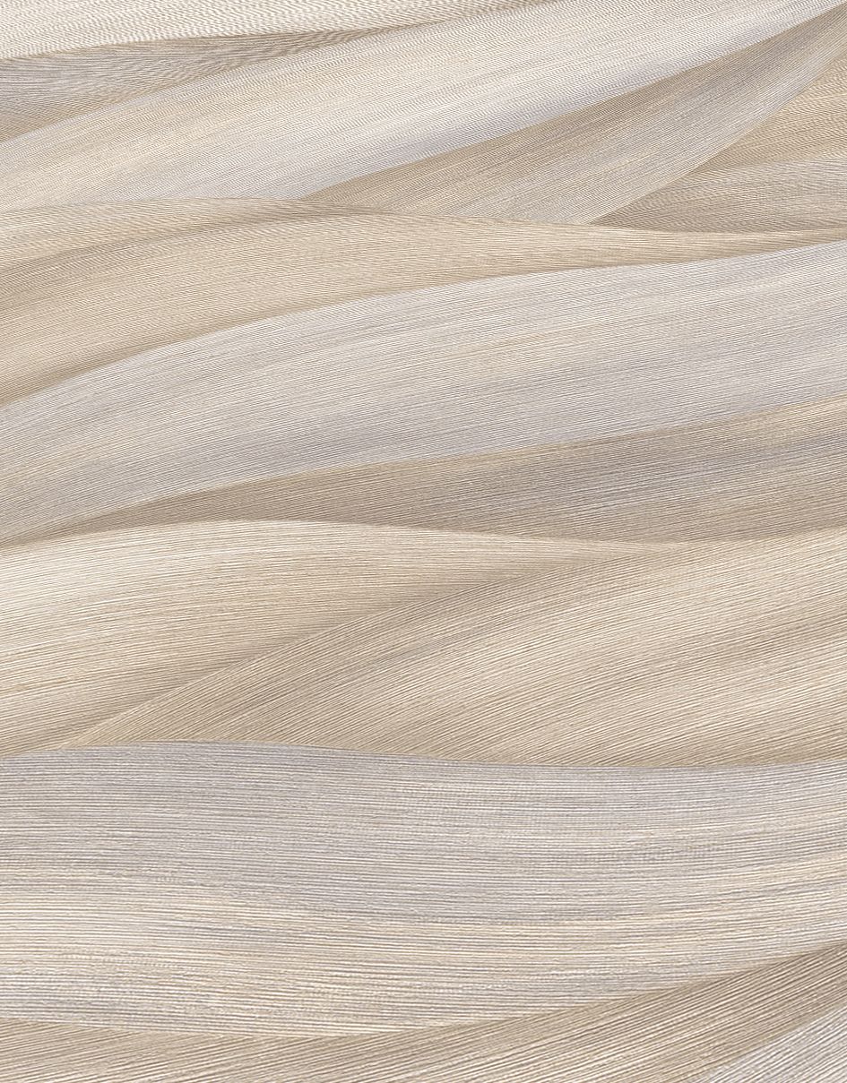 Die diagonal verlaufenden Wellenformen schaffen eine subtile Bewegung im Raum, ohne dabei unruhig zu wirken. Die helle Farbgebung und das niedrige Kontrastverhältnis wirken raumvergrößernd und schaffen eine beruhigende, entspannte Atmosphäre. Besonders gut kommt diese Tapete in Schlafzimmern, Wohnräumen oder Arbeitszimmern zur Geltung, wo sie eine natürliche Wohlfühlambiente schafft.