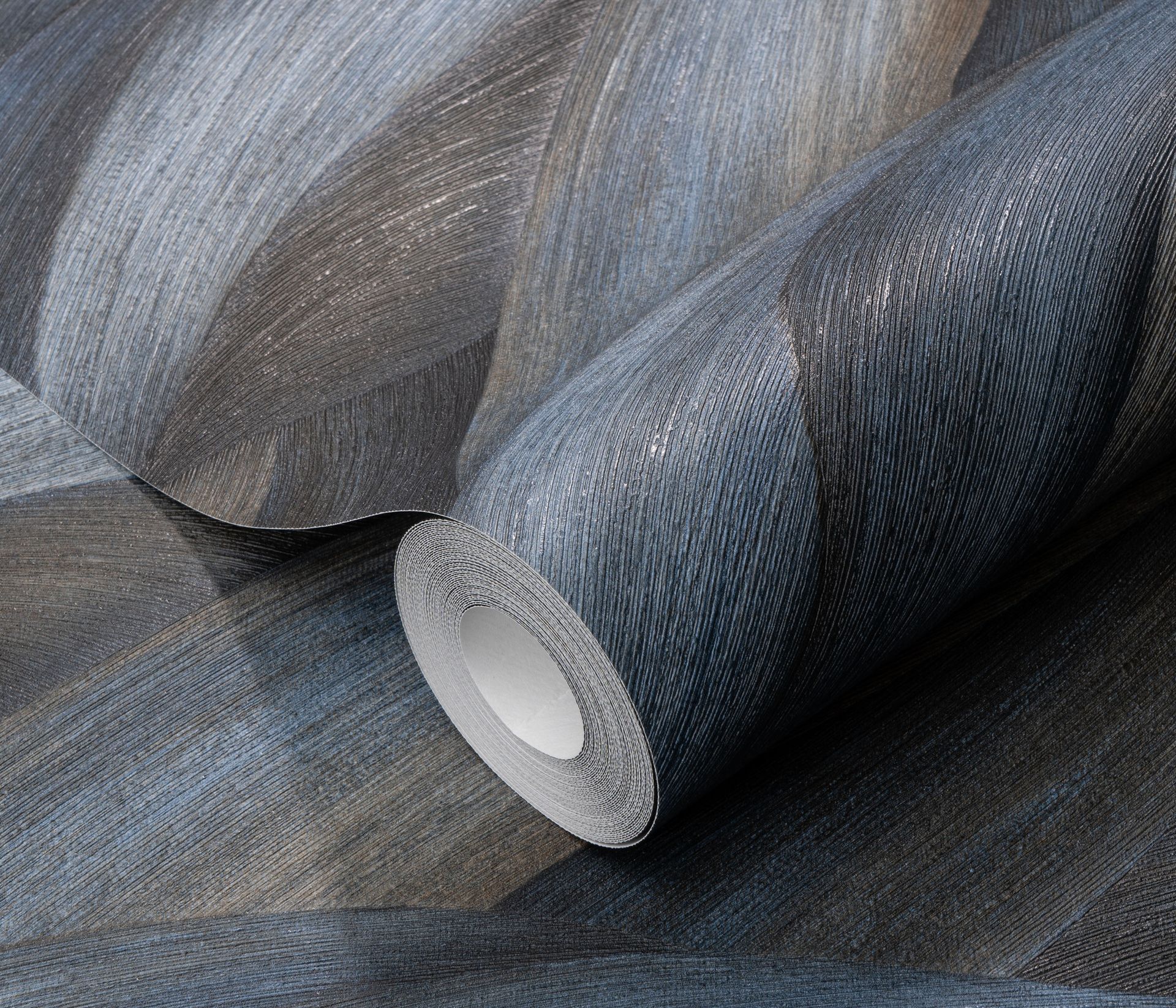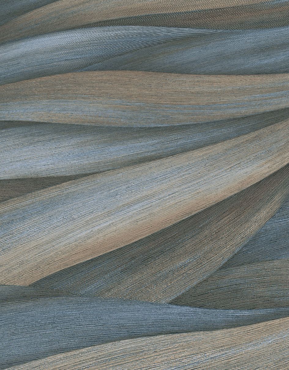 Diese moderne Tapete zeigt fließende, wellenartige Bänder in harmonisch abgestimmten Blaugrau- und Beigetönen. Die organischen Formen bewegen sich diagonal über die Fläche und gehen sanft ineinander über, während eine feine Linienstruktur für textile Anmutung sorgt. Das großflächige Muster verbindet abstrakte Gestaltung mit natürlicher Leichtigkeit.