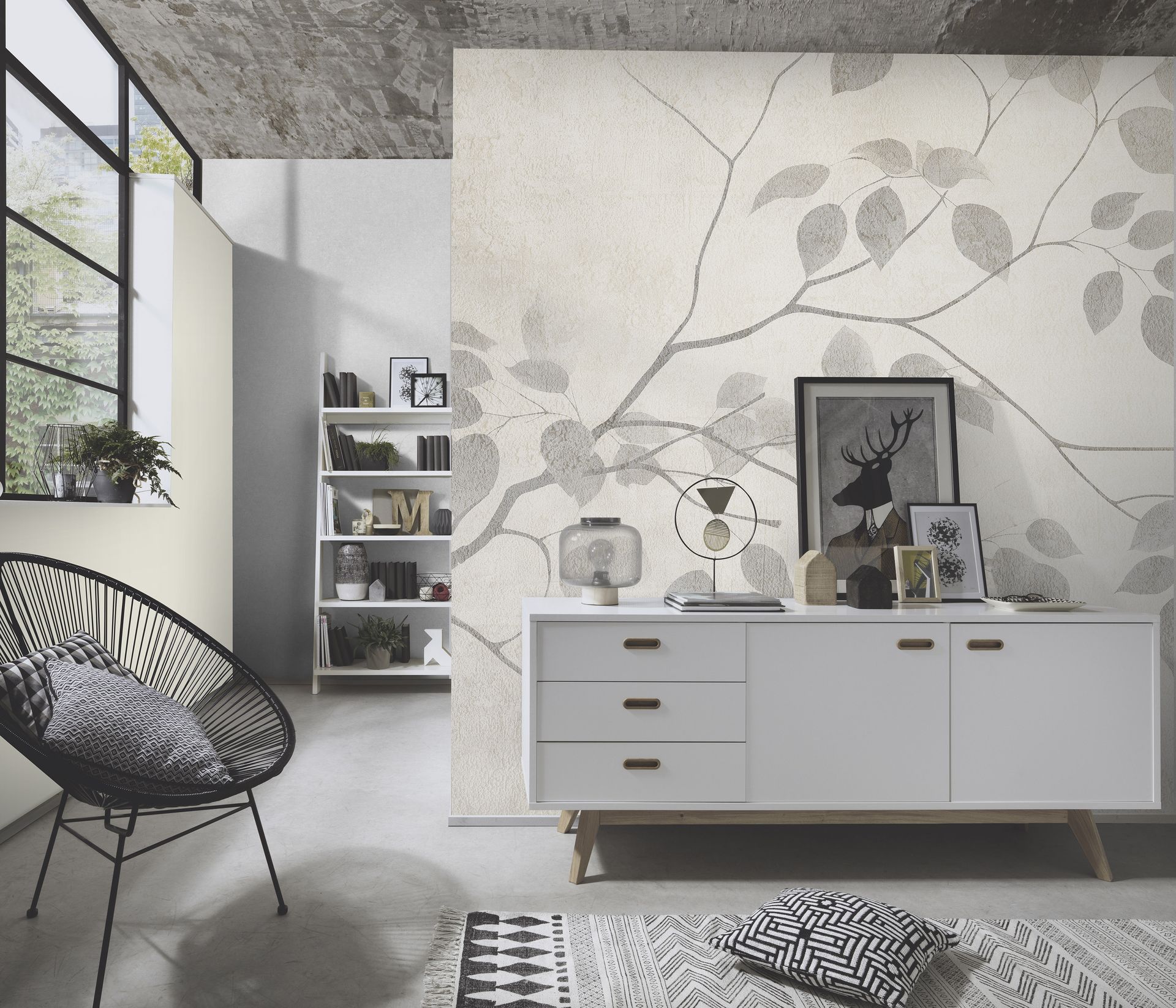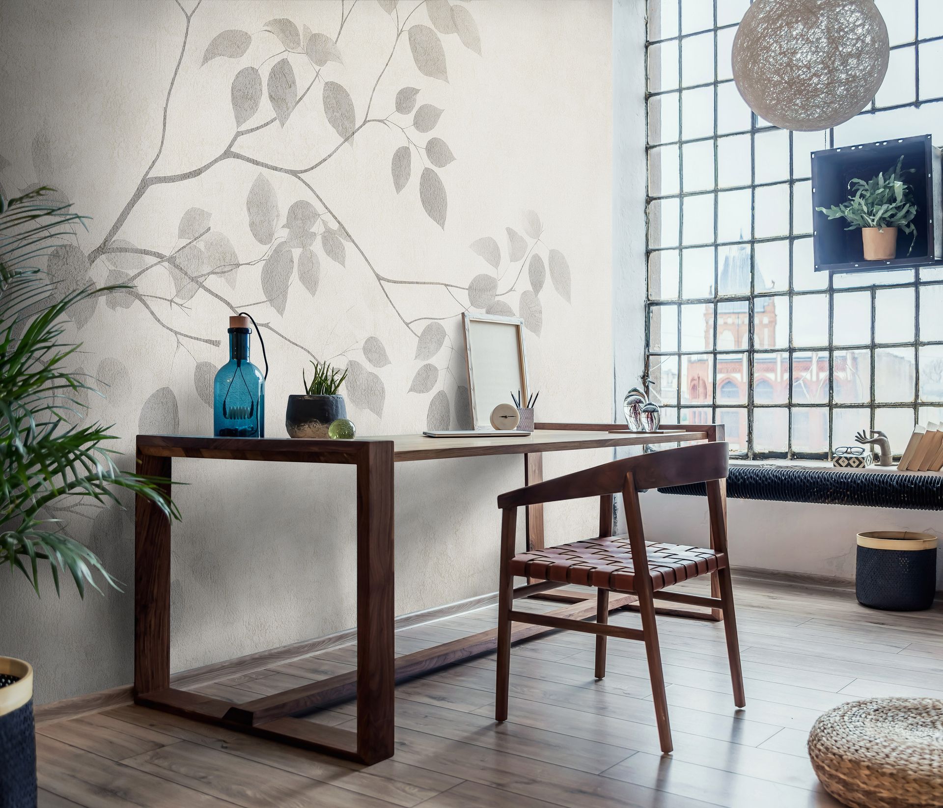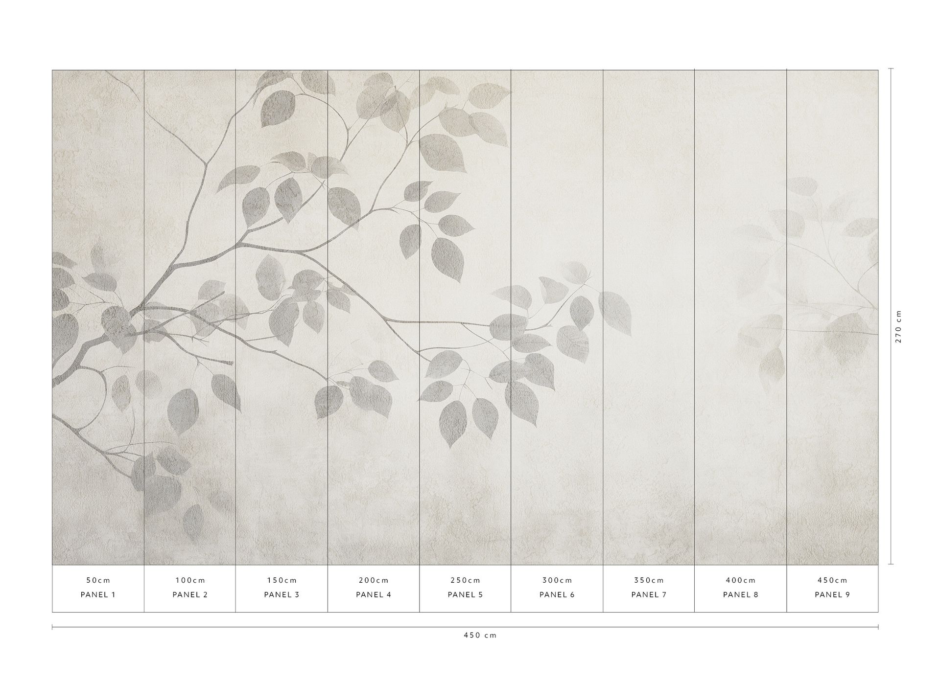 Die warme Farbgebung in Creme, Beige und verschiedenen Graunuancen sorgt für eine helle, freundliche Raumwirkung. Das diagonal verlaufende Blättermuster vergrößert optisch den Raum und eignet sich daher hervorragend für die Gestaltung ganzer Wände. Die matte Oberfläche mit leichter Strukturoptik unterstreicht den natürlichen Charakter des Designs und fügt sich harmonisch in moderne, naturnahe Wohnkonzepte ein.