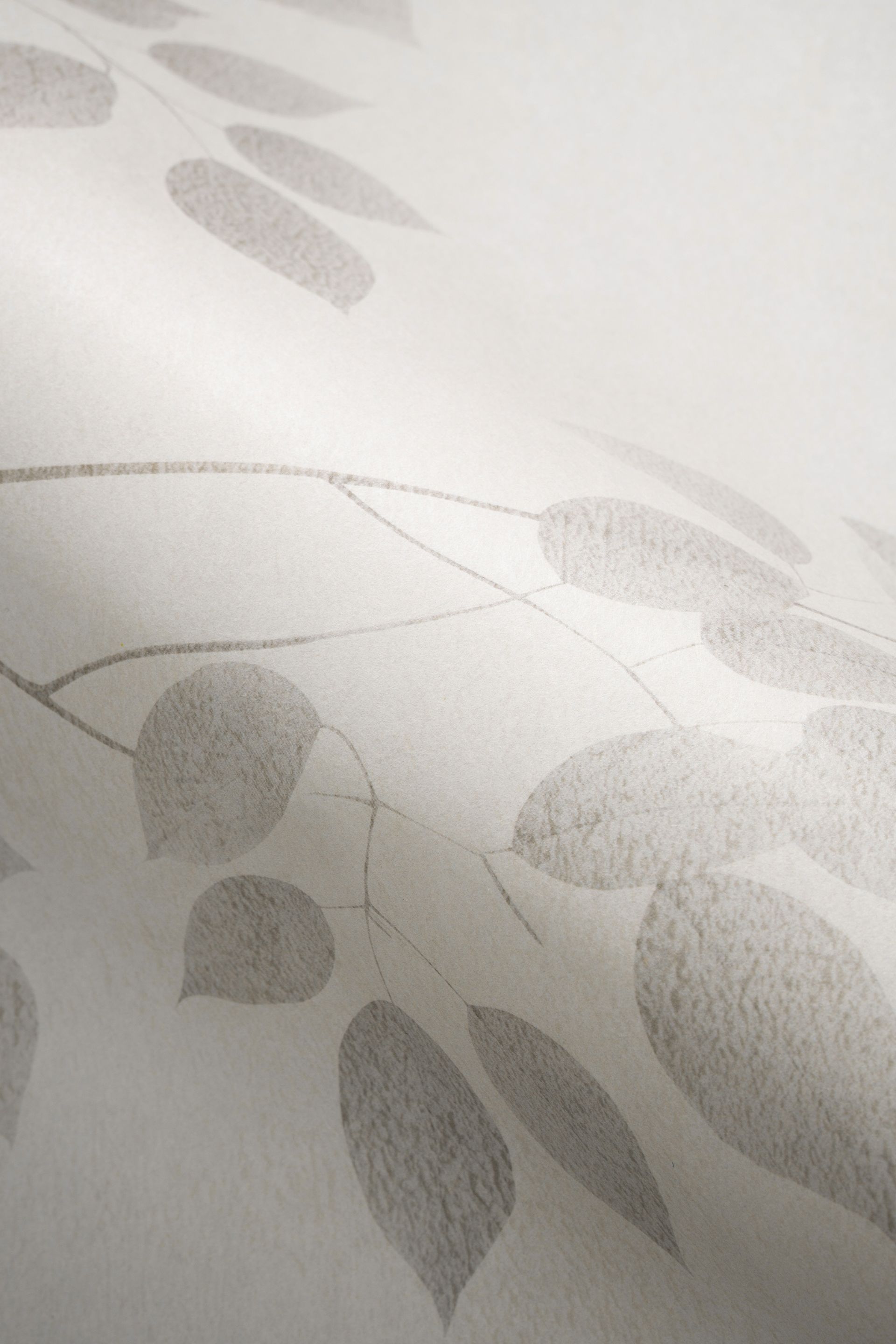 Diese naturorientierte Tapete zeigt filigrane Blätterzweige in sanften Beige- und Grautönen auf hellem Grund. Die organische Linienführung und die naturalistische Darstellung der Blätter schaffen eine beruhigende, zeitlose Atmosphäre. Einzelne Blätter treten klarer hervor, während andere in den Hintergrund zurückweichen – dieser Effekt verleiht der Tapete eine dezente räumliche Tiefe ohne aufdringlich zu wirken.
