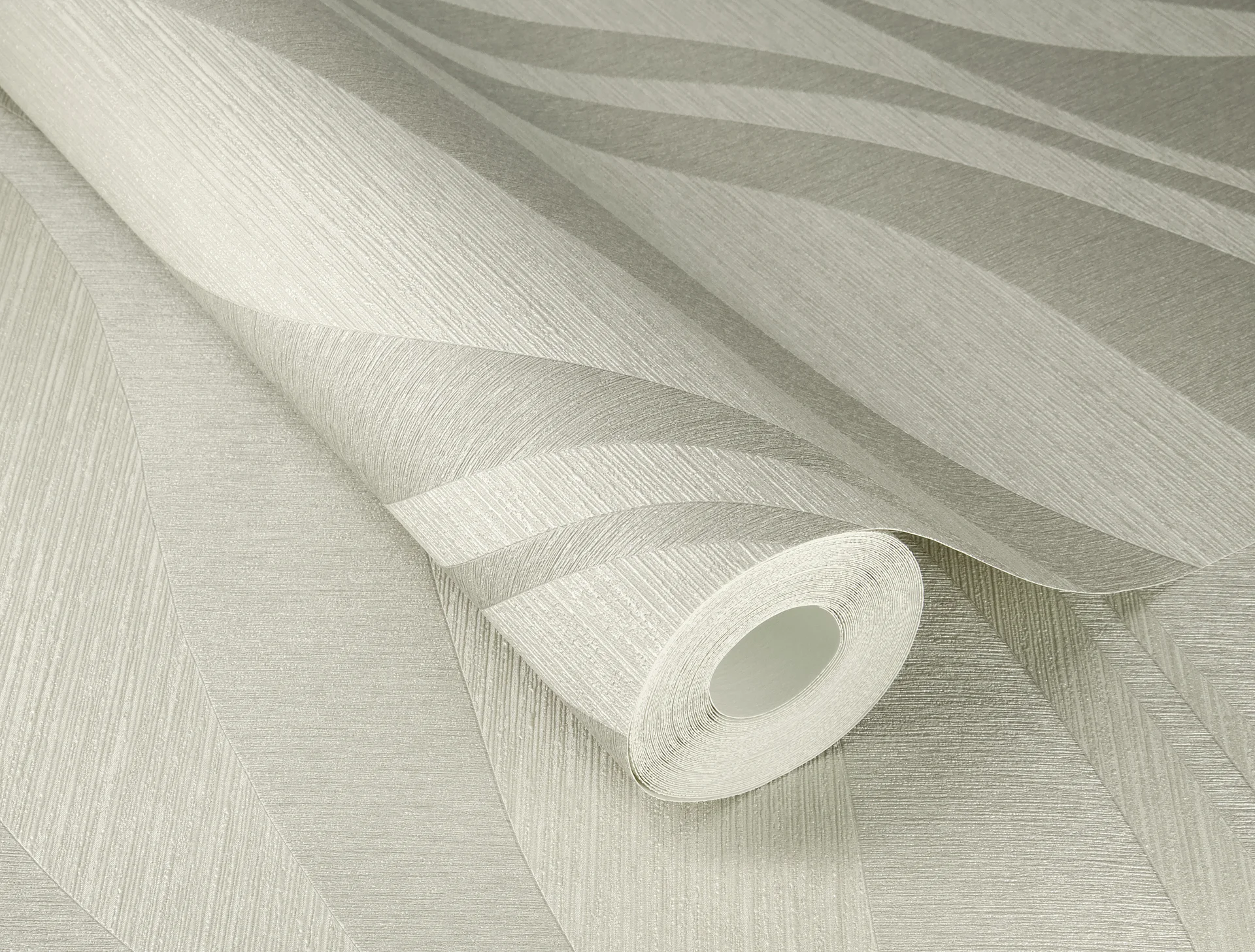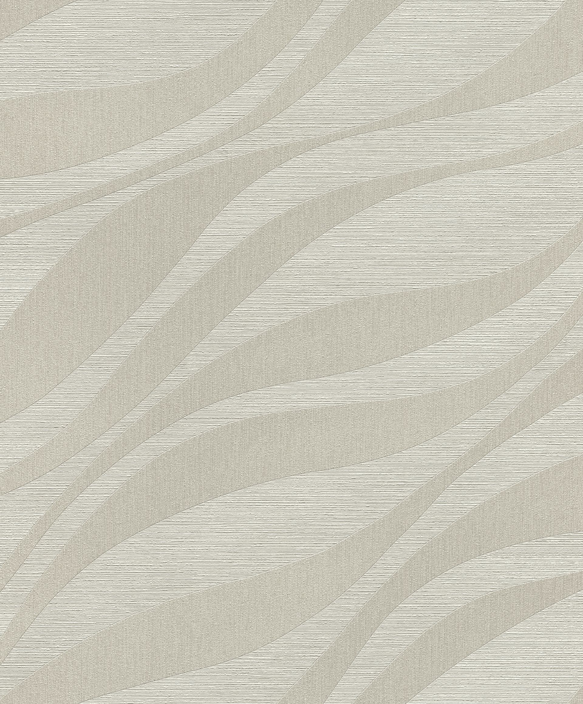 Diese geometrische Tapete besticht durch ihr elegantes Streifenmuster mit diagonaler Ausrichtung. Die dezente Farbkombination in Grau und Platingrau verleiht Räumen eine moderne, zeitlose Ausstrahlung mit subtiler Texturwirkung.