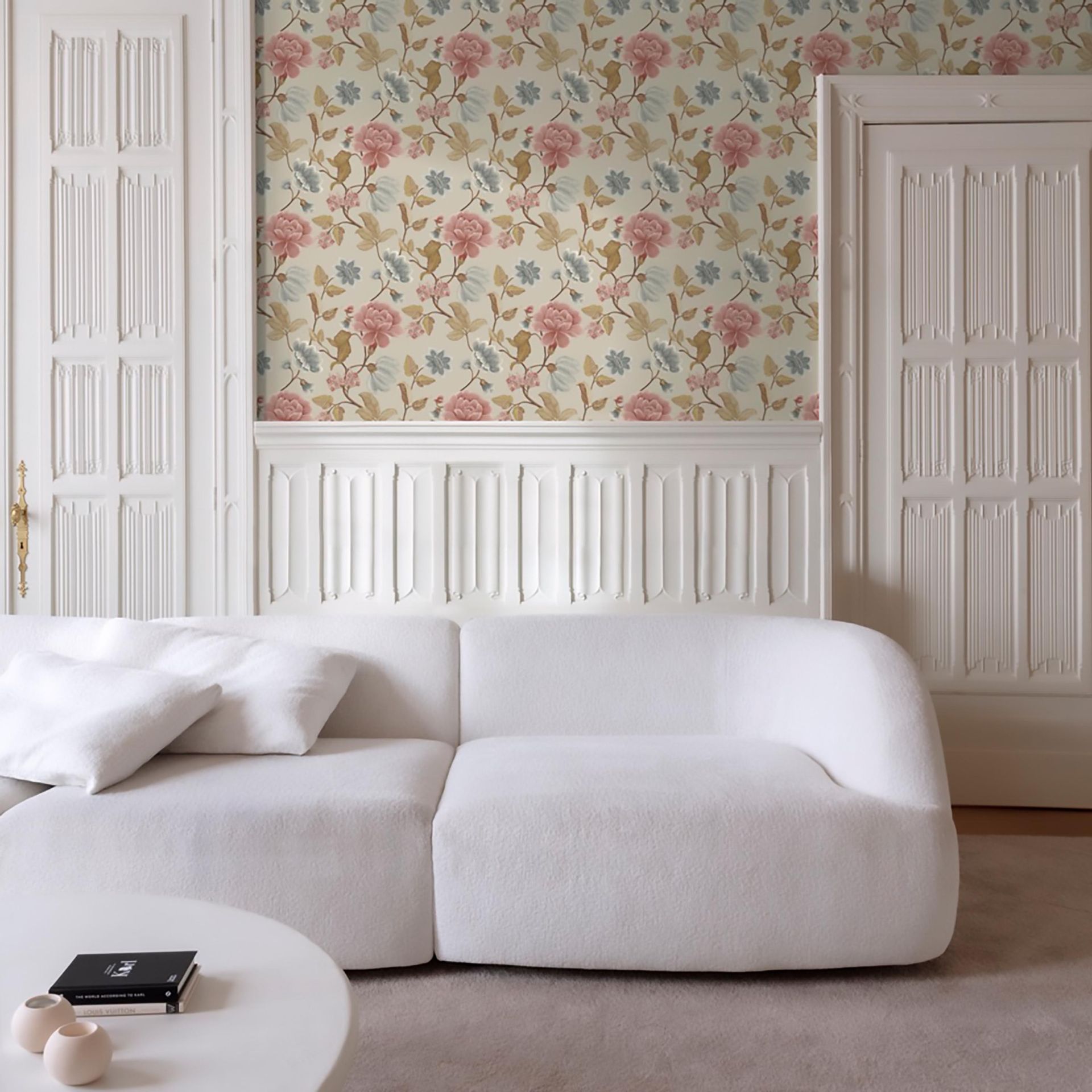Die Kombination aus großflächigen Blütenelementen und fein gezeichneten Blattlinien vermittelt Eleganz und Ruhe. Die Farbpalette aus natürlichen Pastelltönen mit Goldakzenten eignet sich hervorragend zur Schaffung eines gehobenen, beruhigenden Raumklimas. Das Design funktioniert sowohl als intensive Akzentwand als auch als großflächige Raumgestaltung und verleiht klassischen oder modernen Interieurs eine subtile botanische Note.
