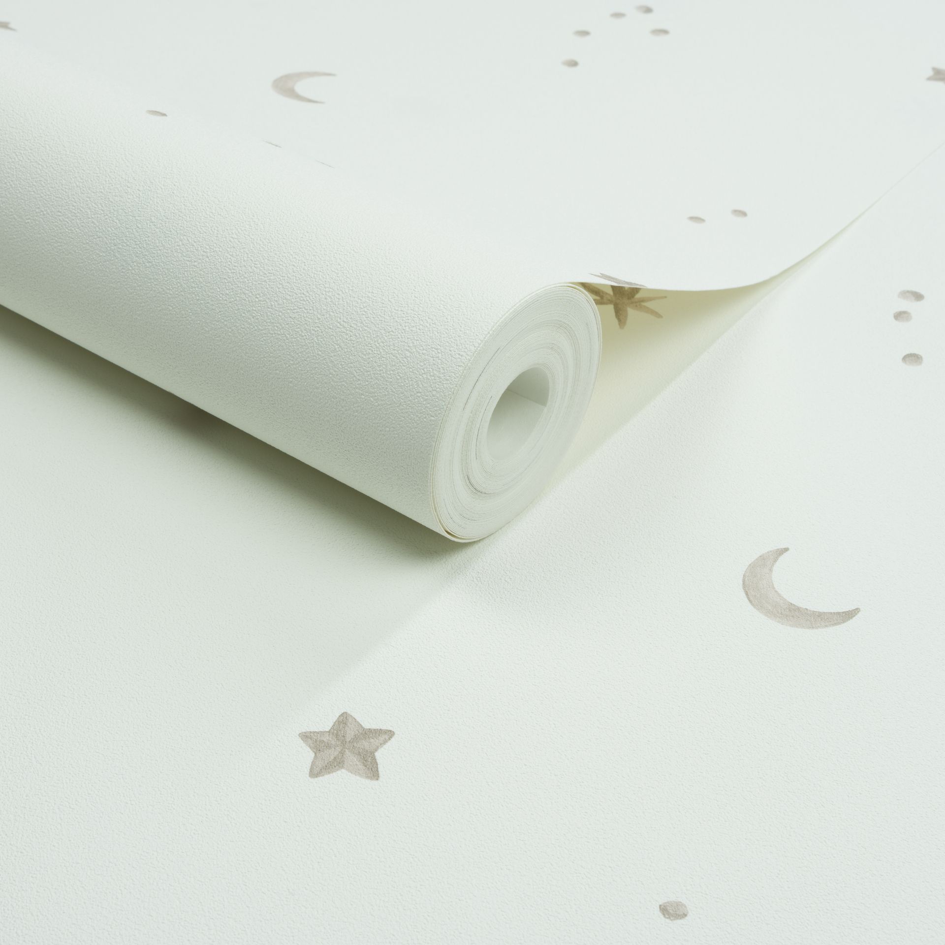 Das Muster besteht aus verschiedenen Sternformen – von fünfzackigen und sechszackigen Sternen bis hin zu kleinen Punktgruppen – die locker über die Fläche verteilt sind. Die neutrale, helle Farbgebung wirkt zeitlos elegant und lässt sich flexibel mit verschiedenen Einrichtungsstilen kombinieren. Die ruhige Gesamtwirkung macht diese Tapete ideal für den ganzen Raum, während die sanften Akzente für visuelle Interessantheit sorgen.